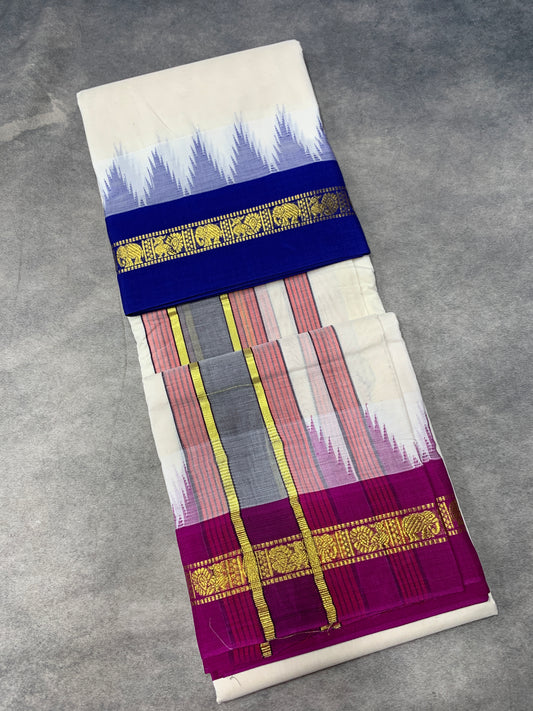 9X5 Korvai Cotton Dhoti Half White Colour with Blue and Pink Border