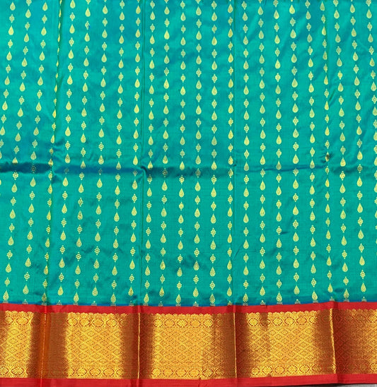 Pure Kanchipuram Silk Peacock Blue Colour with Red and Golden Zari Border