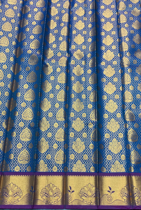 Blue Shade Pure kanchipuram Kids Pattu Pavadai with Contrast Border for Newborn to 2 Years