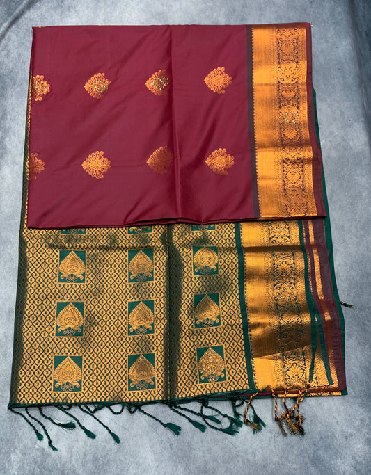 Soft Vegan Silk Saree Maroon Colour with Green and Copper Border