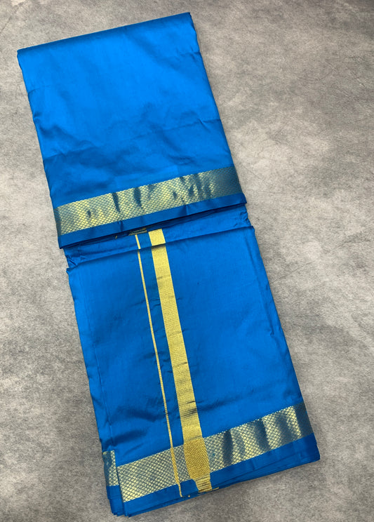 9X5 Pure Silk Dhoti Sky Blue with Golden Zari Border