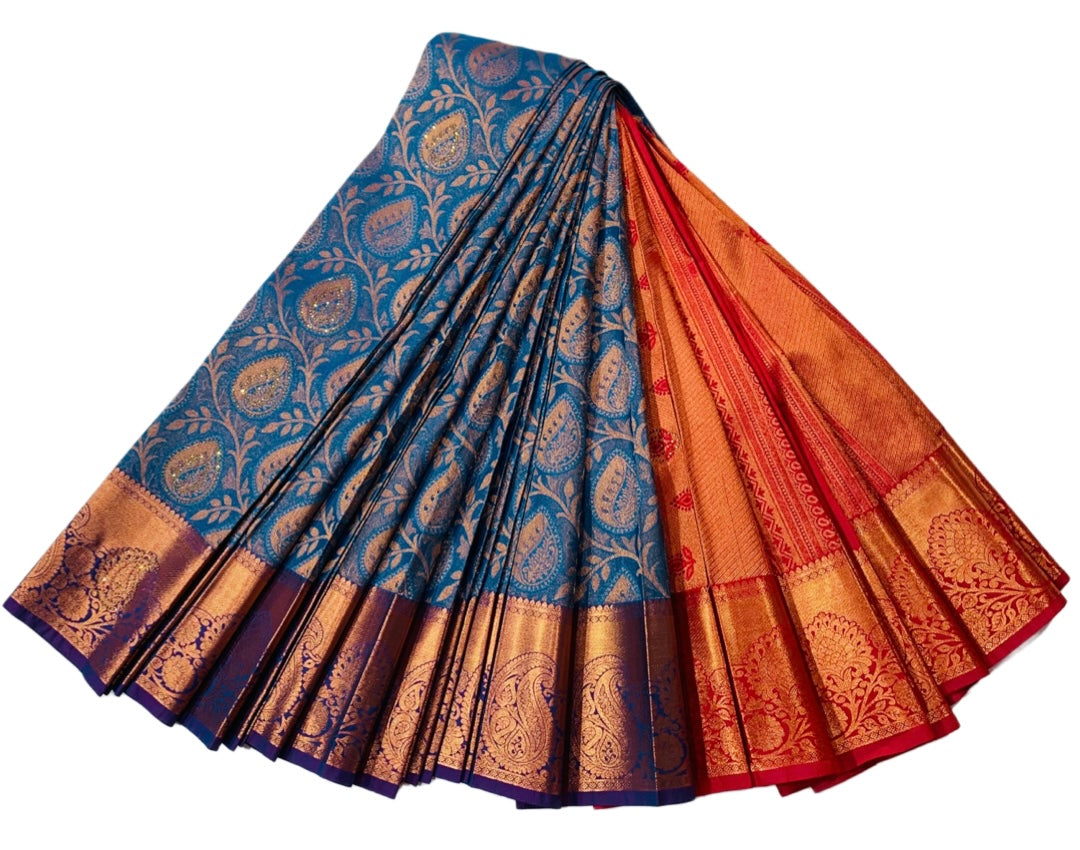 Discover the elegance of katan silk sarees. Handcrafted with exquisite designs and...