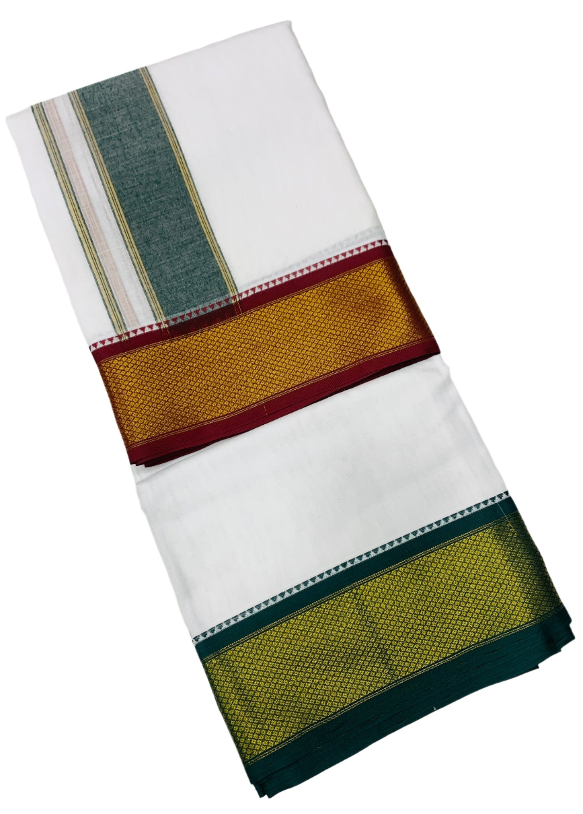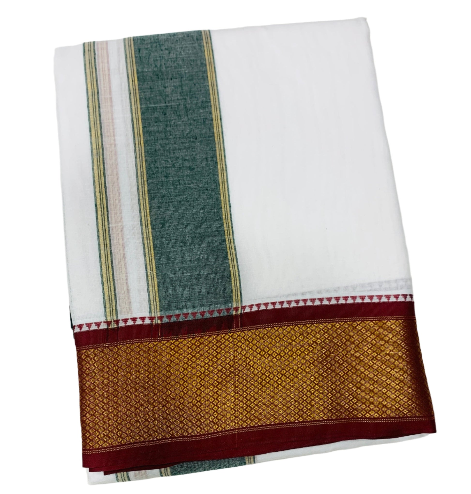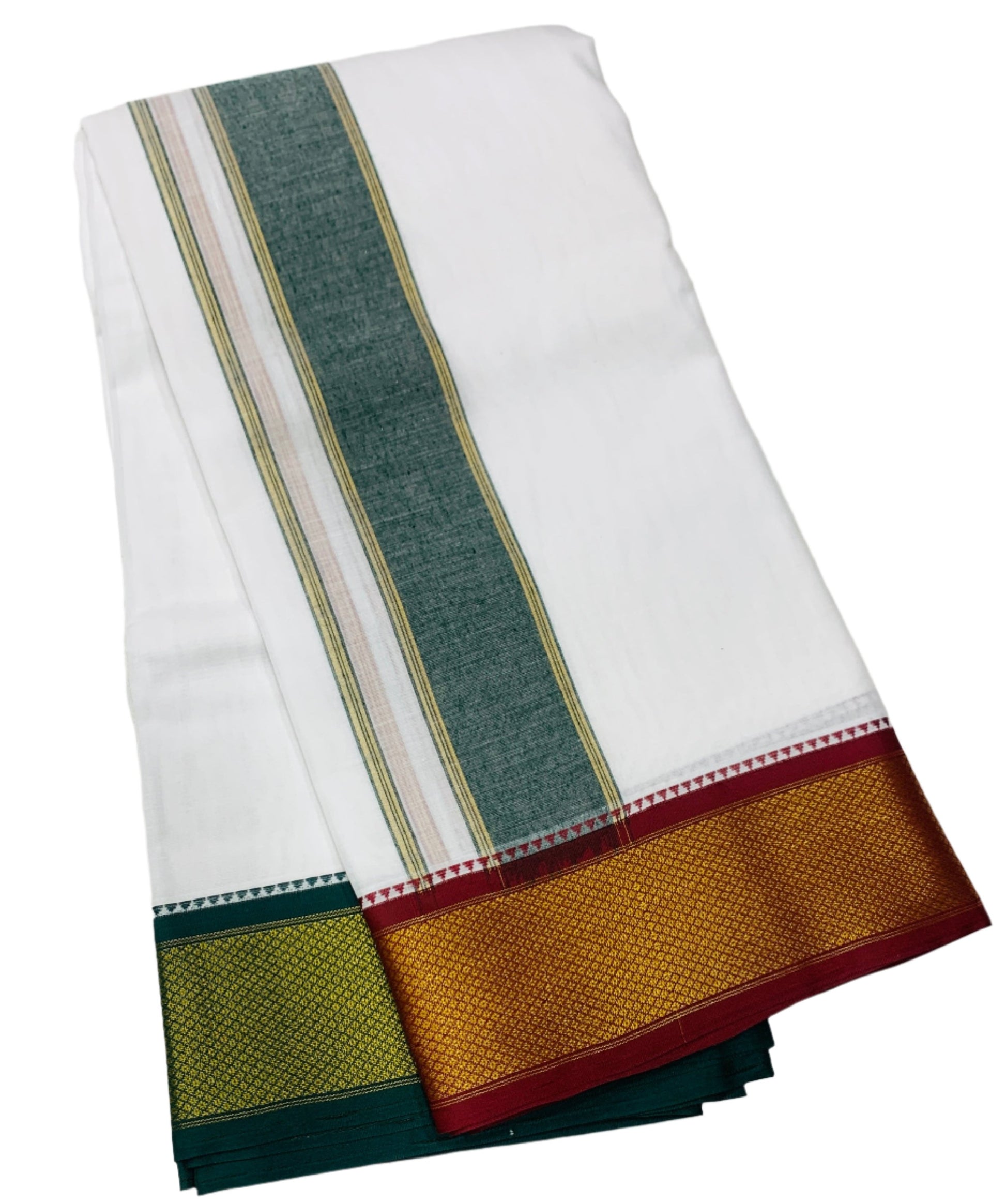 10X6 Cotton Dhoti White Colour with Large Maroon and Green Border