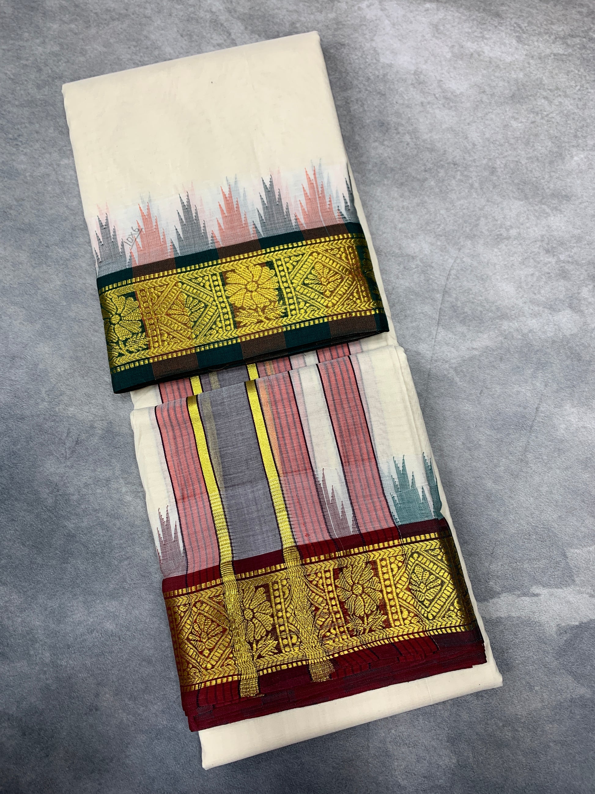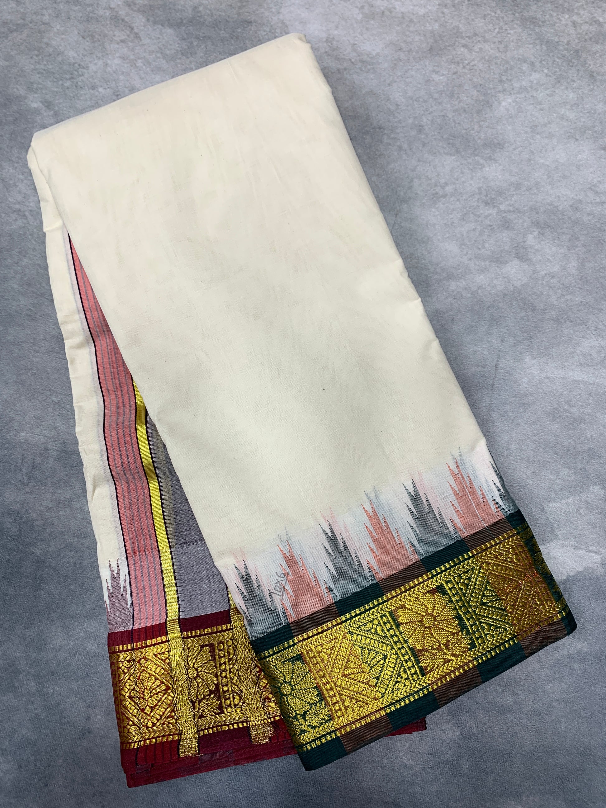 10x6 Korvai Cotton Dhoti Half White Colour with Green and Maroon Border