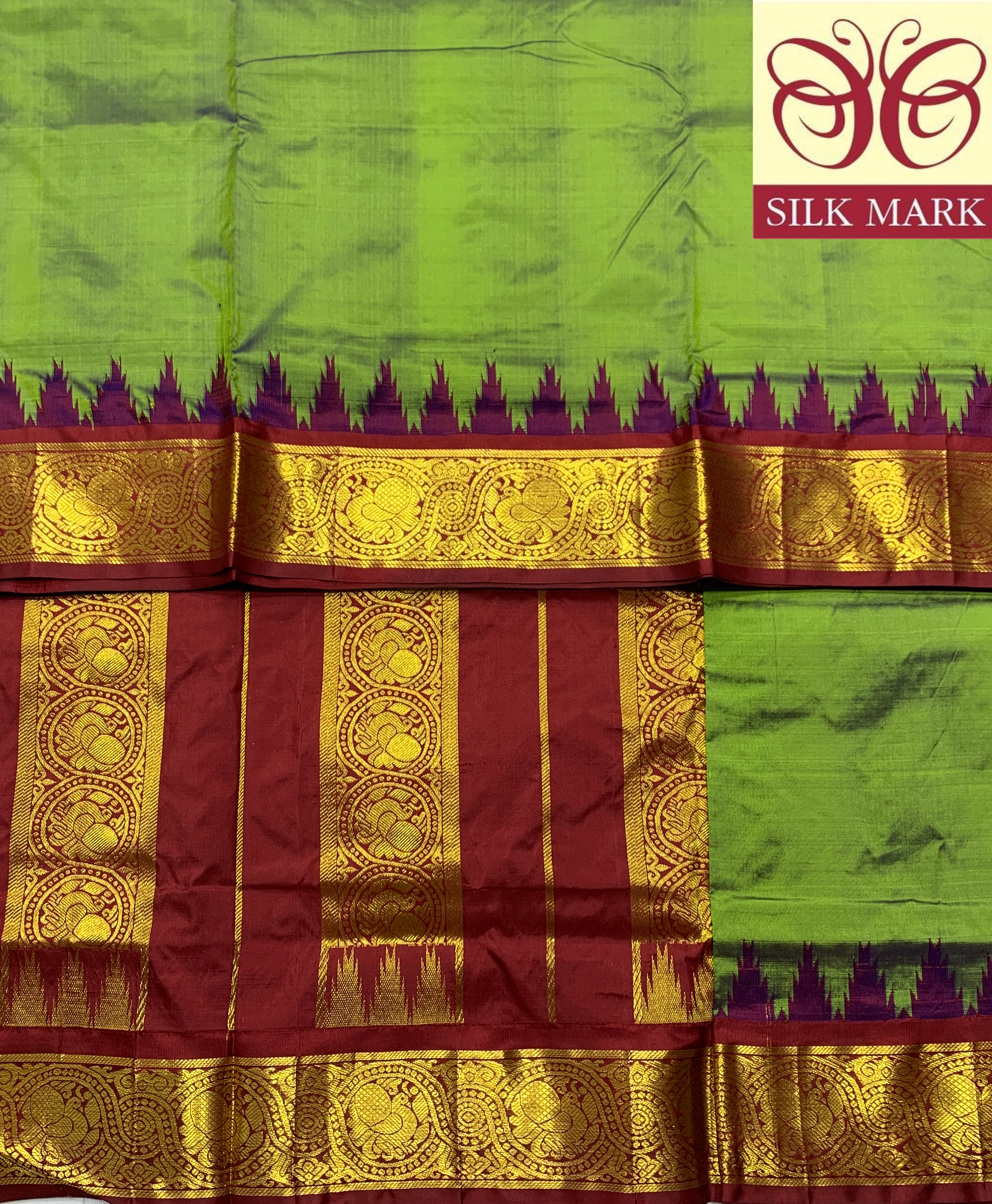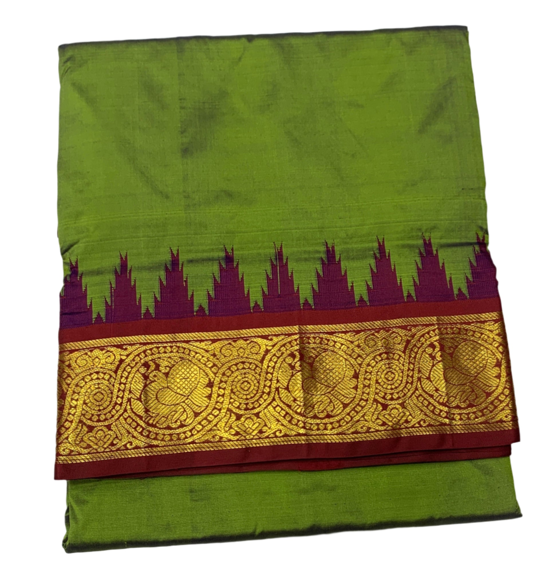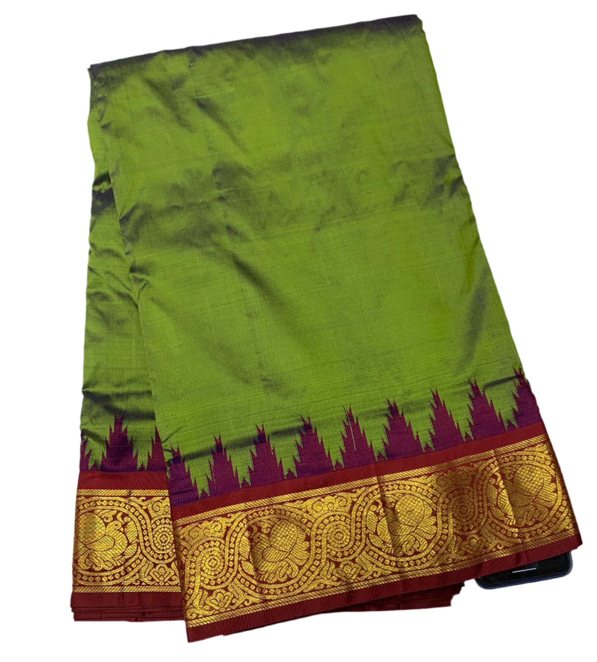 9 yards Pure Kanchipuram Silk Saree Olive Green Colour with Maroon and Gopuram Design Border.