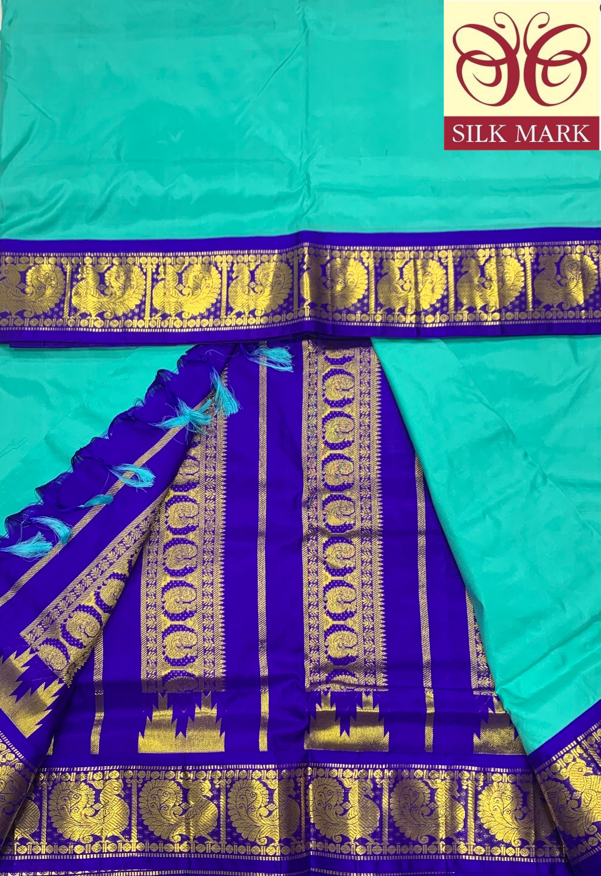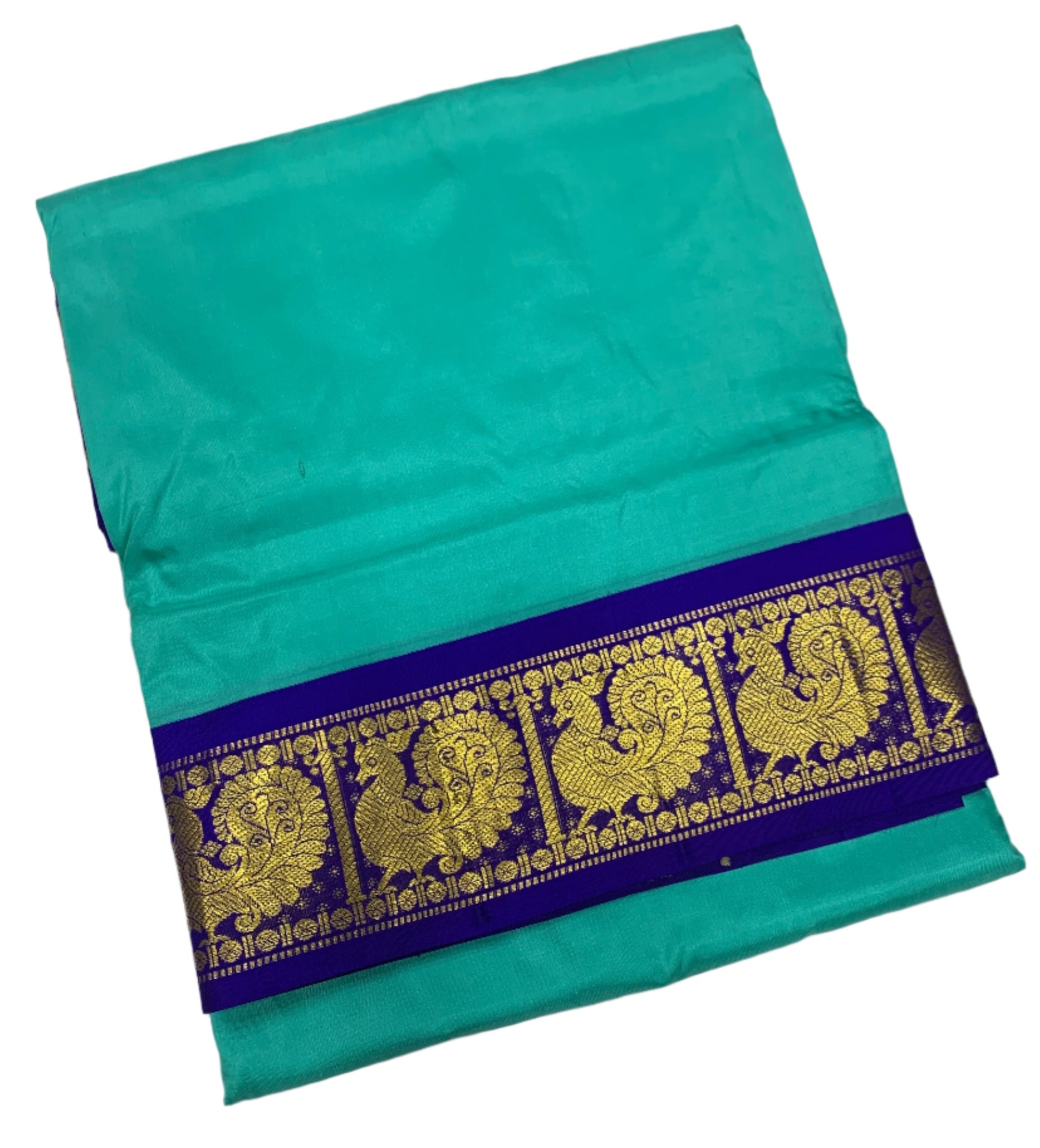 9 yards Pure kachipuram Silk saree Sapphire Colour with Blue and Peacock Design Border.