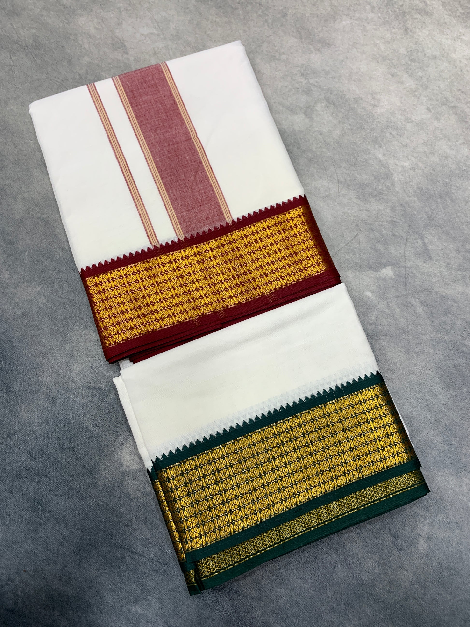 9X5 Cotton Dhoti White Big Green and Maroon Zari Border with Angavastram