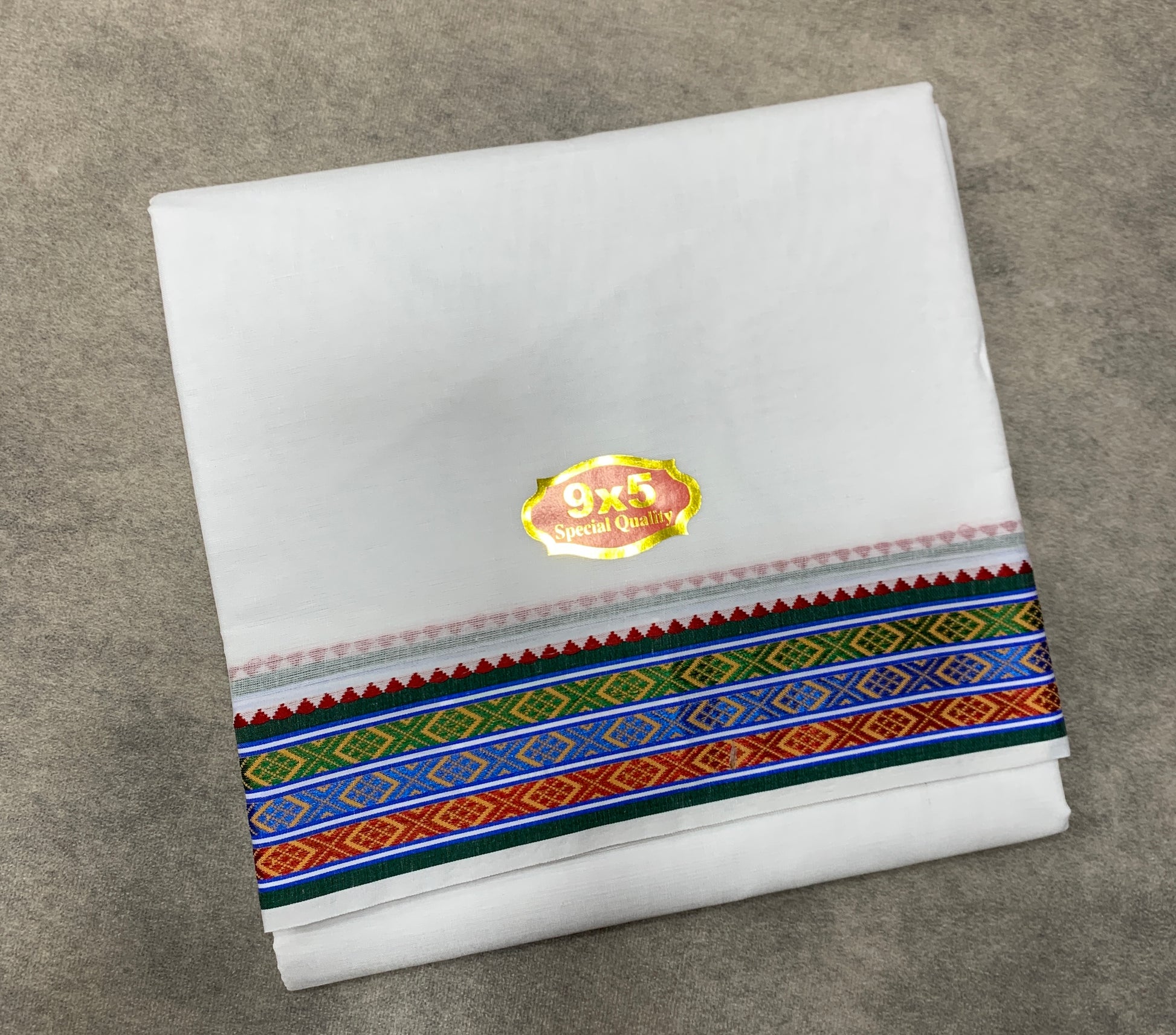 9X5 Cotton Dhoti White Colour with Blue and Green, Red Border with Angavastarm.