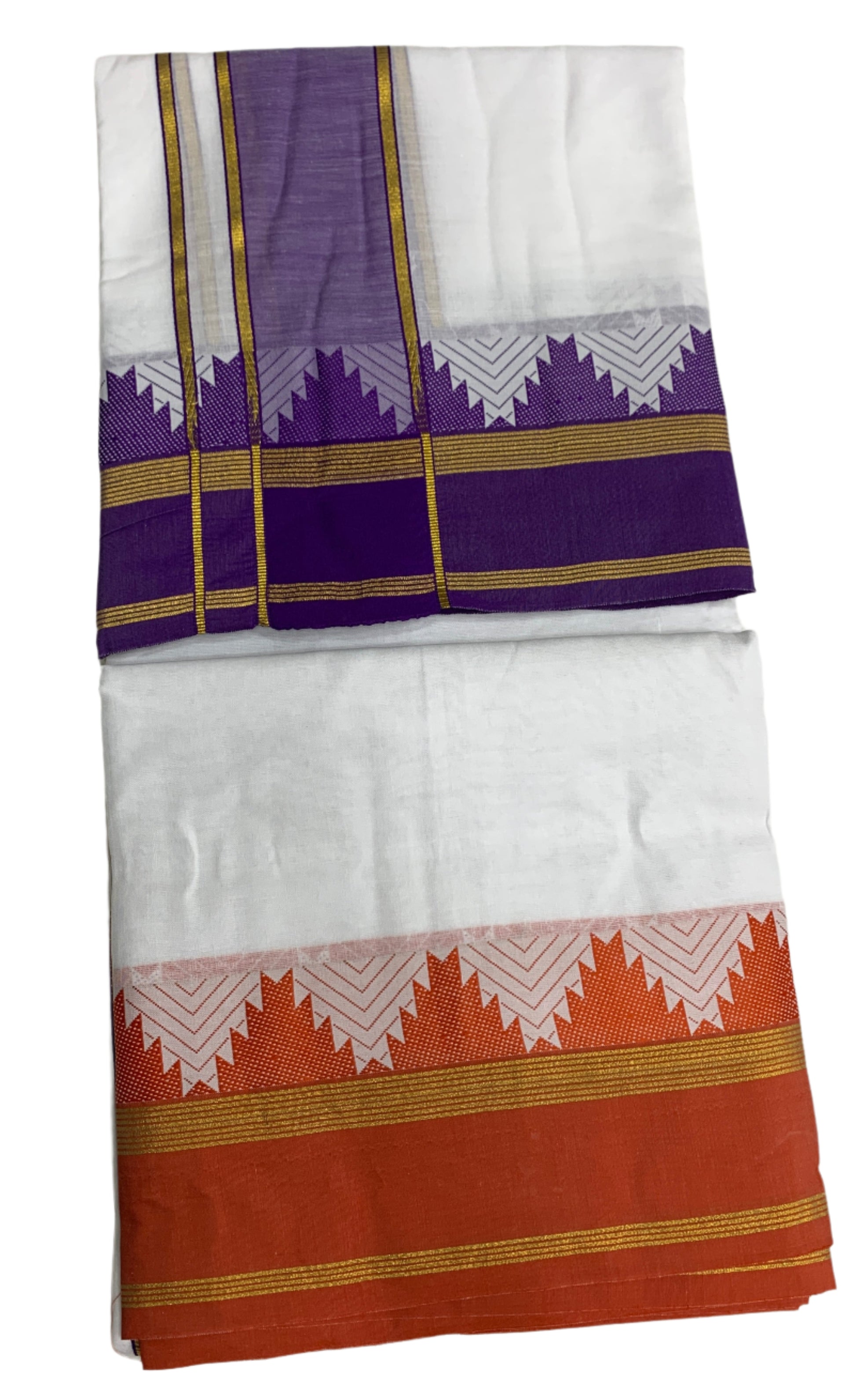 9X5 Cotton Dhoti White Violet and Orange Border with Angavastram