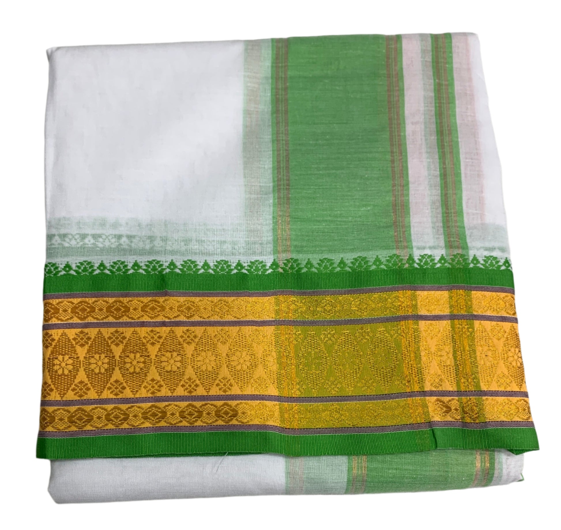 9X5 Cotton Dhoti White Yellow and Light Green Border with Angavastram