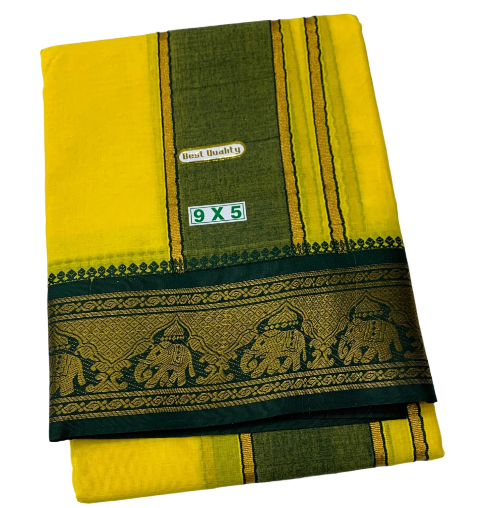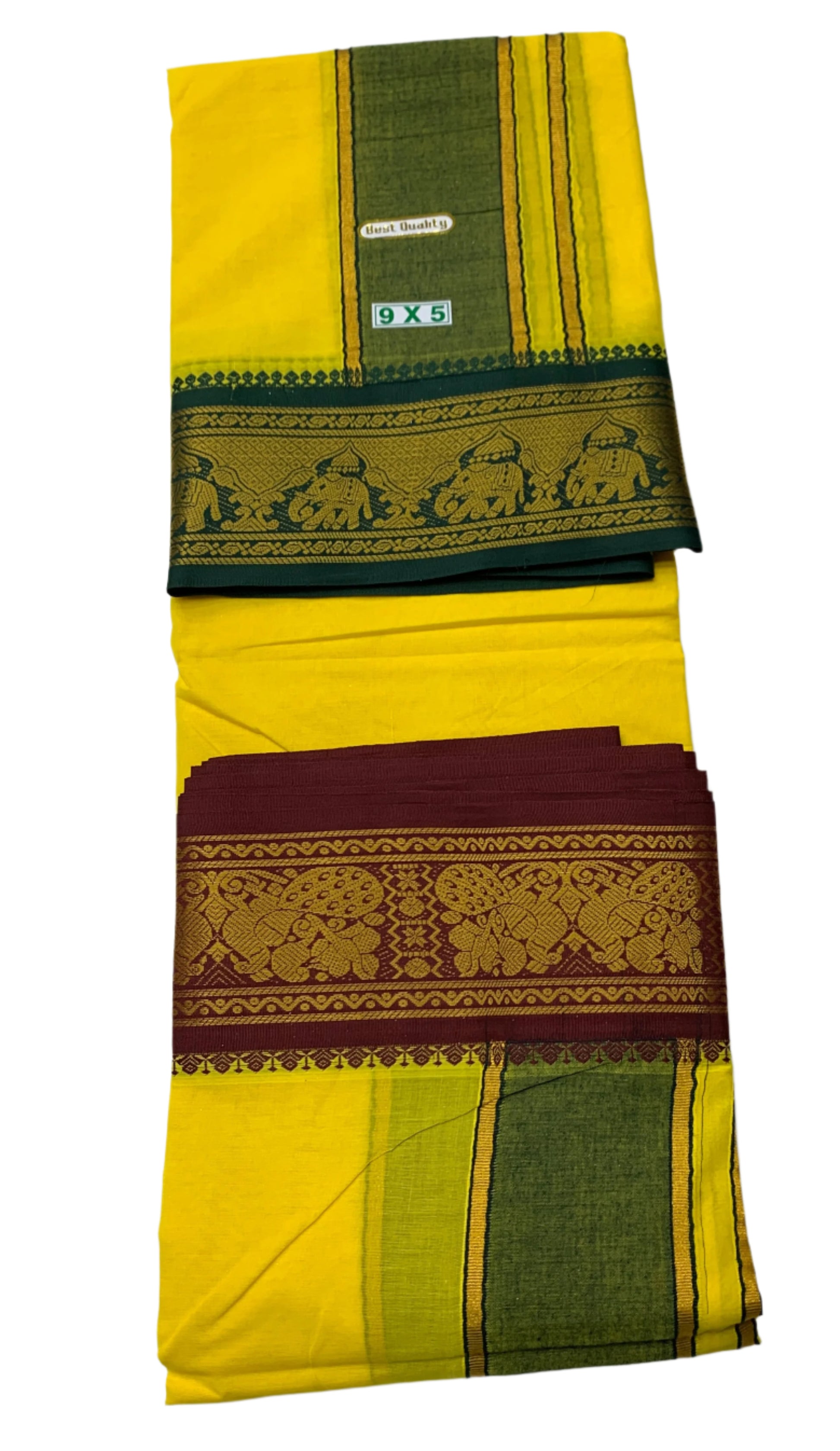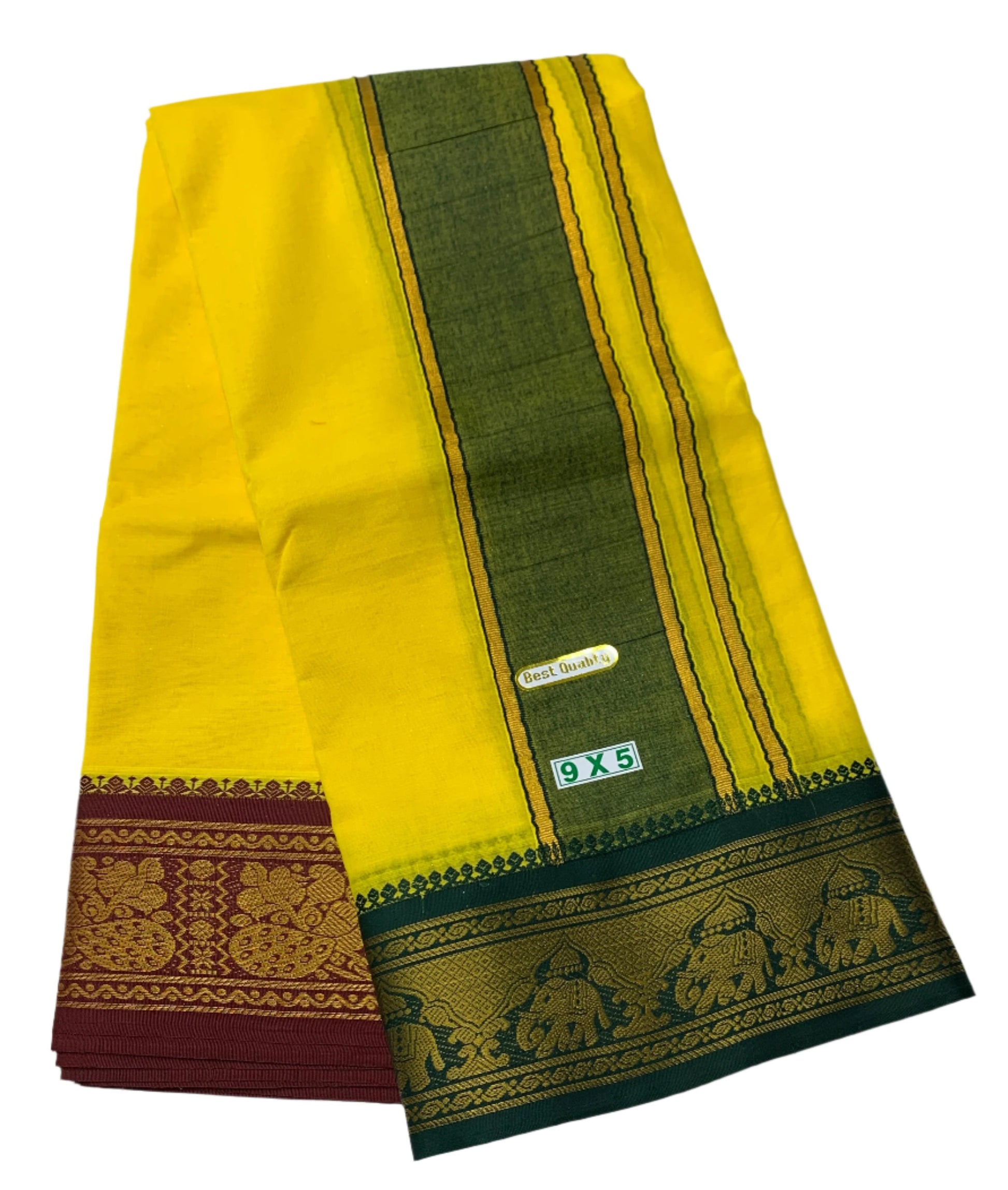9X5 Cotton Dhoti Yellow Green and Maroon Border with Angavastram.