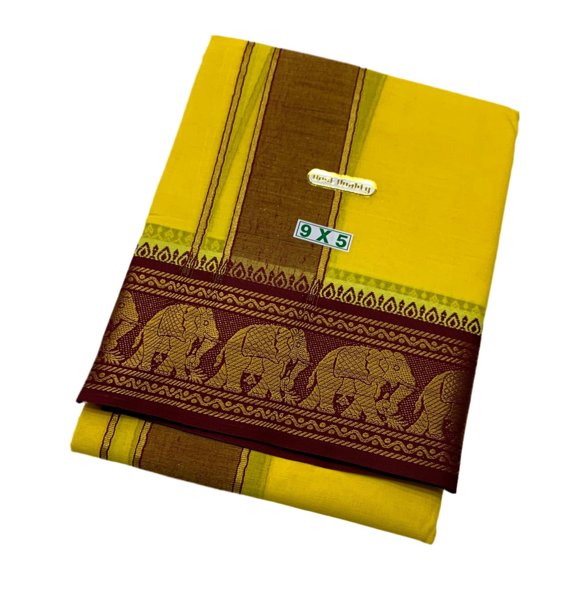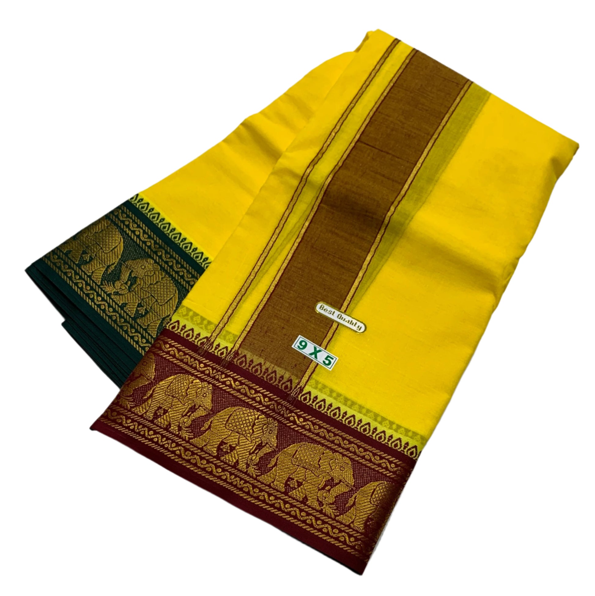 9X5 Cotton Dhoti Yellow Maroon and Green Border with Angavastram