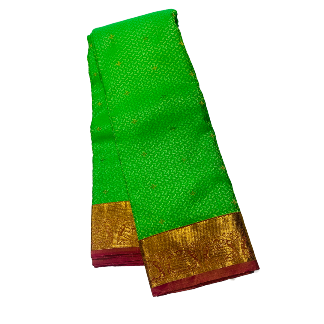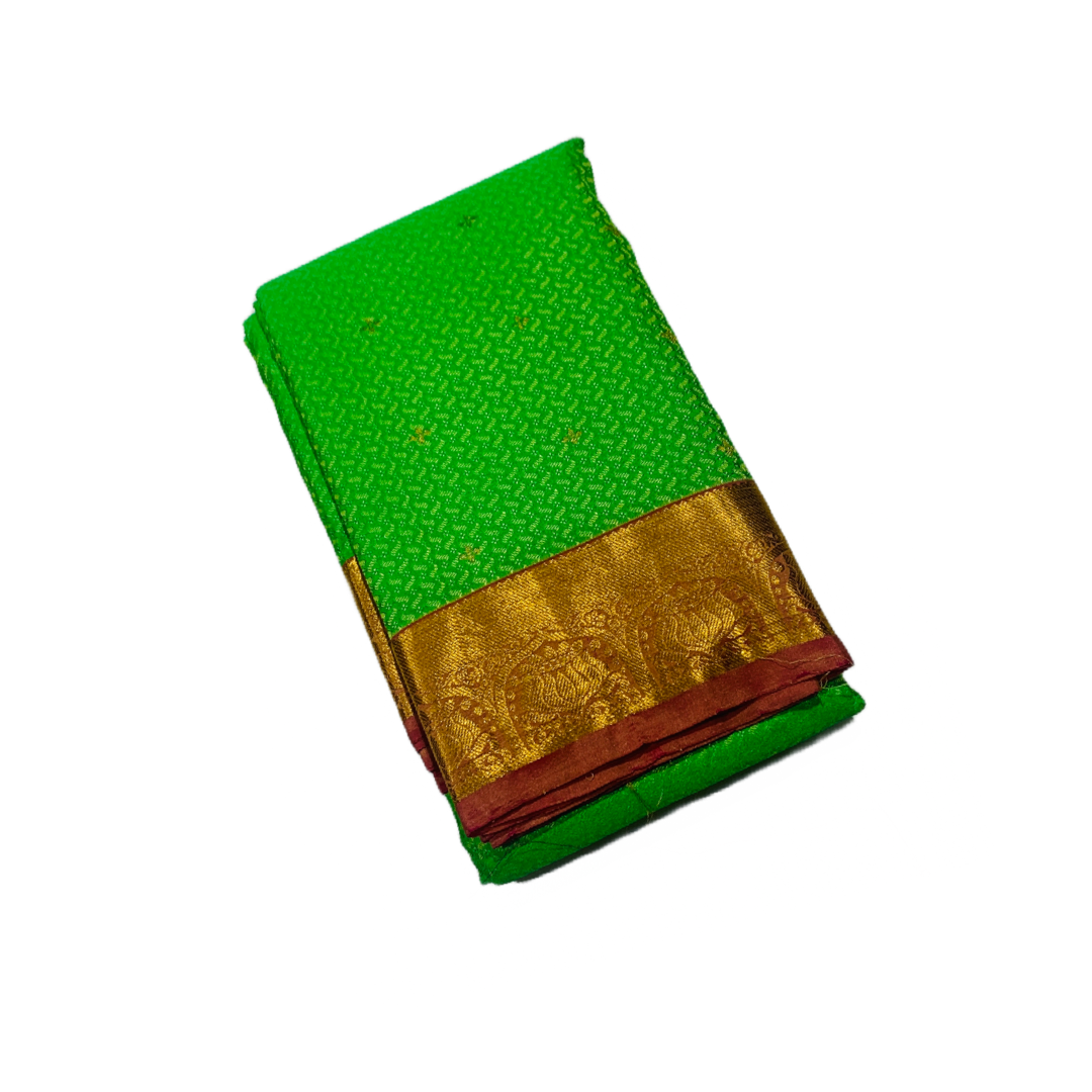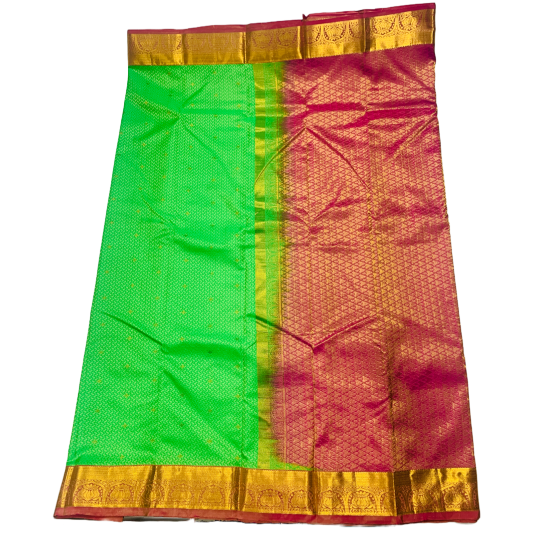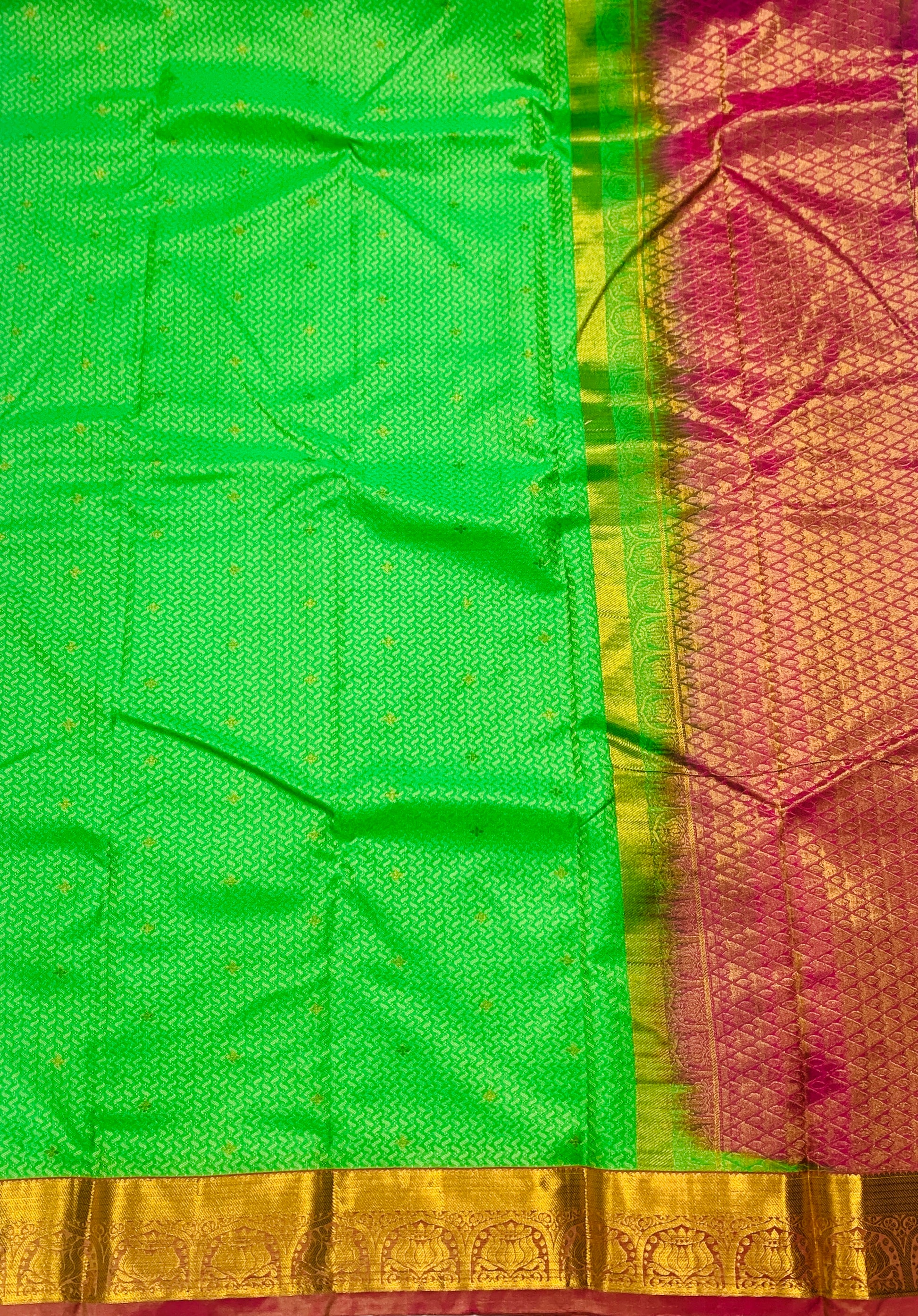Attractive Kanchipuram pure silk Apple Green saree Golden zari putta . Pink Border with Lotus Design. Light weight and easy to drape.