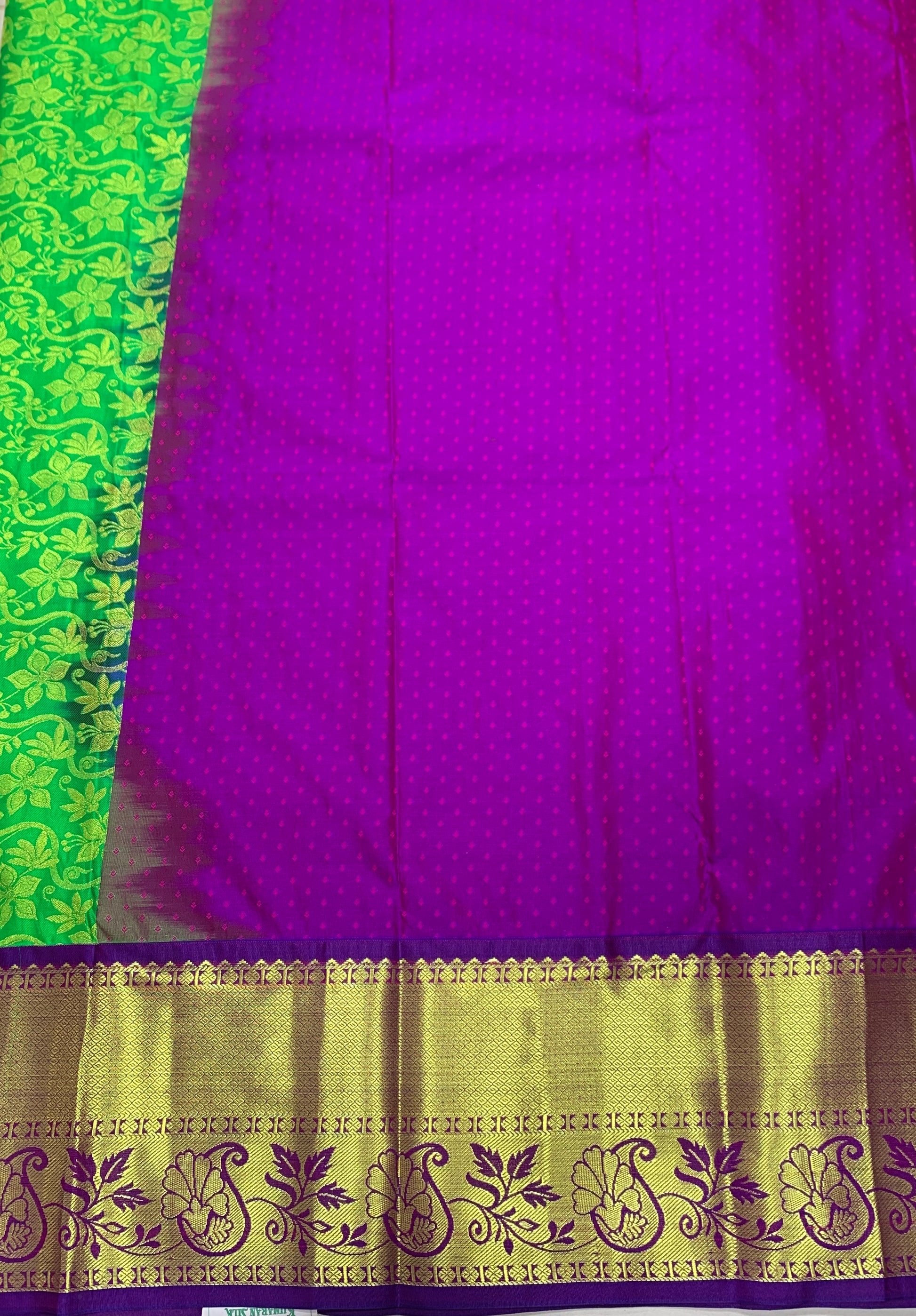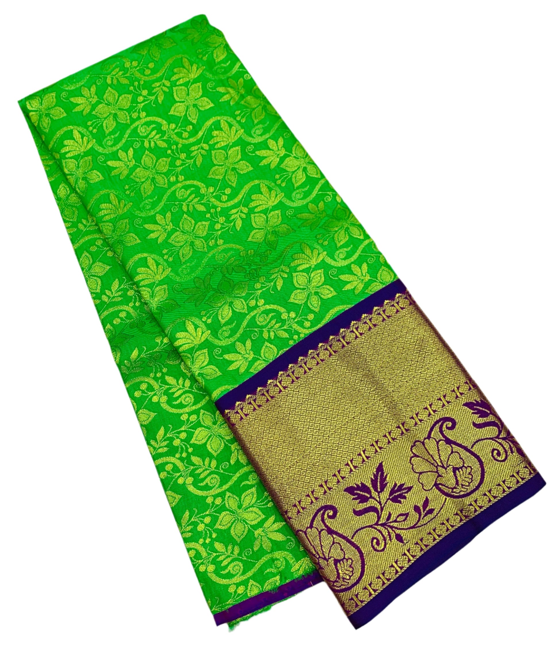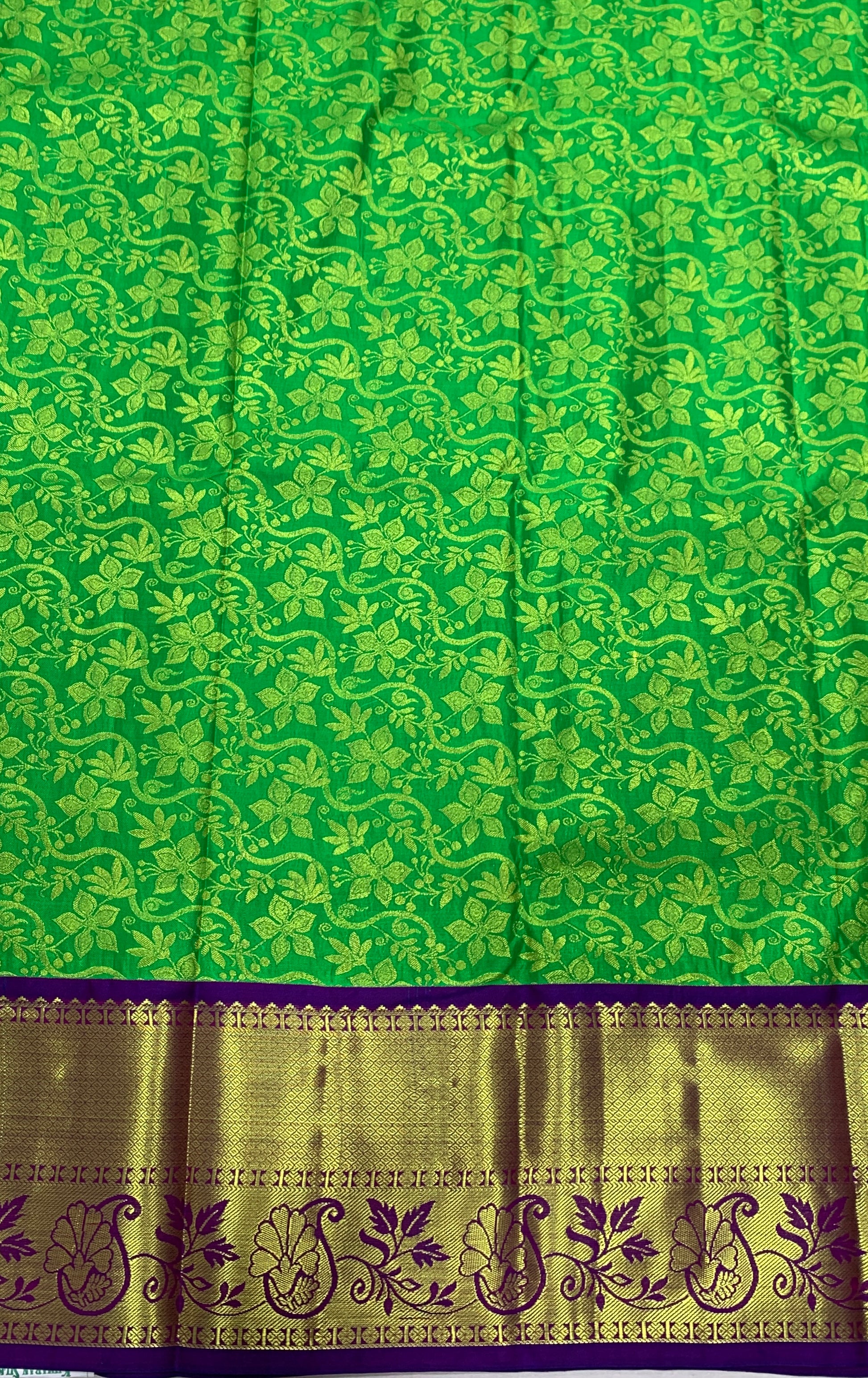 Apple Green shade with Contrast border Vegan silk unstitched Pattu Pavadai material for age Above 10 years