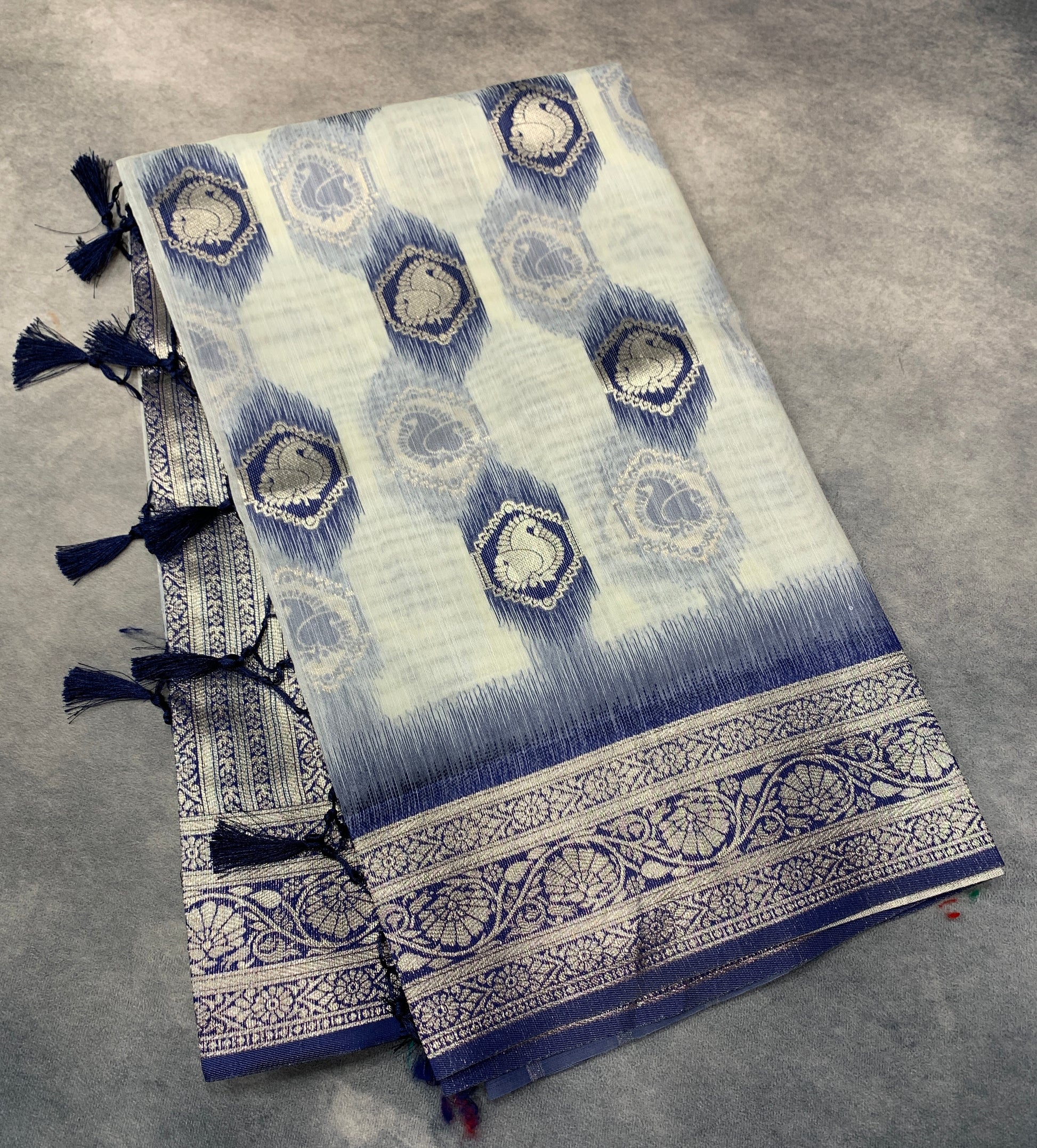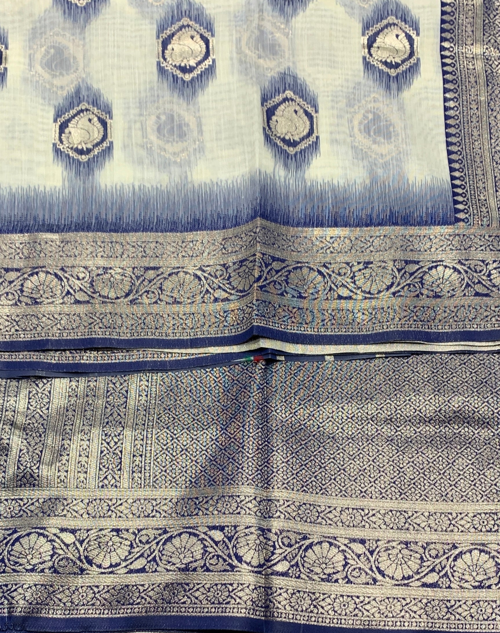 Banaras Katan Saree Off White Colour with Blue Katan Work Border
