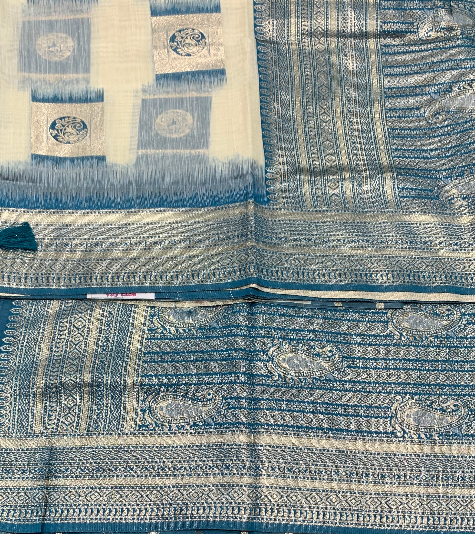 Banaras Katan Saree Off White Colour with Peacock Blue Katan Work Border.