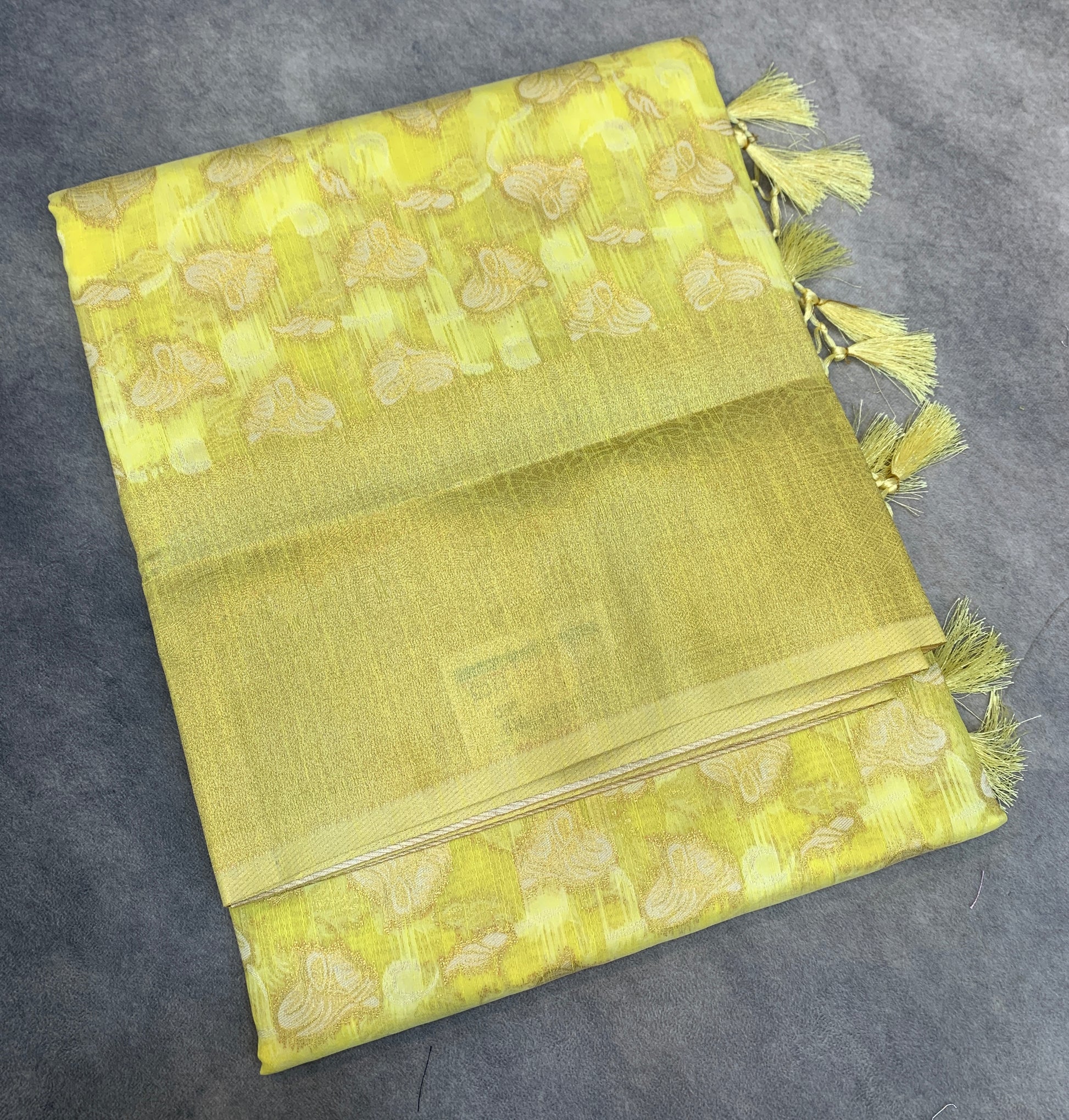 Banaras Katan Saree Yellow Colour with Katan Work Border.
