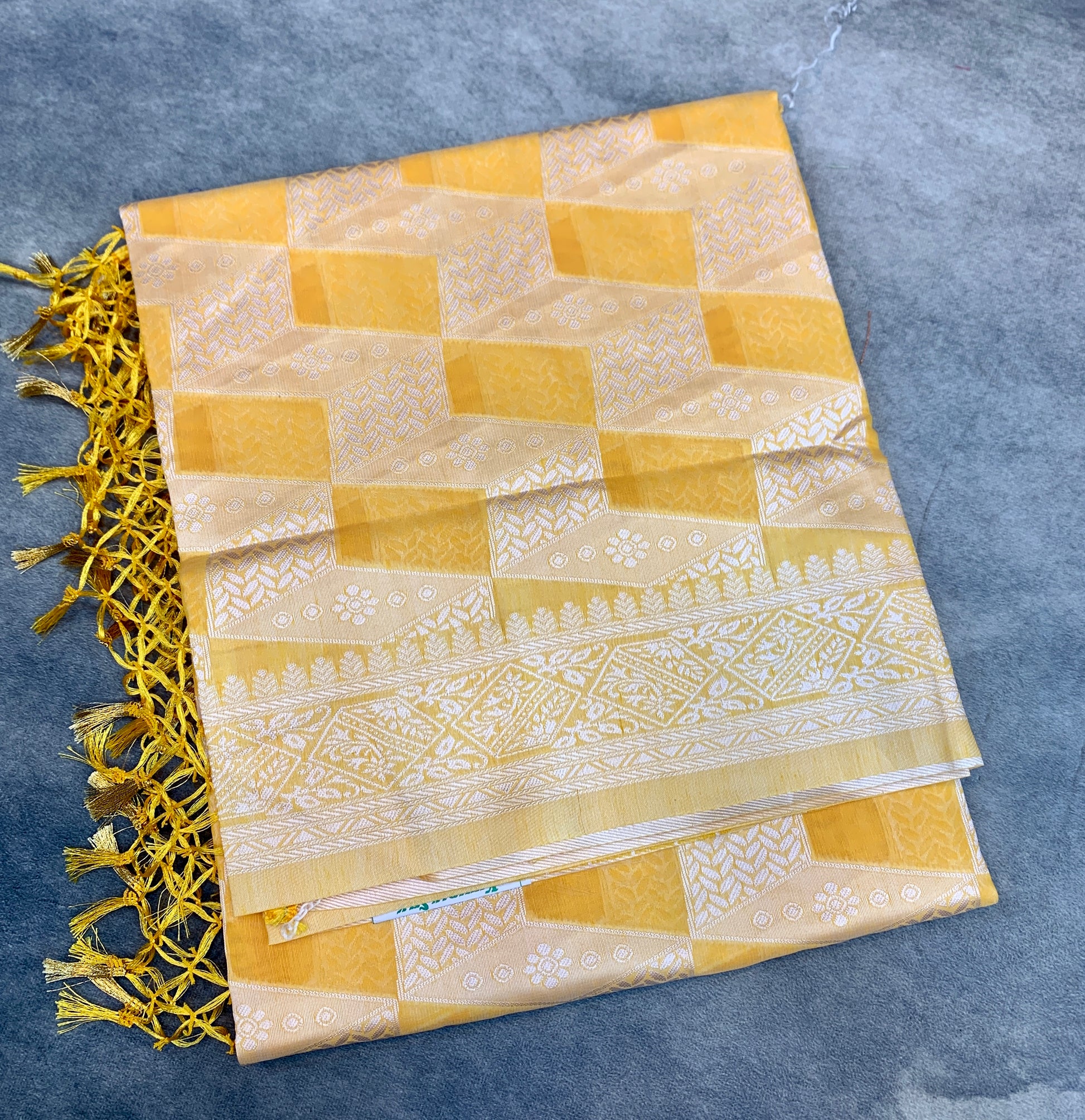 Banaras Katan Saree Yellow Colour with Katan Work Border