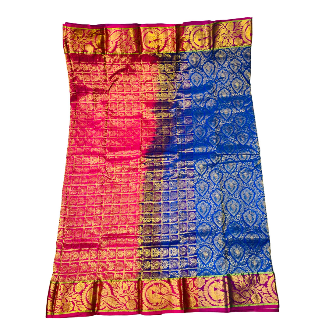Attractive PepsiBlue semi silk saree with Mango design. Pink with peacock design. Light weight and easy to drape.