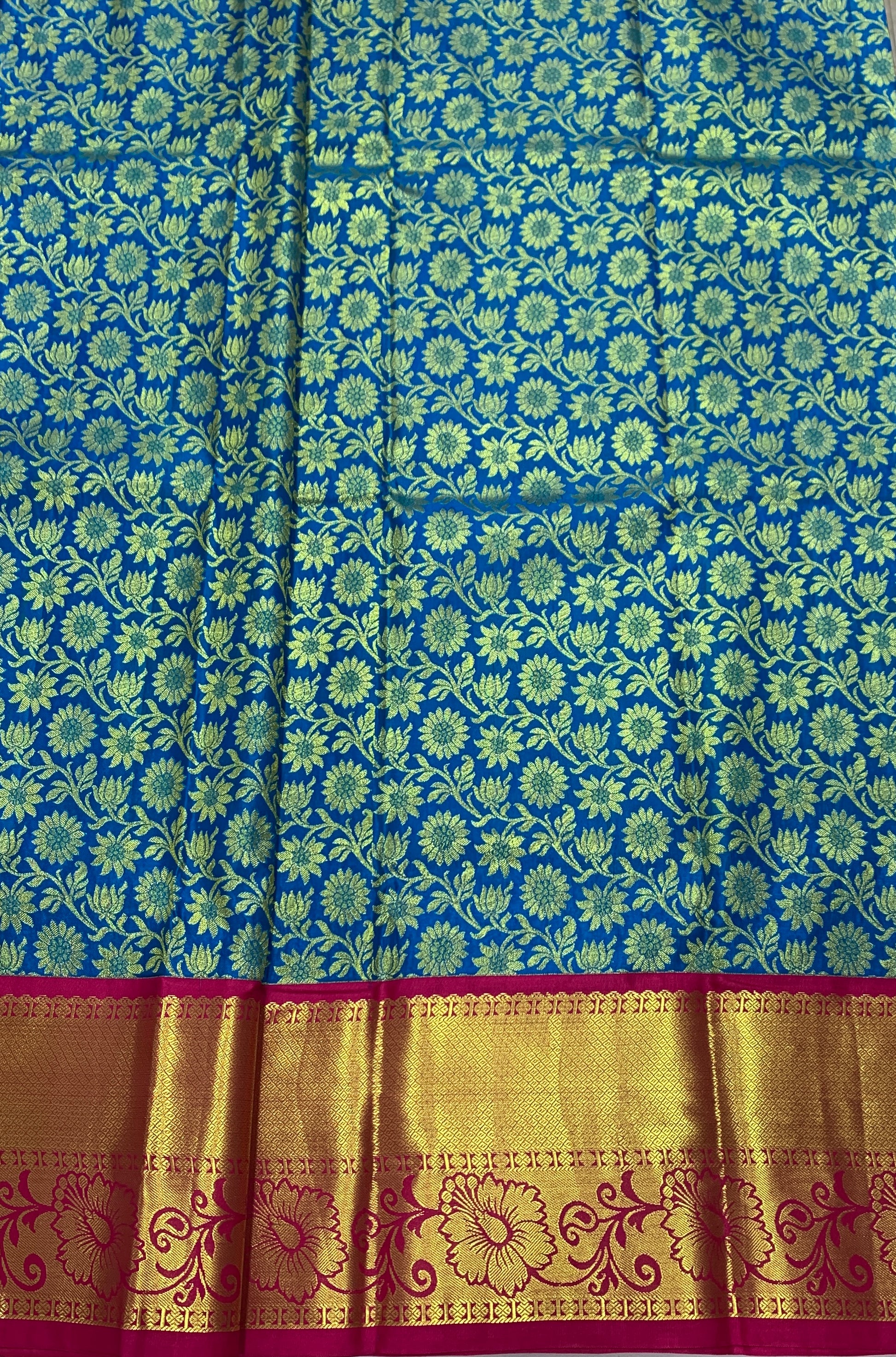 Blue shade with contrast border Vegan silk unstitched Pattu Pavadai material for age Above 10 years