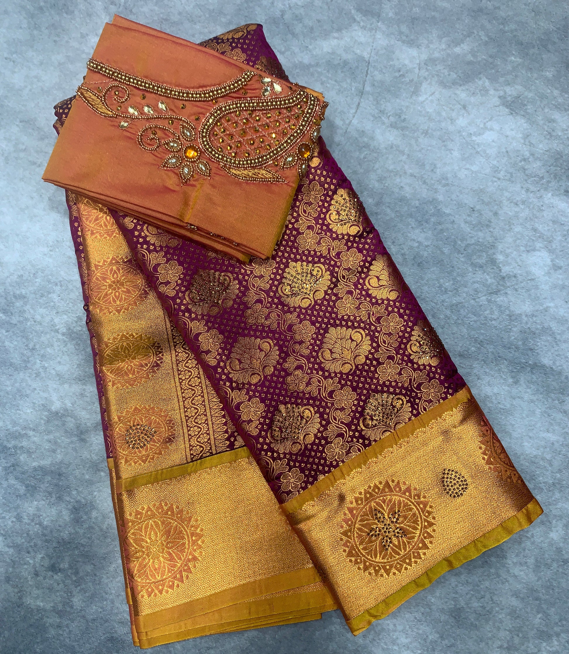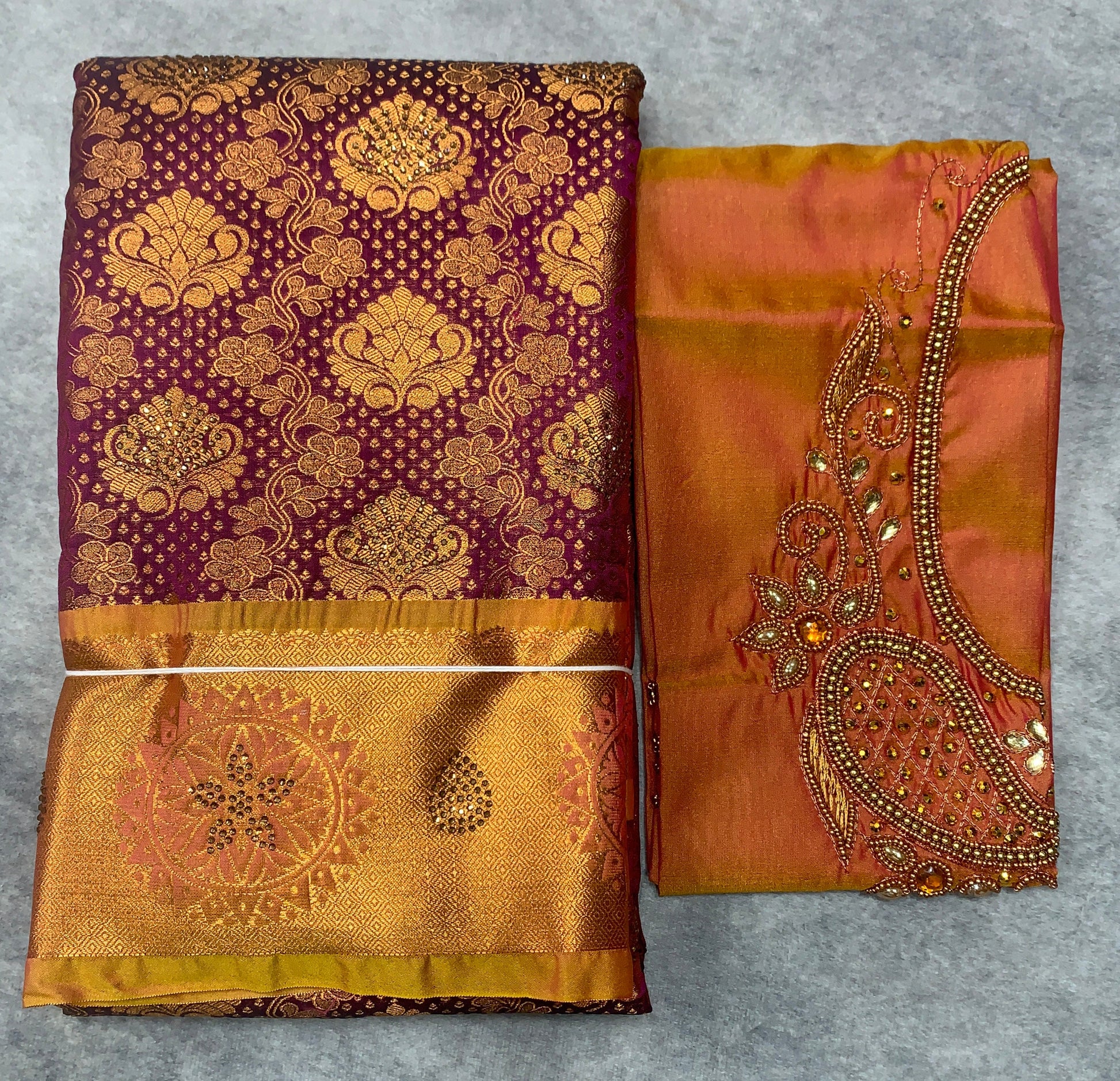 Bridal Vegan Silk Saree Beetroot Colour with Golden Yellow Border. Unstitched blouse in Aari work.