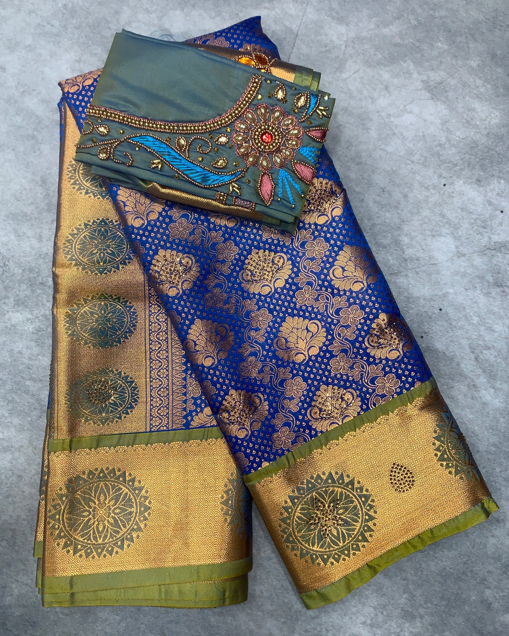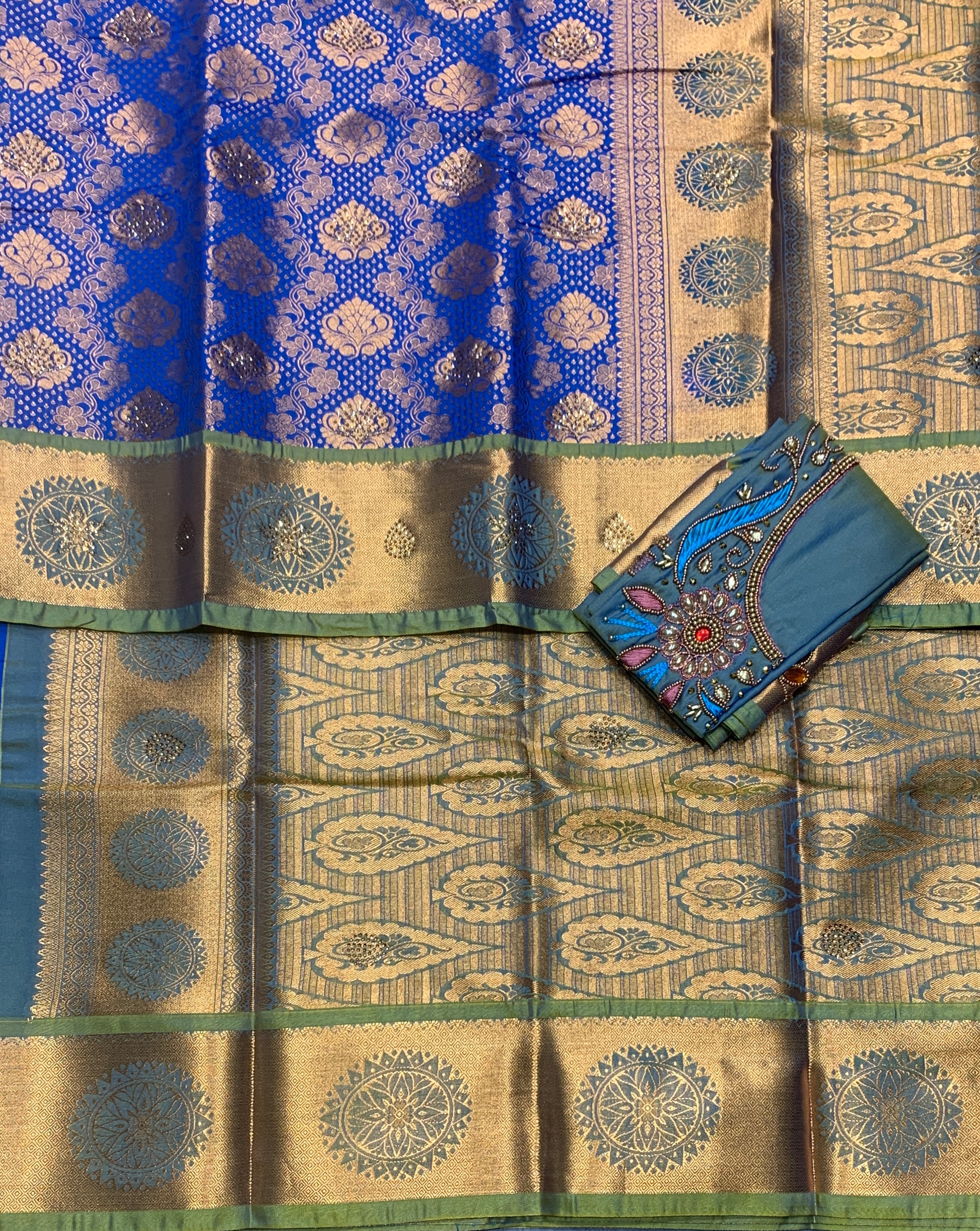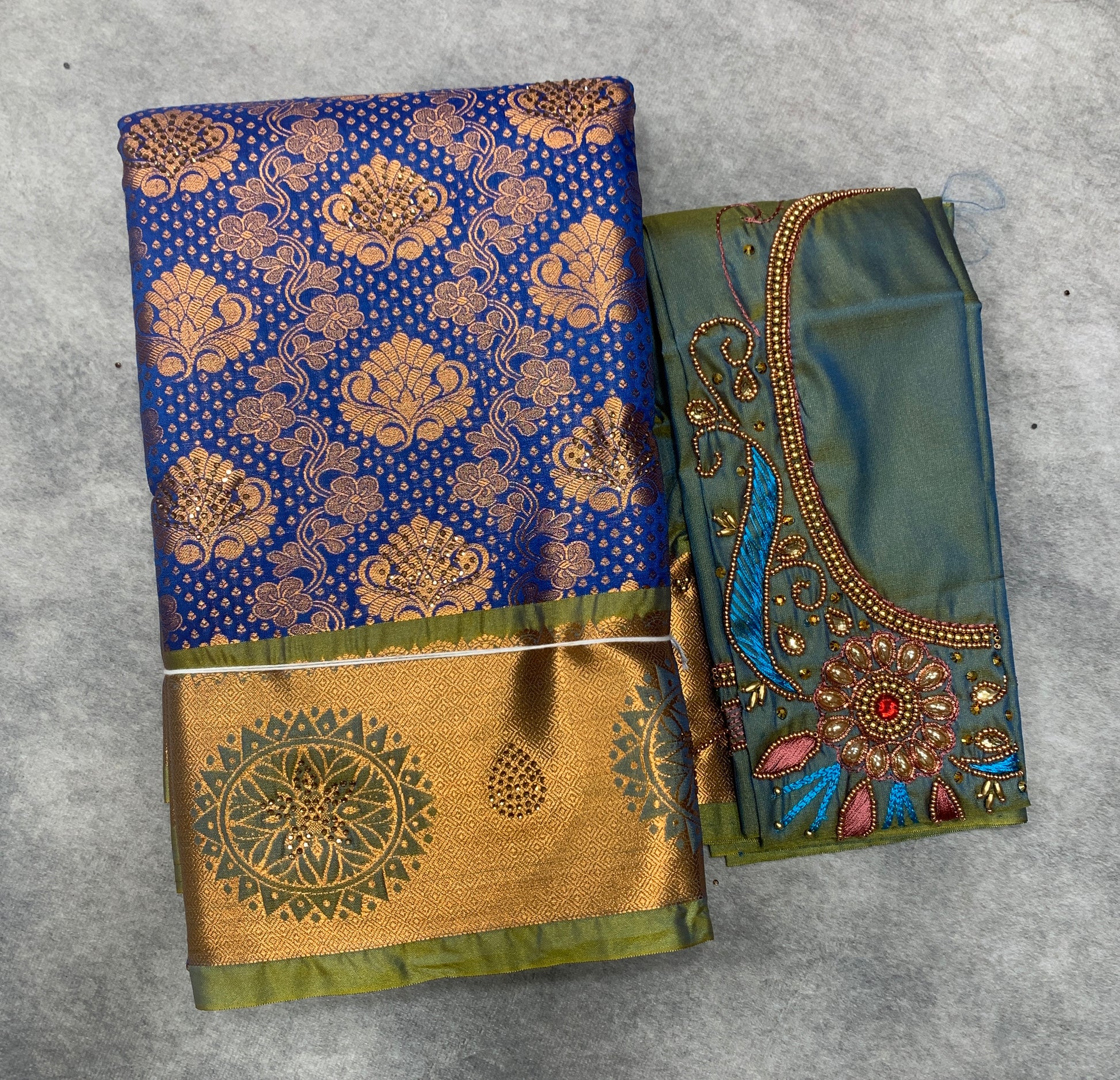 Bridal Vegan Silk Saree Blue Colour with Light Green Border. Unstitched blouse in Aari work.