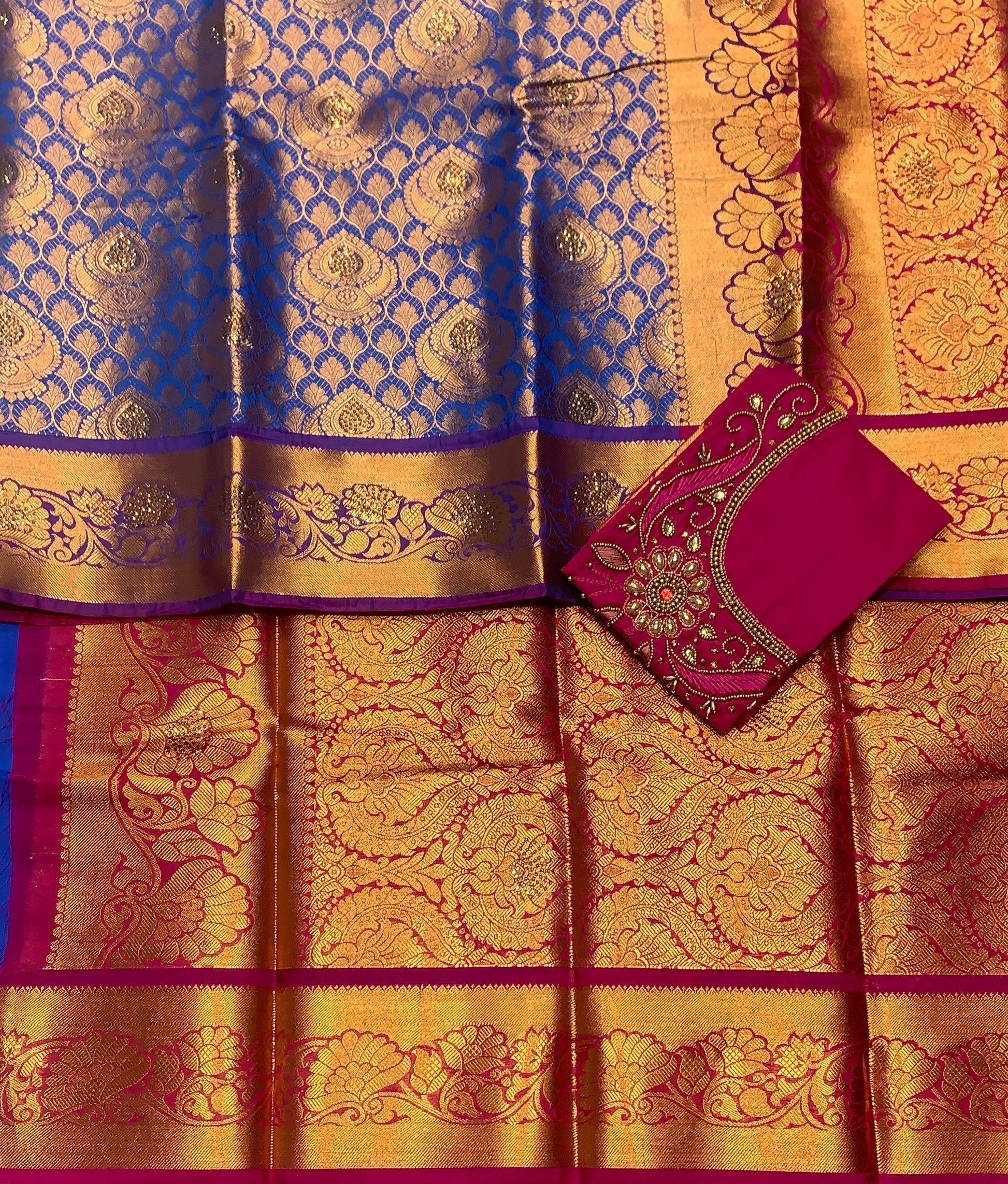 Bridal Vegan Silk Saree Blue shade with Pink Border. Unstitched blouse in Aari work.