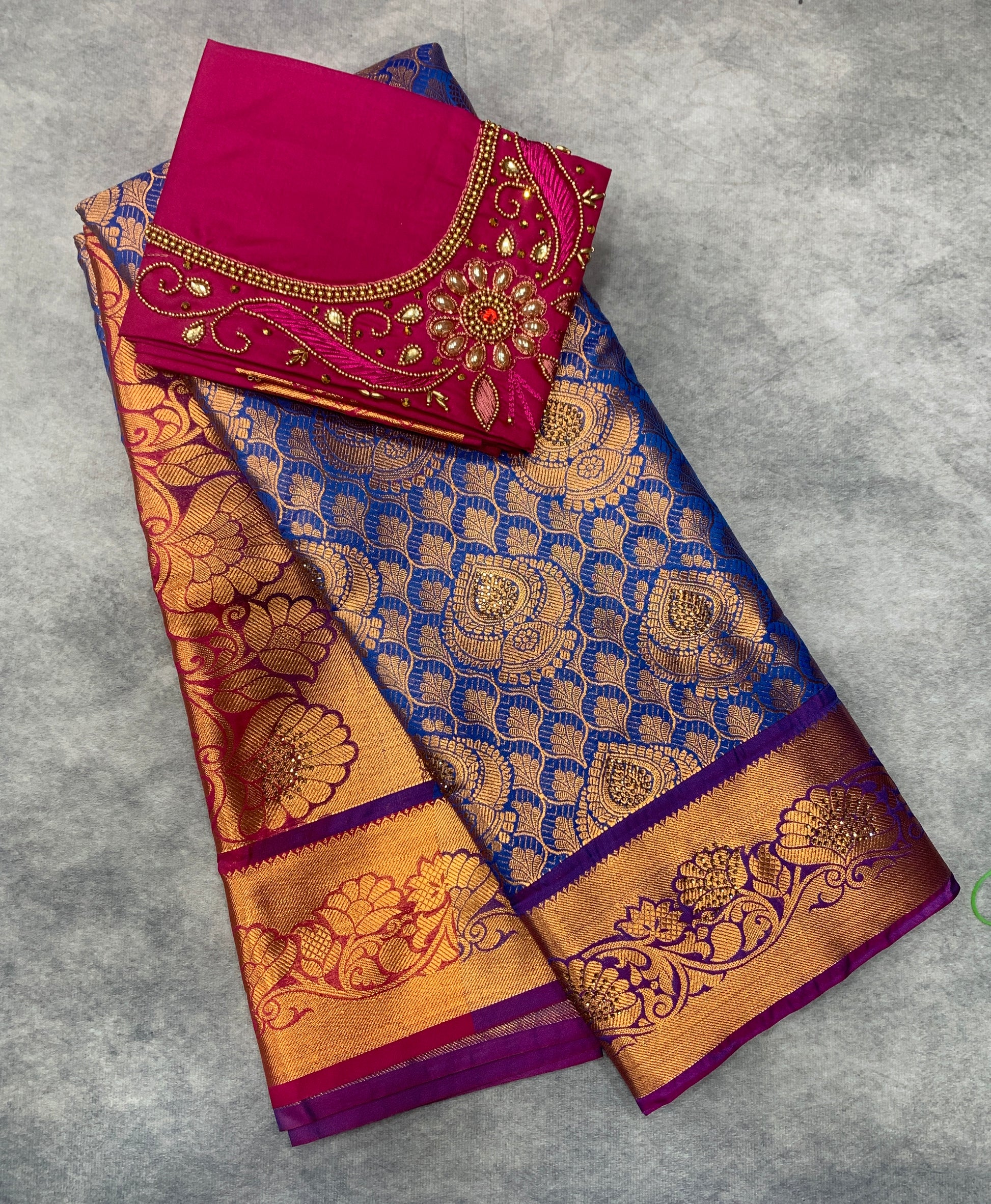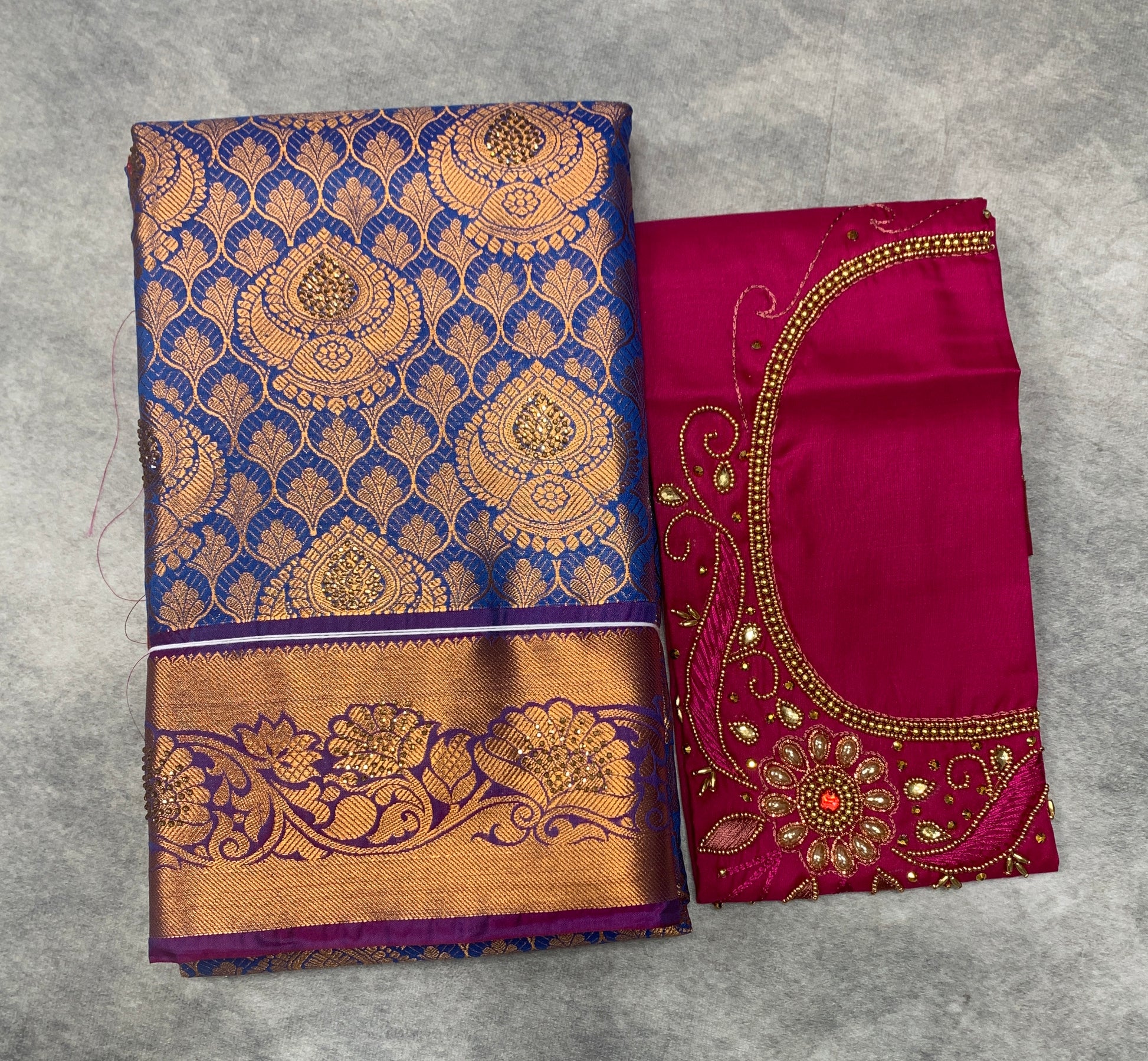 Bridal Vegan Silk Saree Blue shade with Pink Border with Unstitched blouse in Aari Work