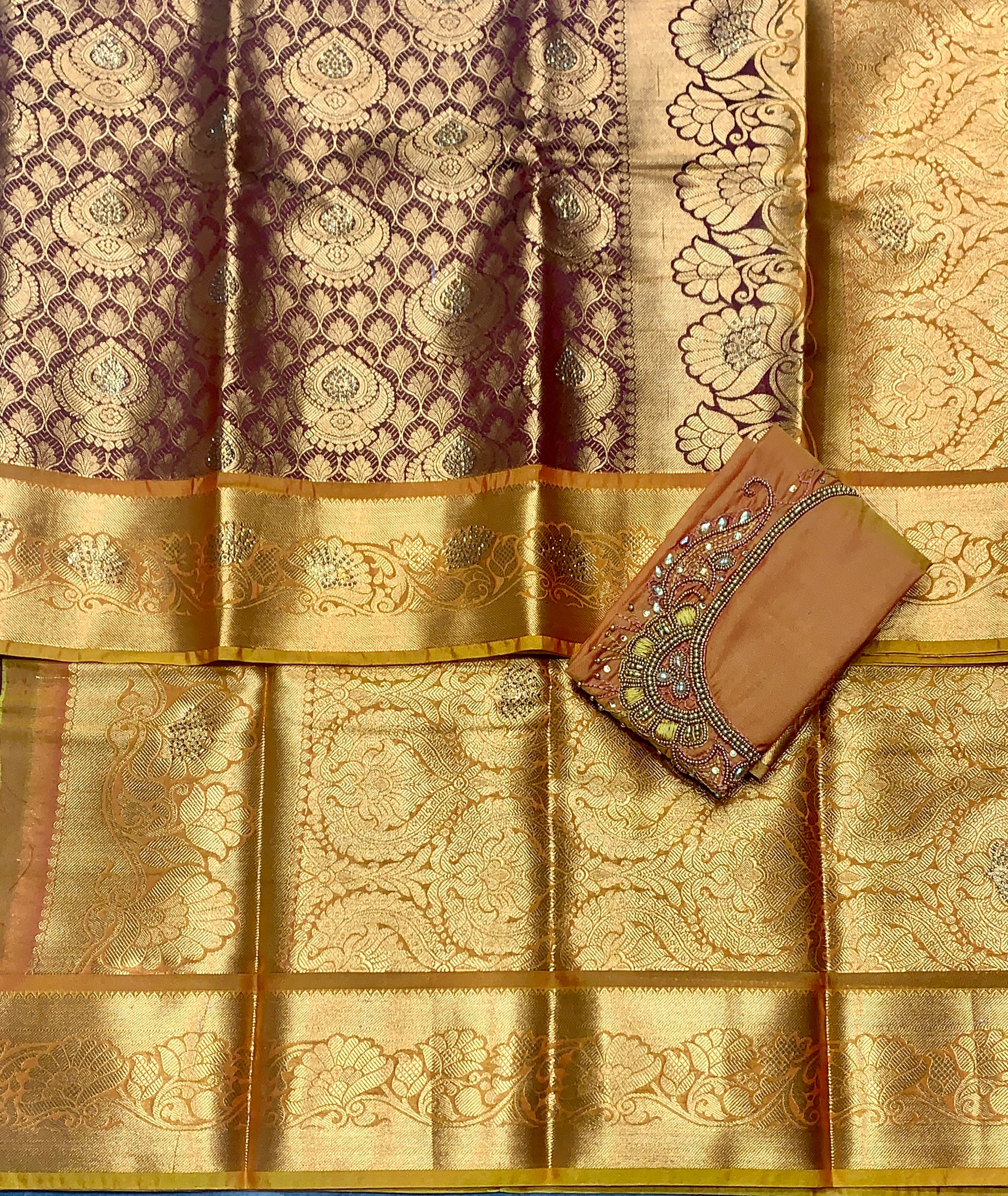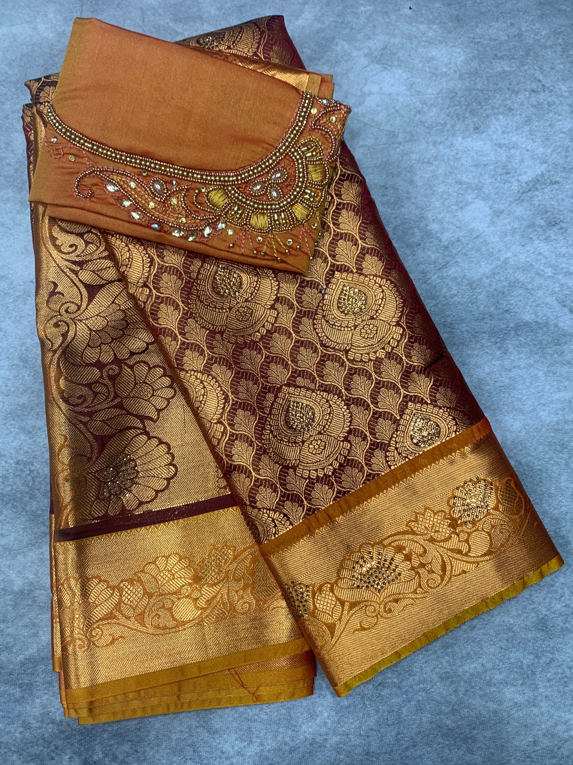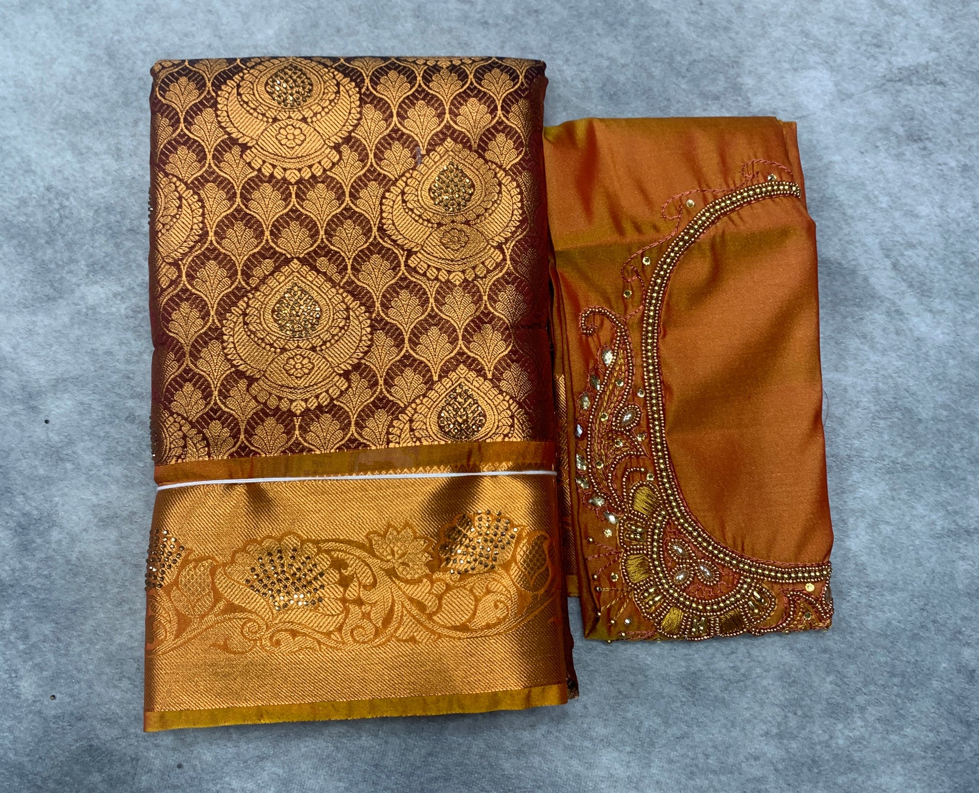 Bridal Vegan Silk Saree Brown shade with Golden Yellow Border. Unstitched blouse in Aari work.