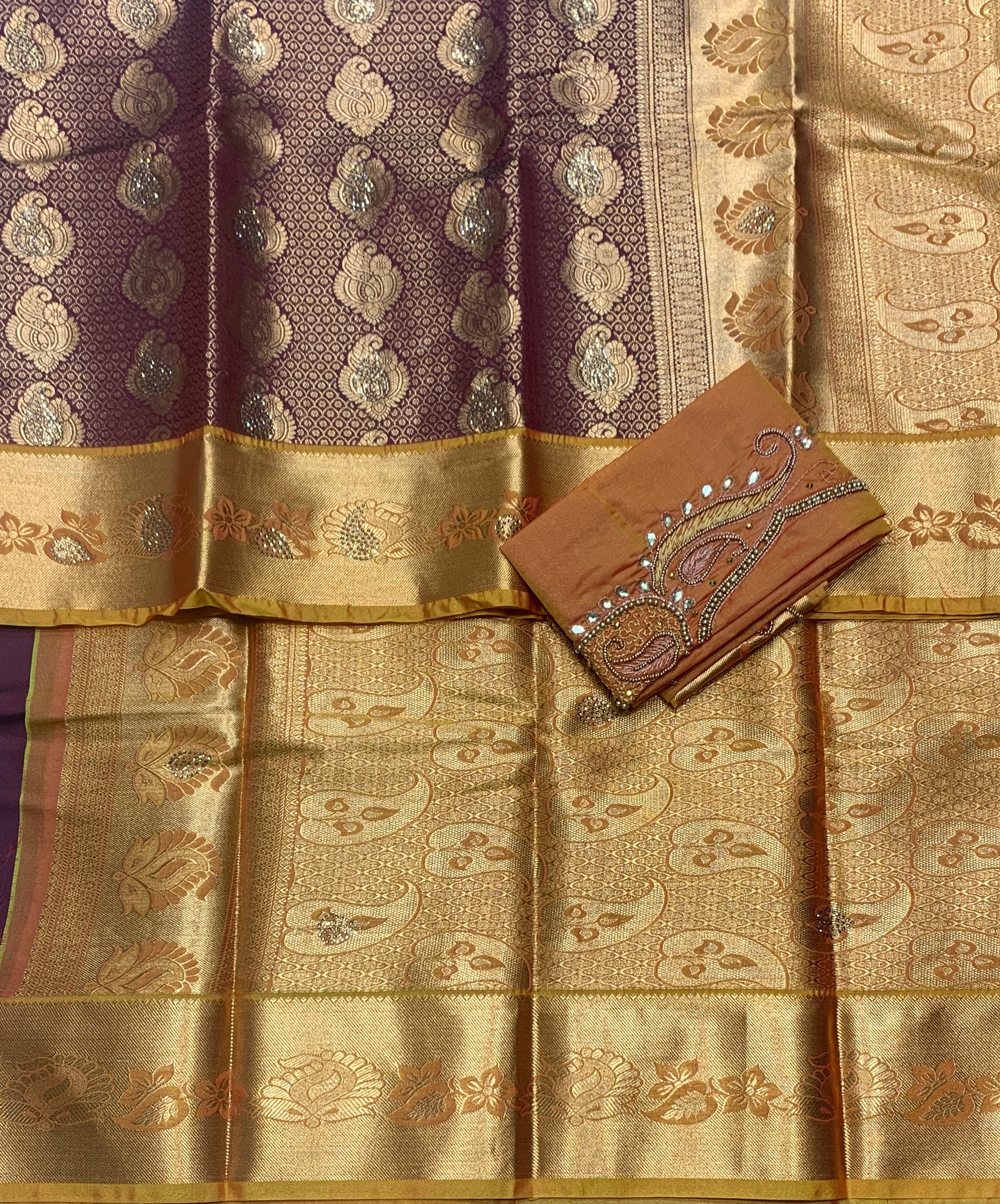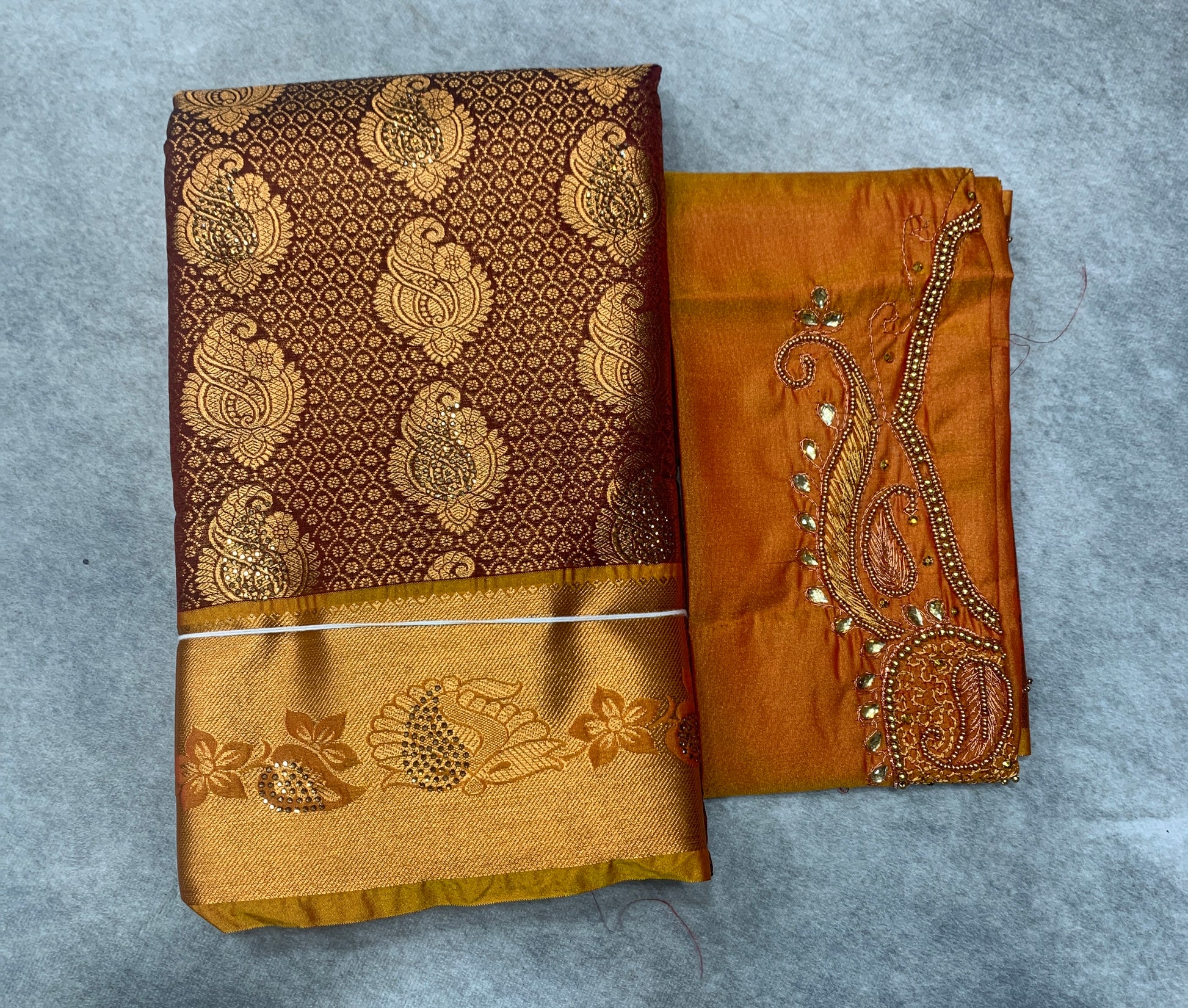 Bridal Vegan Silk Saree Brown Colour with Golden Yellow Border. Unstitched blouse in Aari work.