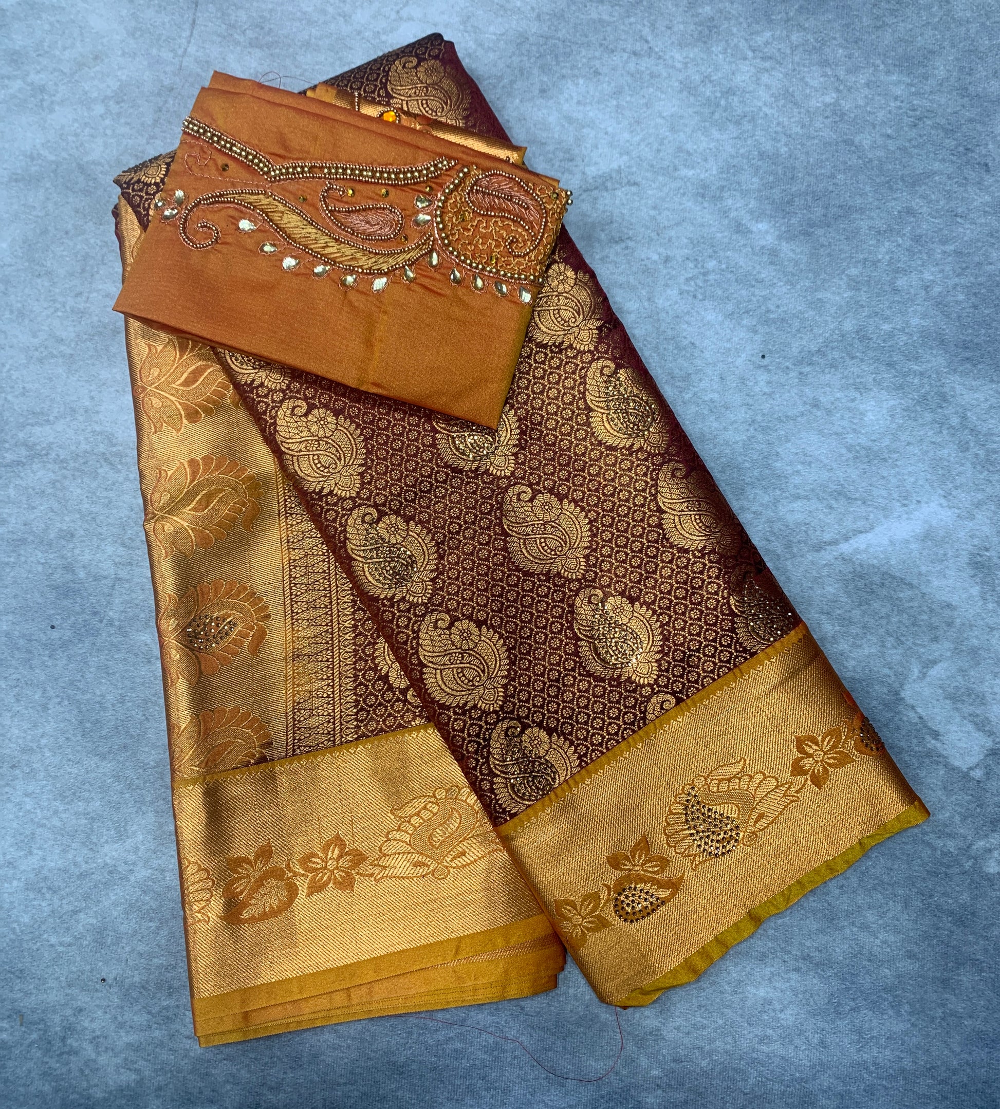 Bridal Vegan Silk Saree Brown shade with Golden Yellow Border with Unstitched blouse in Aari Work
