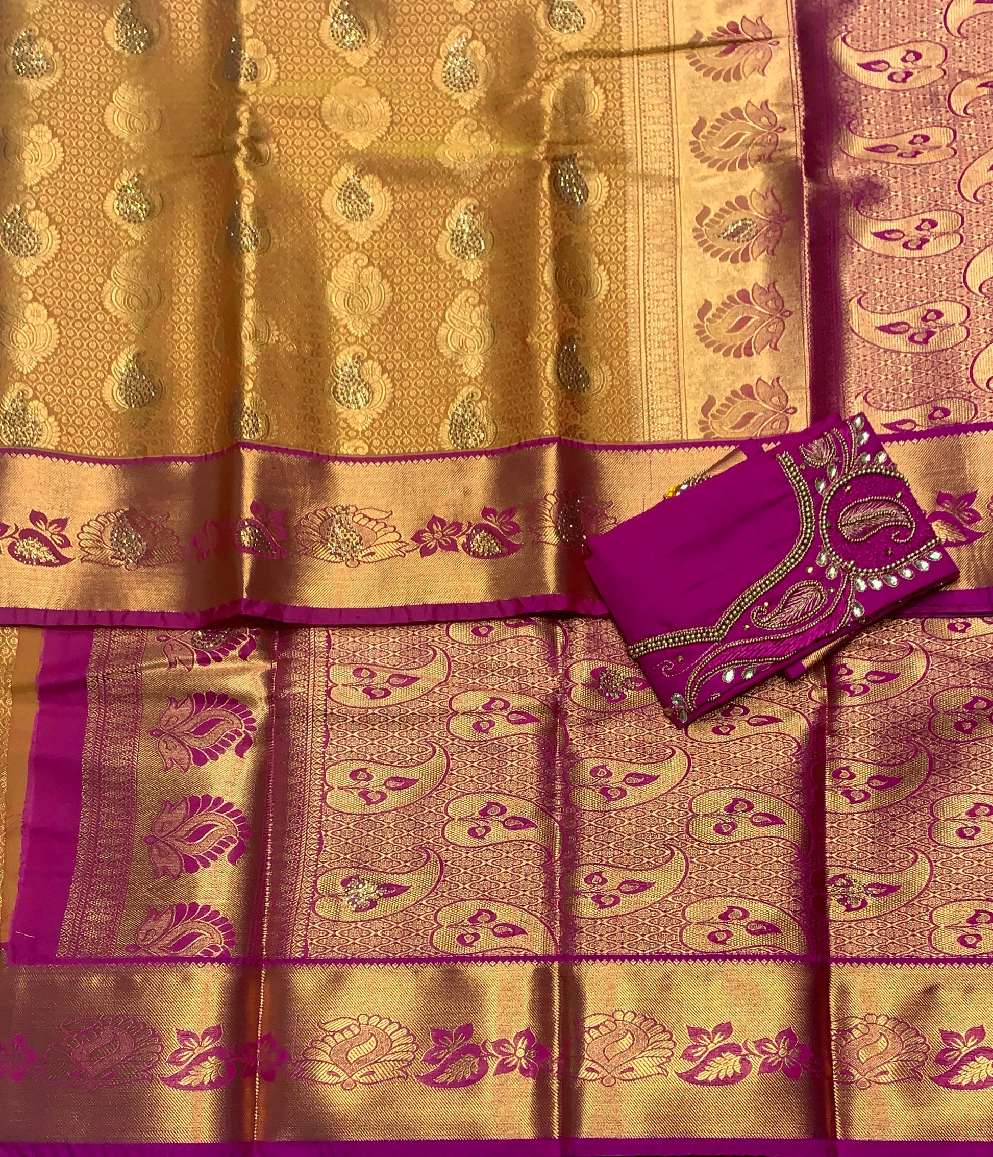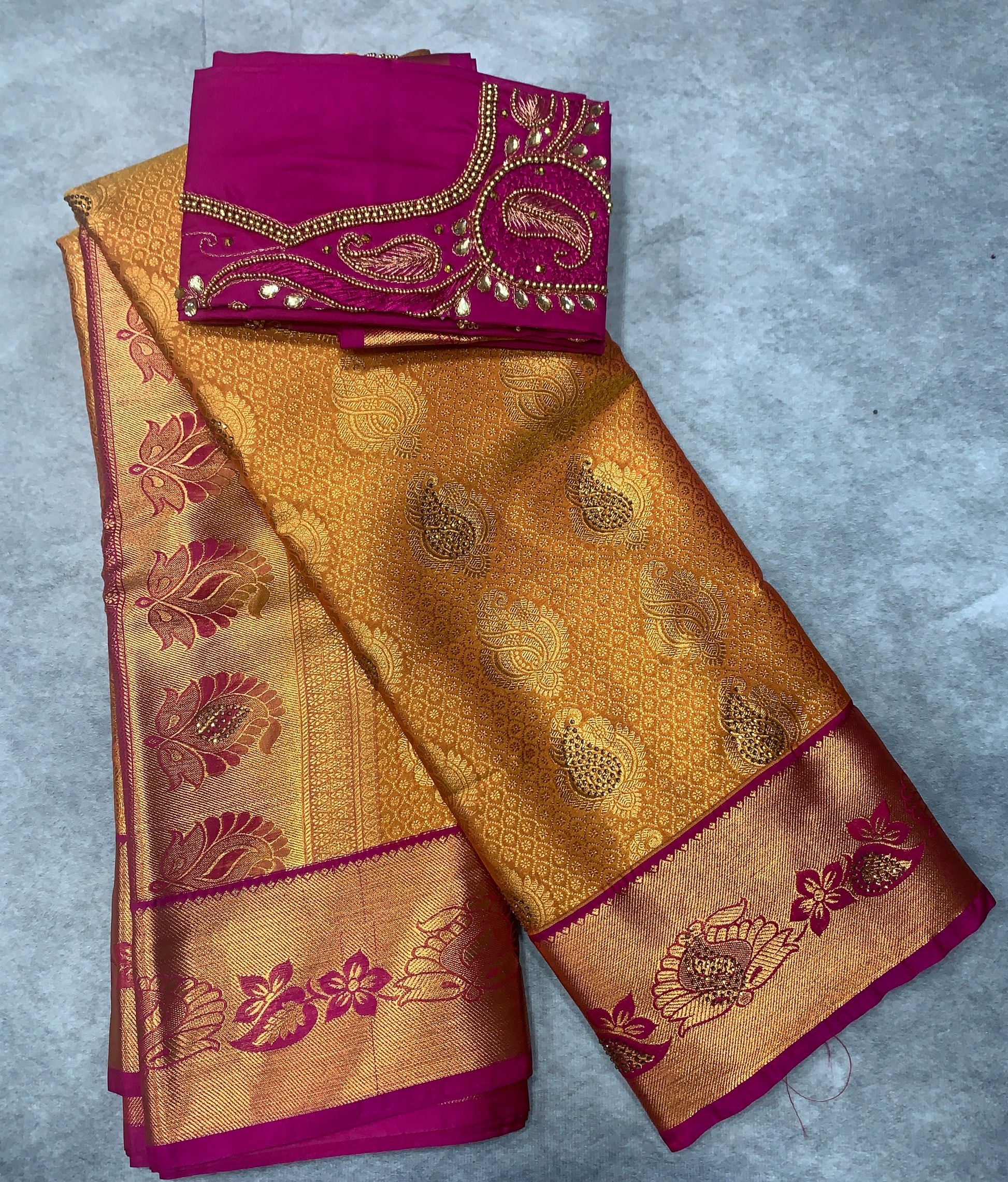 Bridal Vegan Silk Saree Golden Yellow Colour with Pink Border. Unstitched blouse in Aari work.
