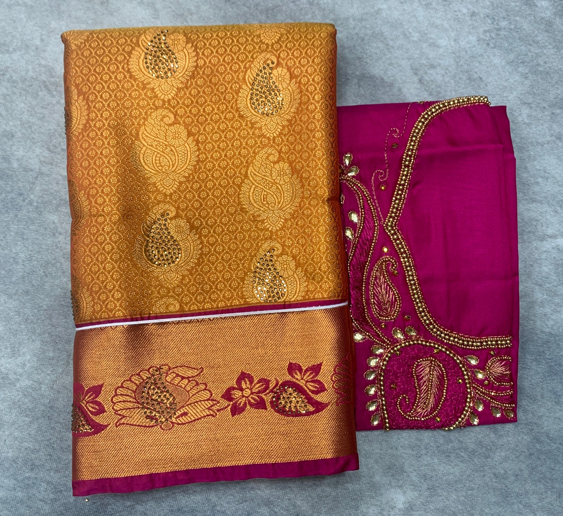 Bridal Vegan Silk Saree Golden Yellow shade with Pink Border with Unstitched blouse in Aari Work