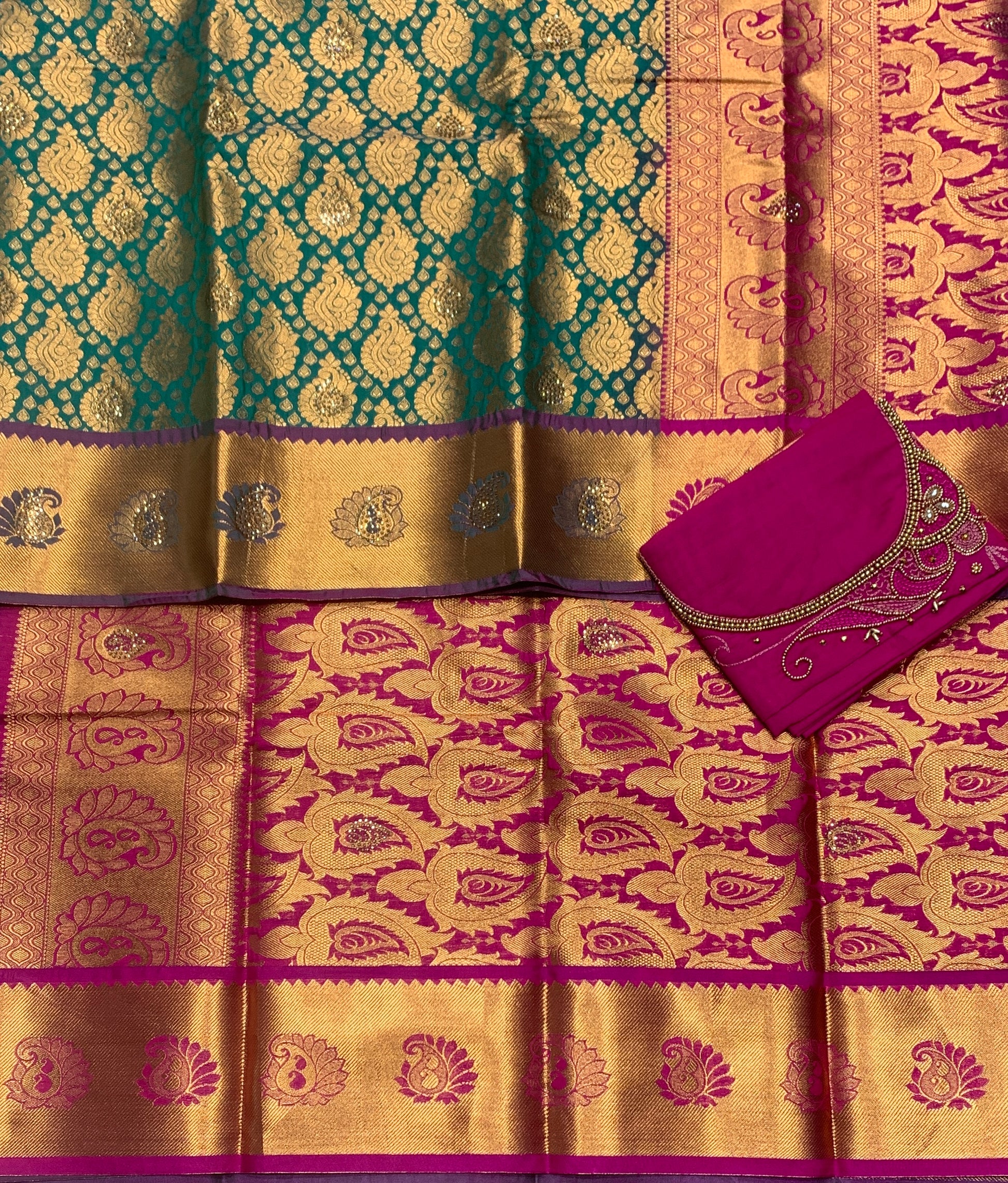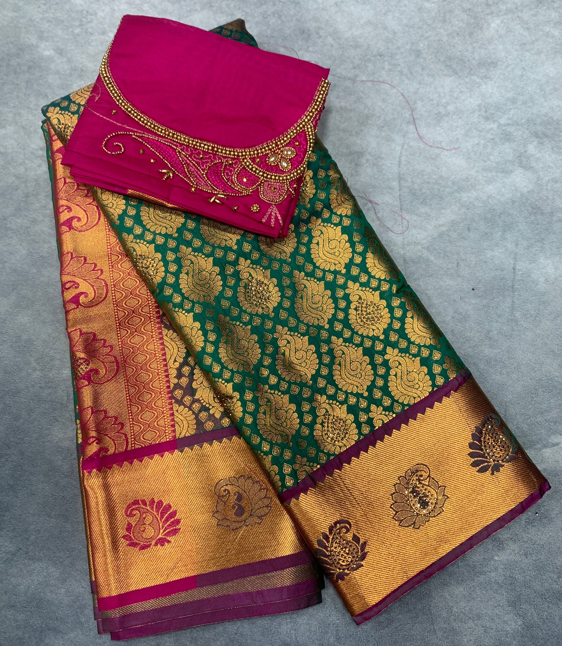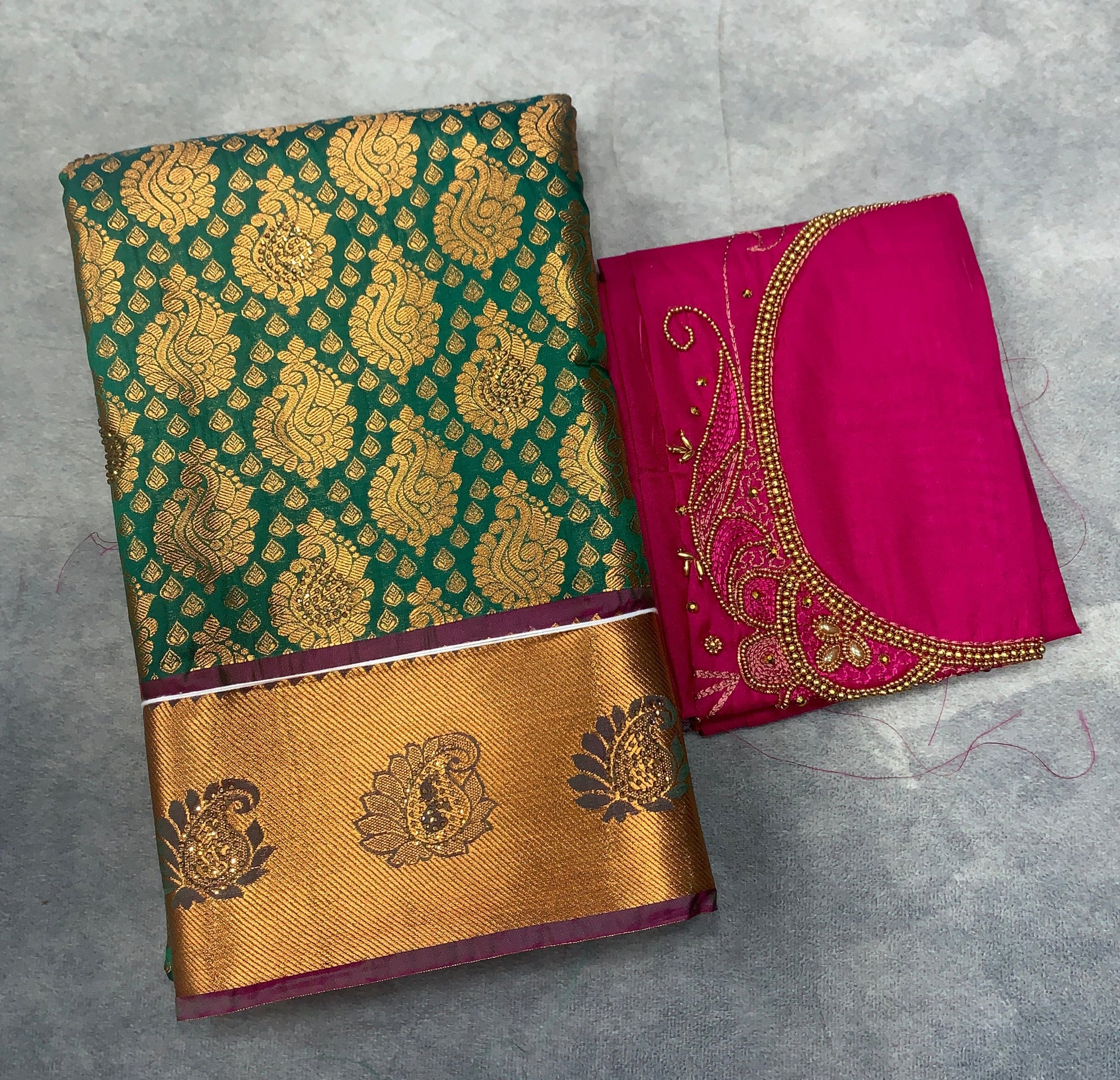 Bridal Vegan Silk Saree Green shade with Pink Border. Unstitched blouse in Aari work.