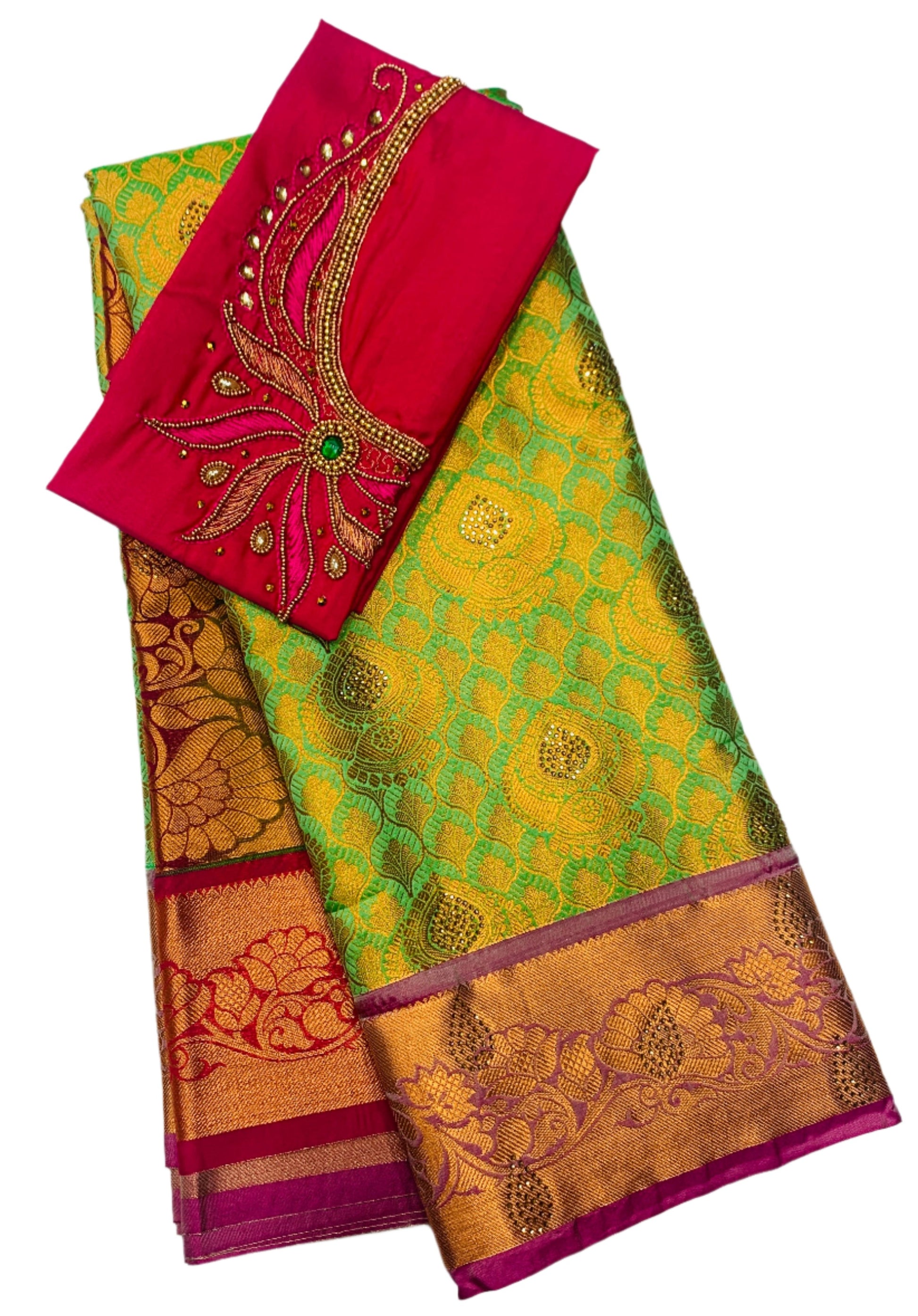 Bridal Vegan Silk Saree Light Green Colour shade with Pink Border. Unstitched blouse in Aari work.dry wash only.