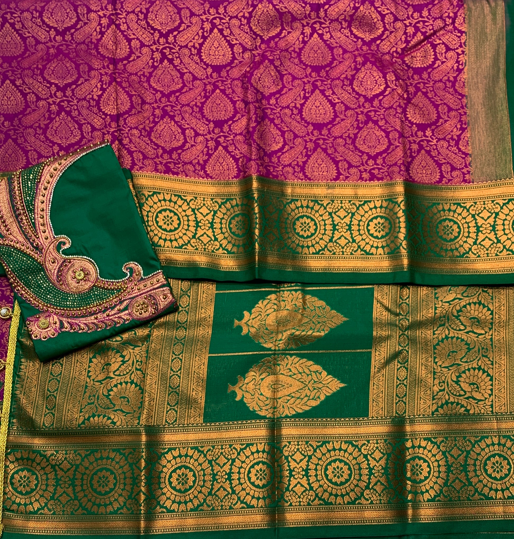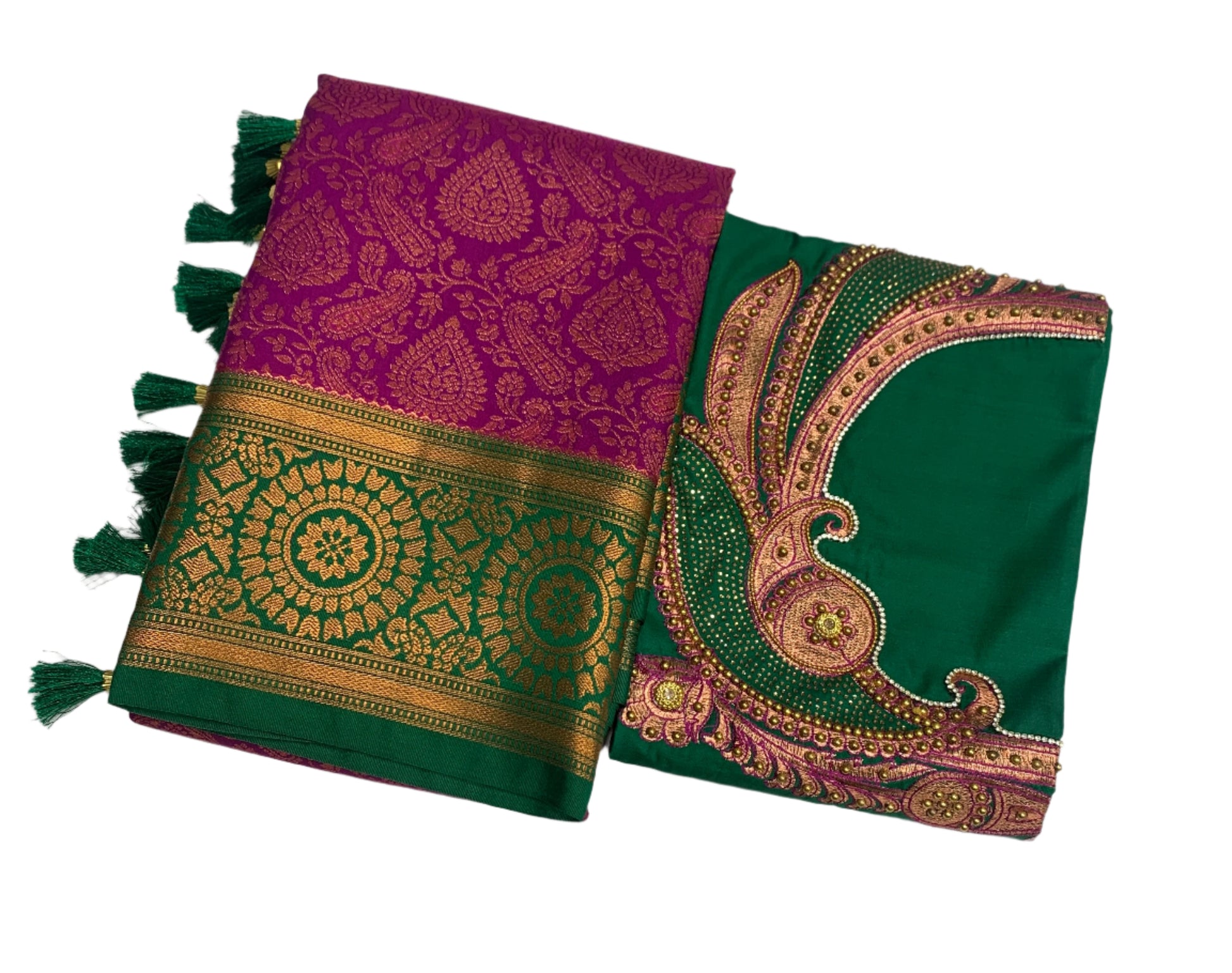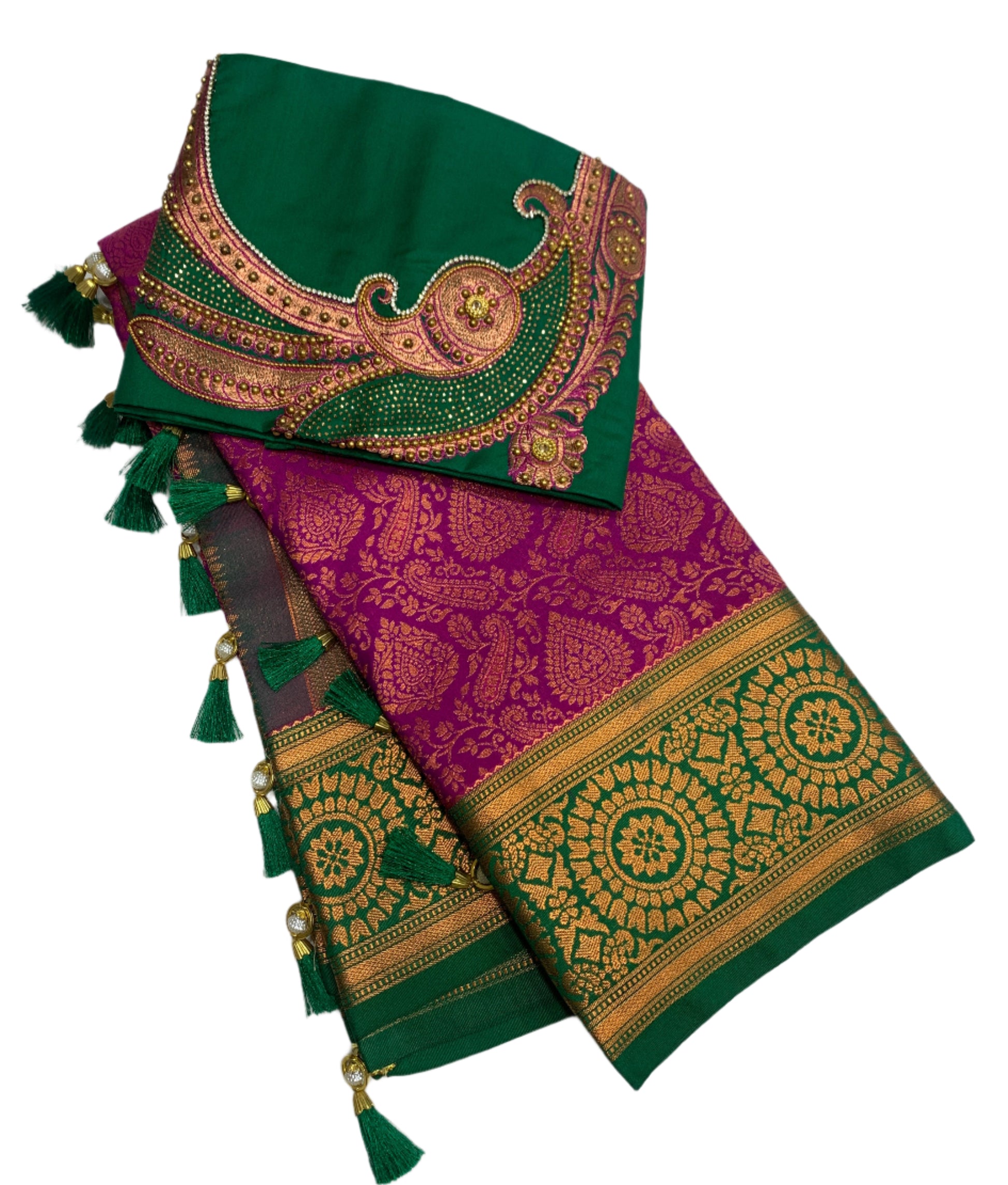 Bridal Vegan Silk Saree Magenta Colour with Green Border with Unstitched blouse in Aari work