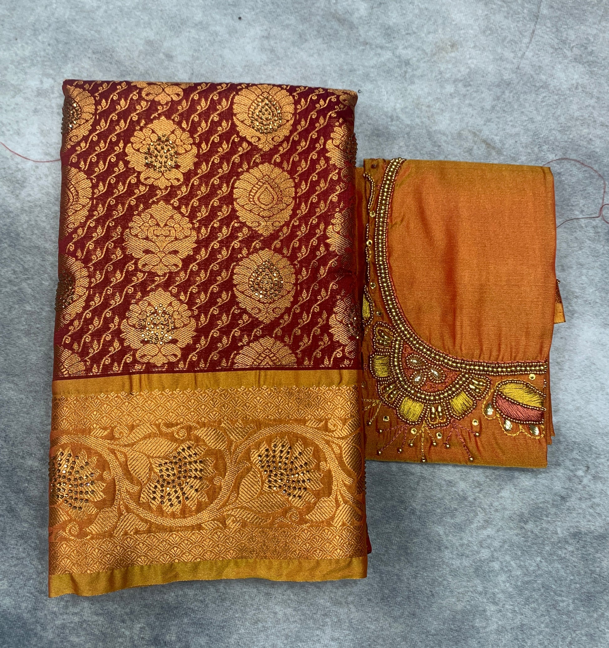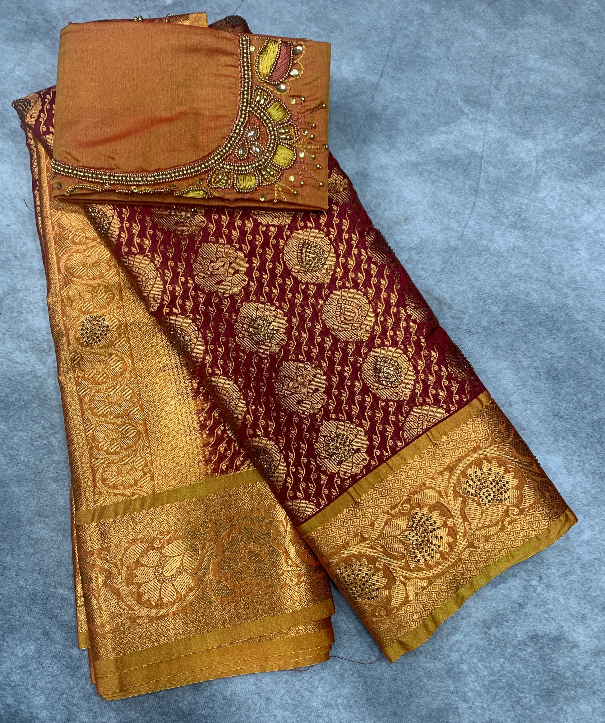 Bridal Vegan Silk Saree Maroon shade with Golden Yellow Border with Unstitched blouse in Aari Work