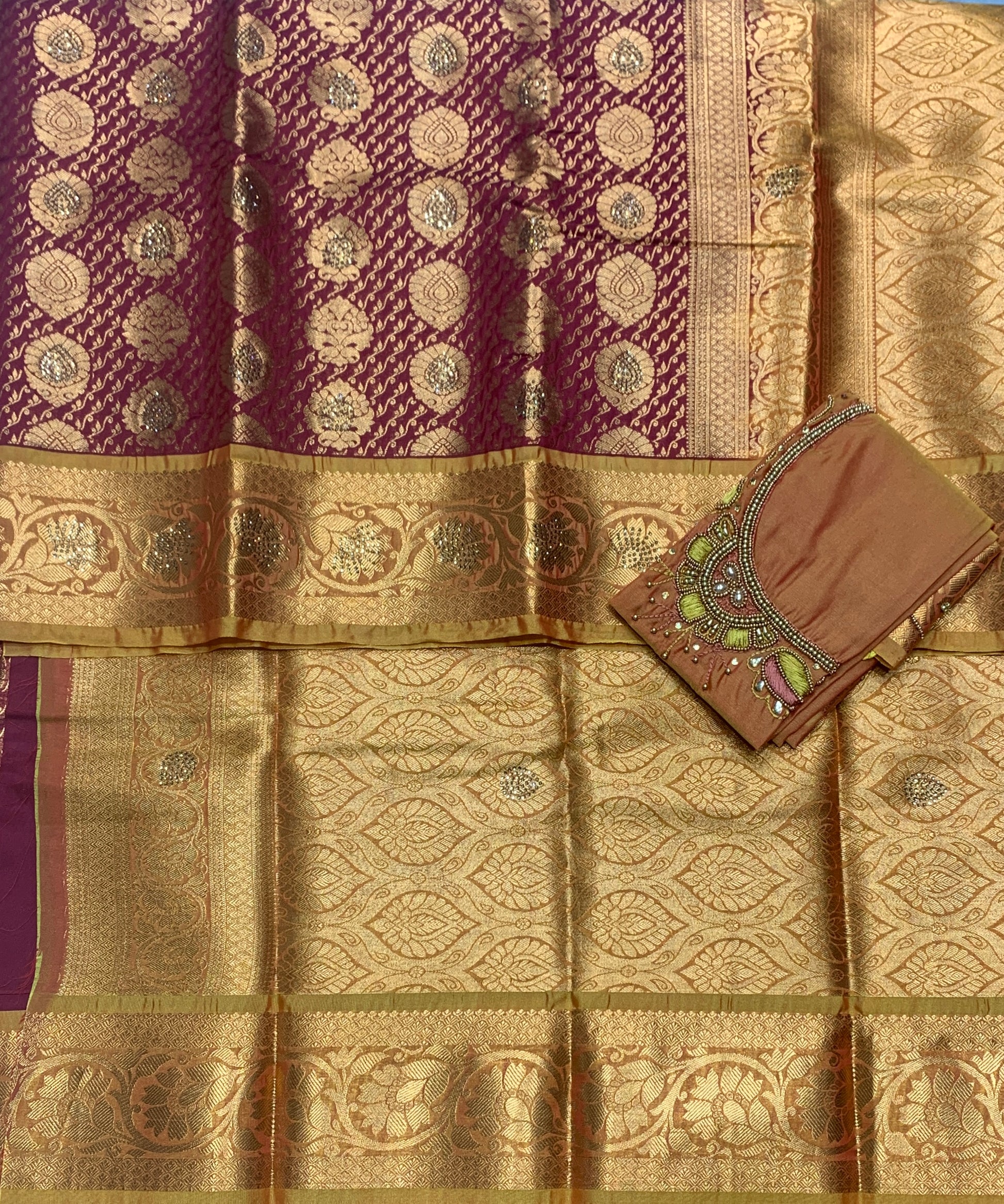 Bridal Vegan Silk Saree Maroon shade with Golden Yellow Border. Unstitched blouse in Aari work.