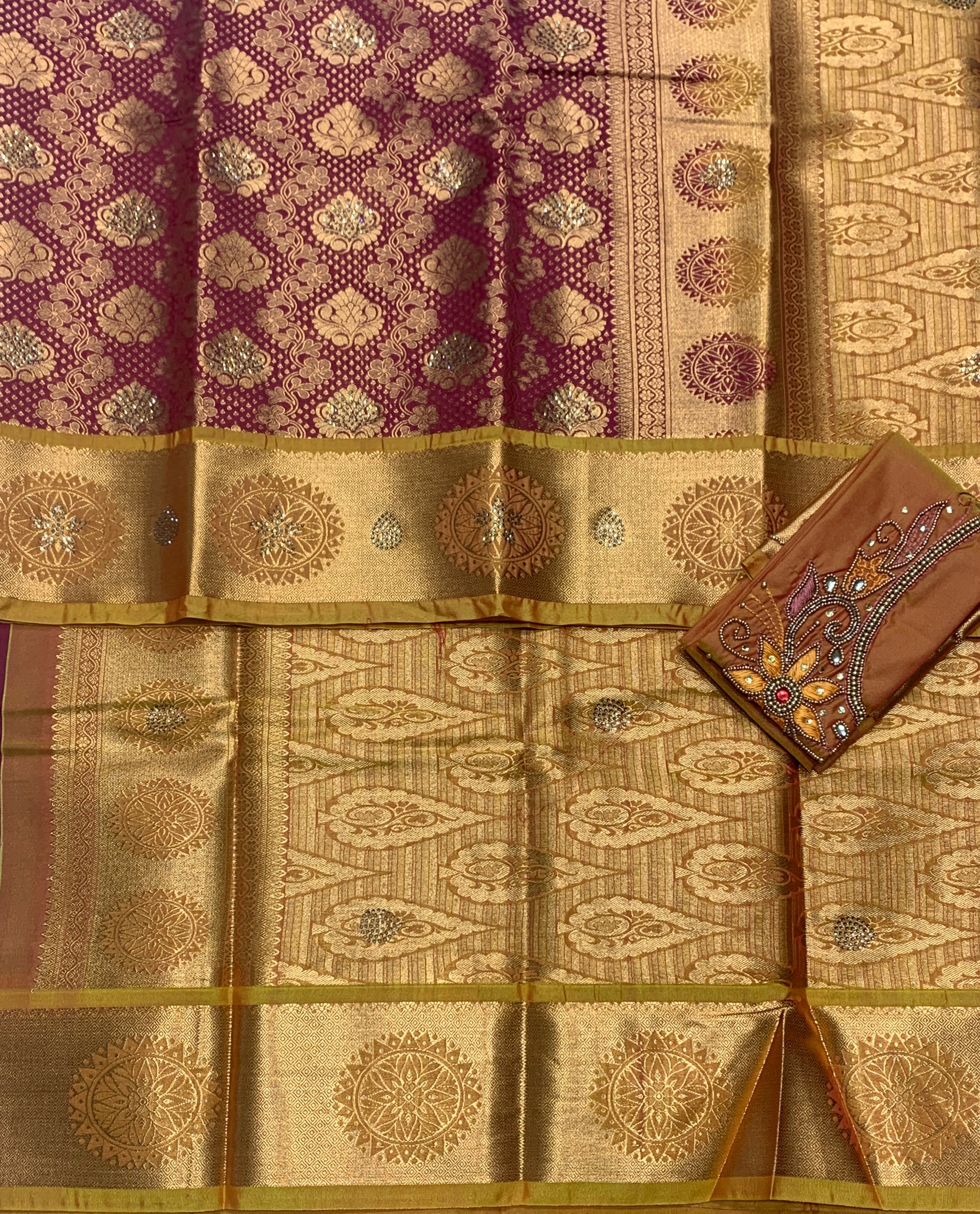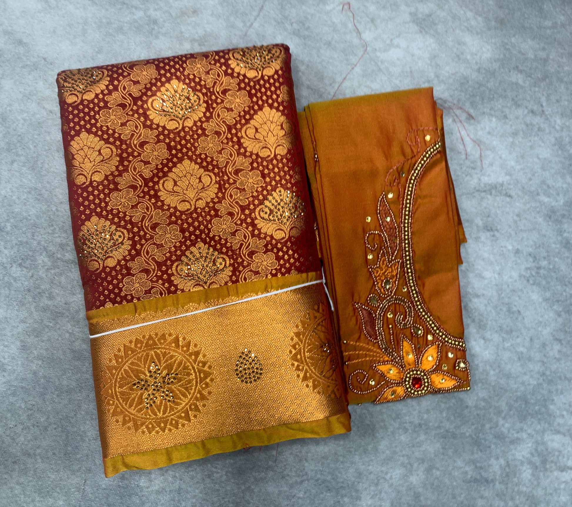 Bridal Vegan Silk Saree Maroon shade with Golden Yellow Border. Unstitched blouse in Aari work.