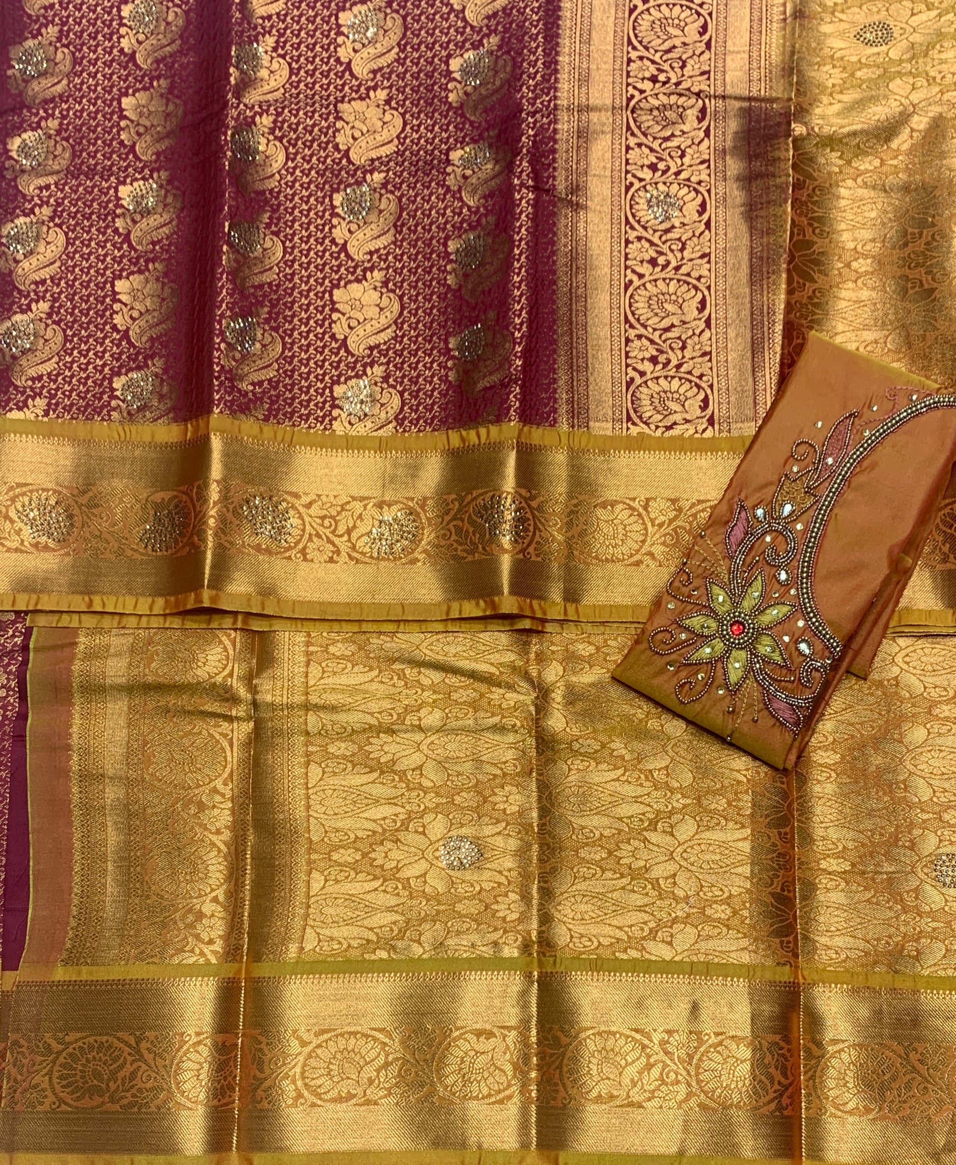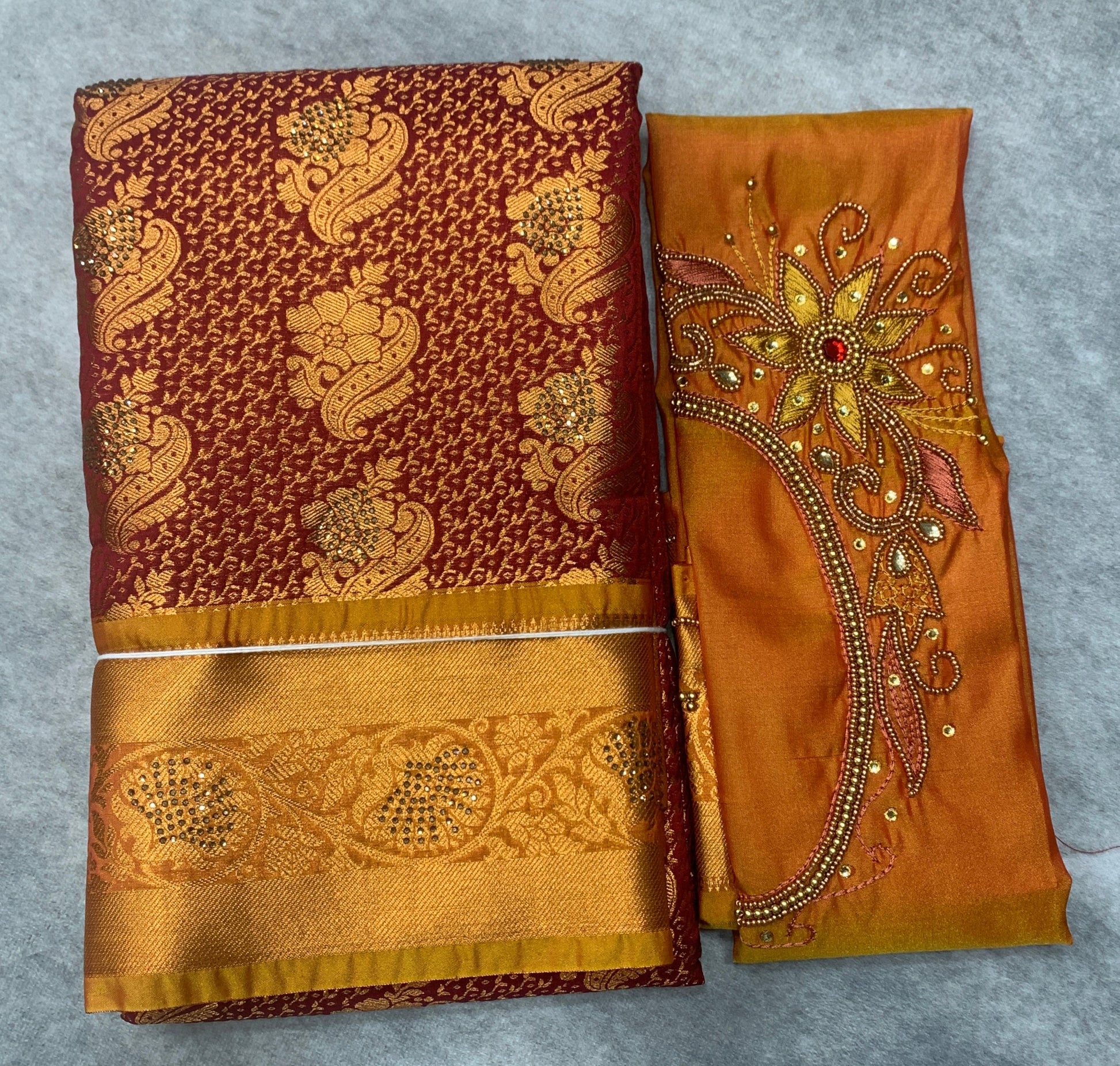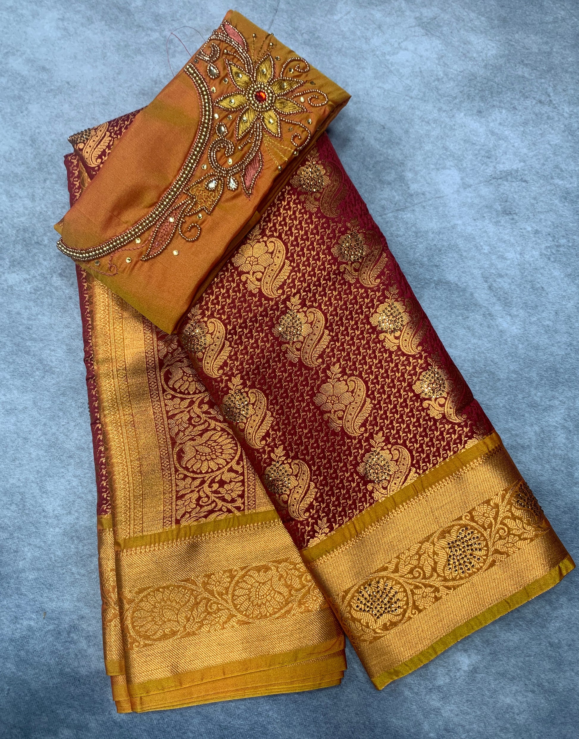 Bridal Vegan Silk Saree Maroon shade with Golden Yellow Border. Unstitched blouse in Aari work.