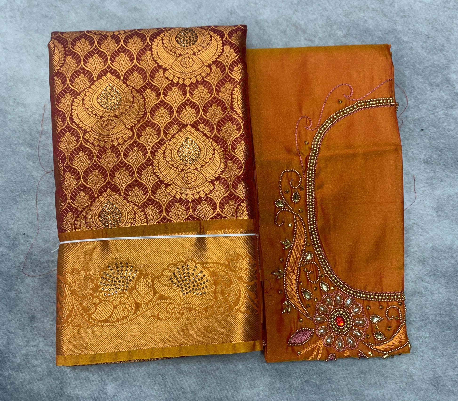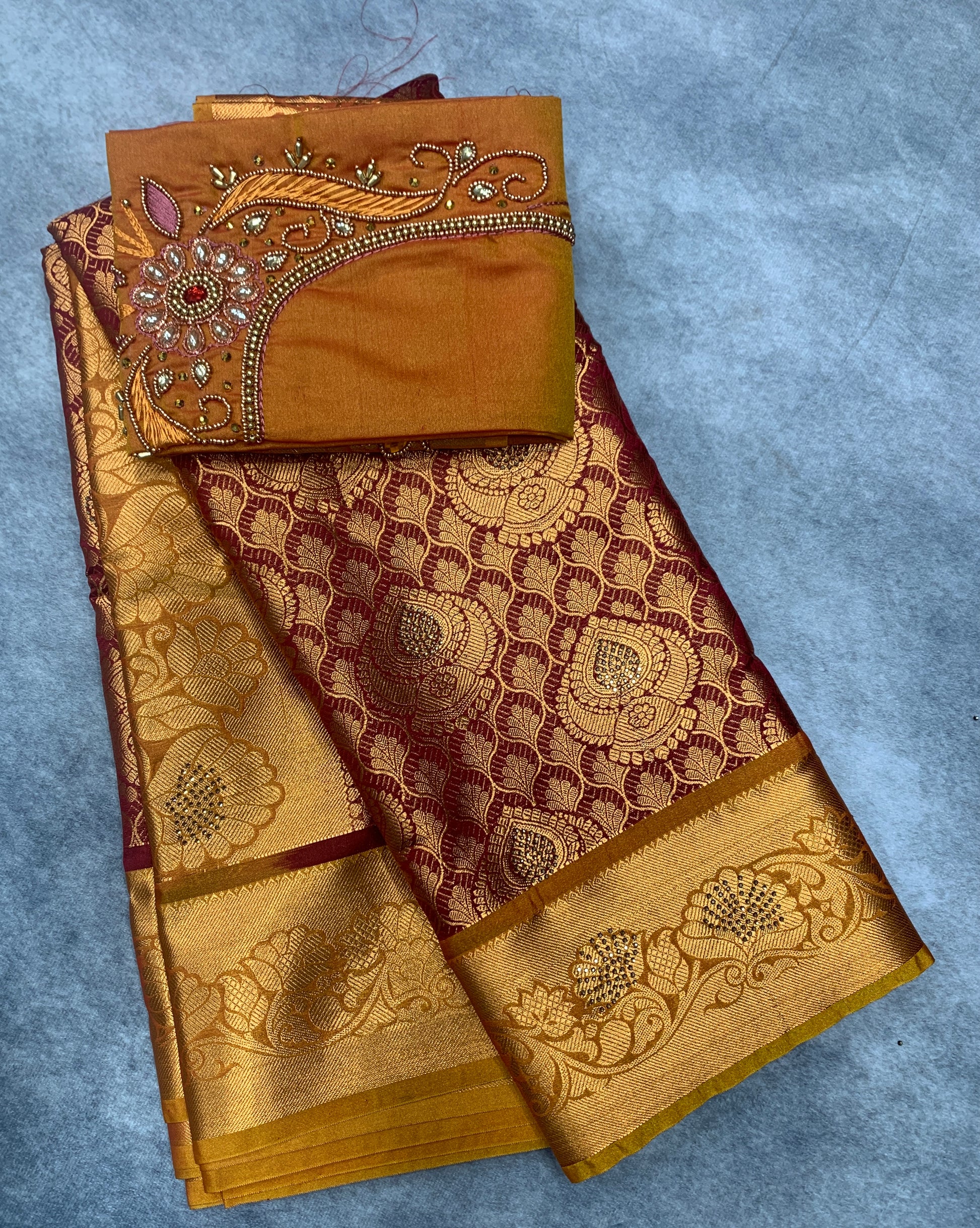Bridal Vegan Silk Saree Maroon shade with Golden Yellow Border with Unstitched blouse in Aari Work