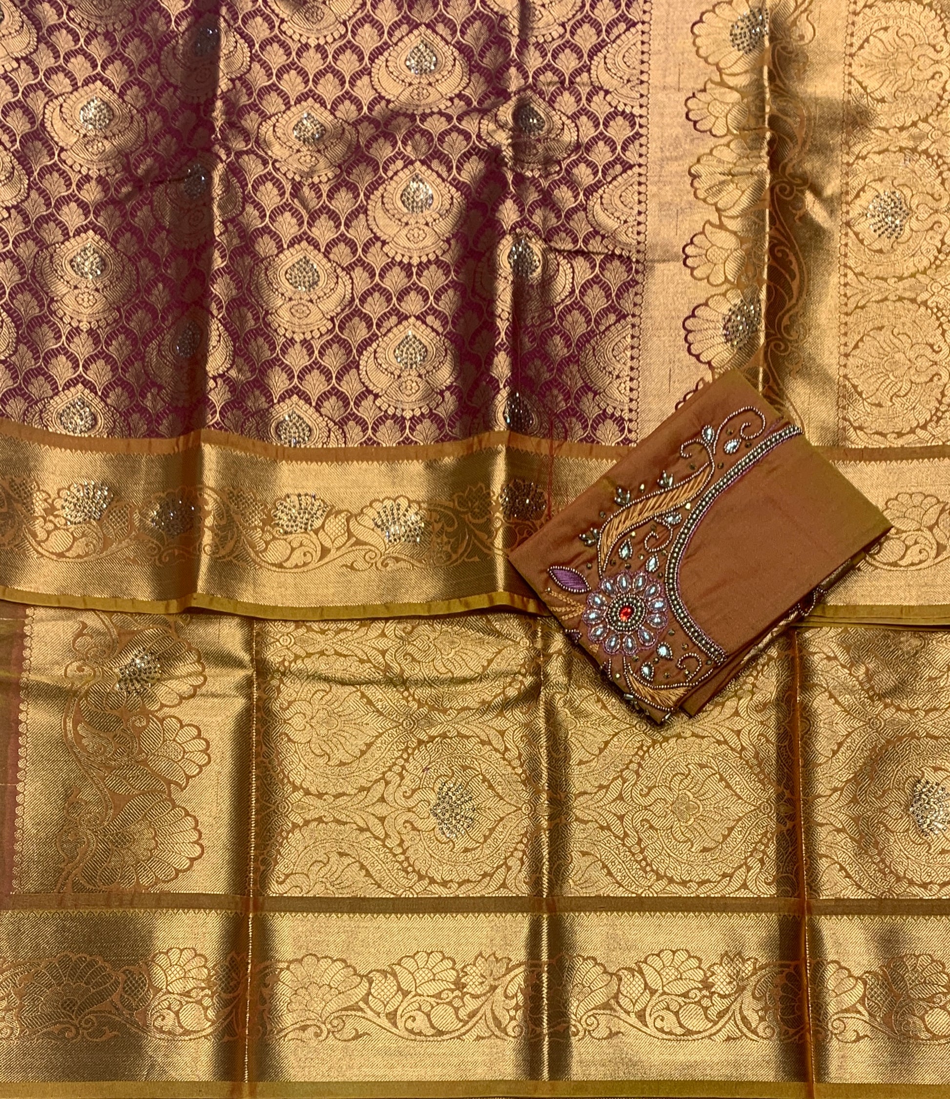 Bridal Vegan Silk Saree Maroon Colour with Golden Yellow Border. Unstitched blouse in Aari work.