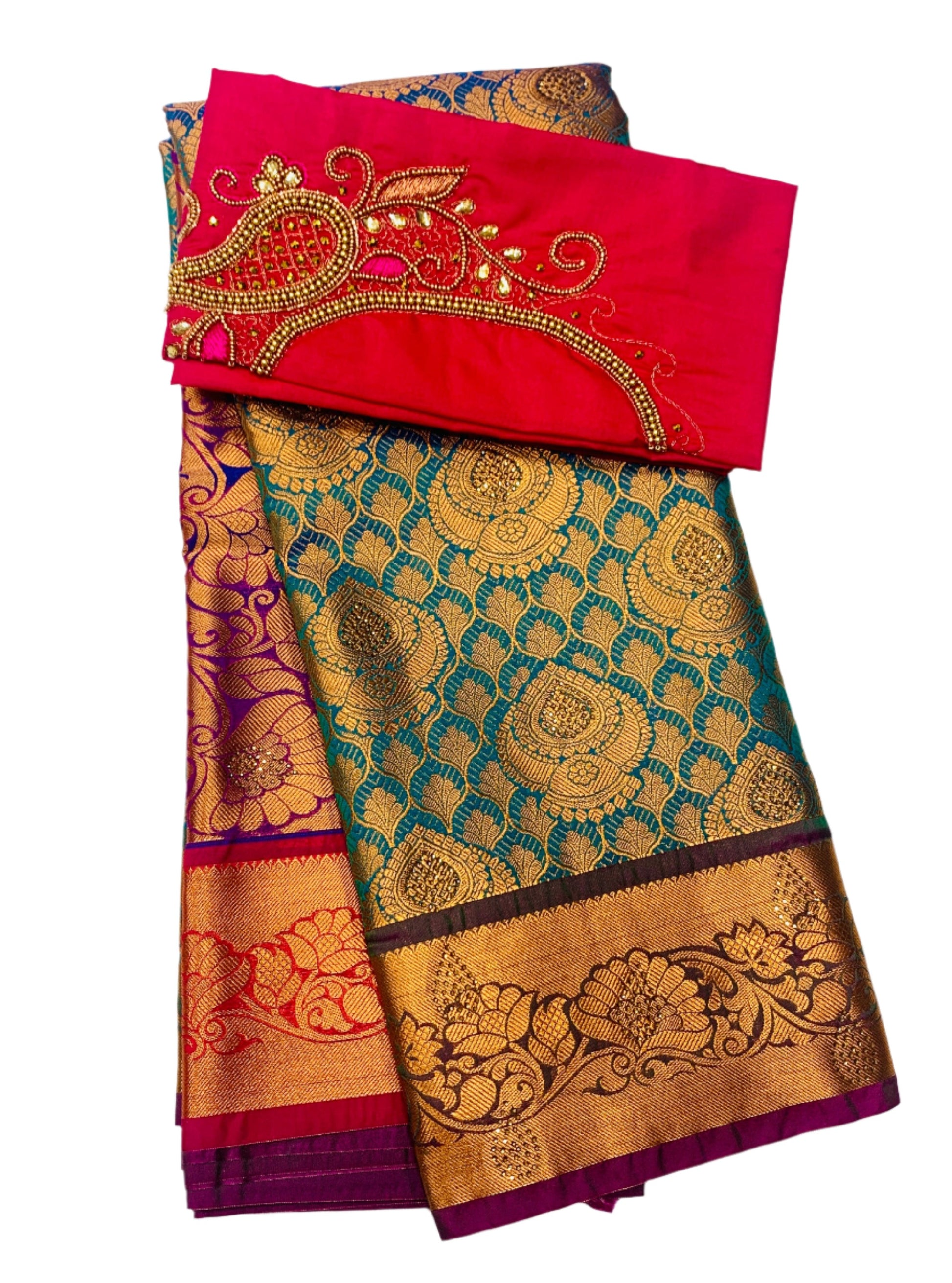 Bridal Vegan Silk Saree Pastel Green Colour shade with Purple Border. Unstitched blouse in Aari work.dry wash only.