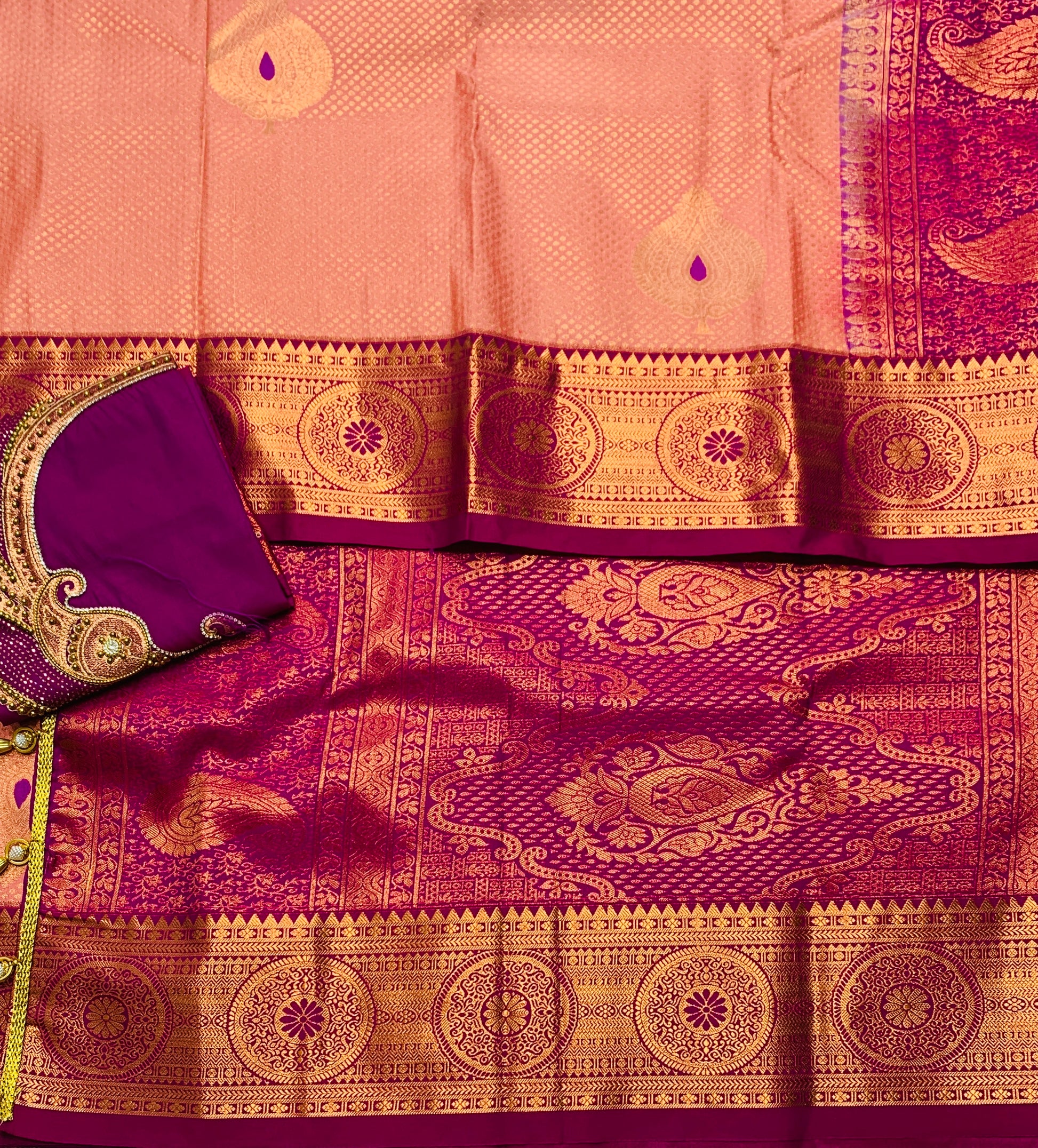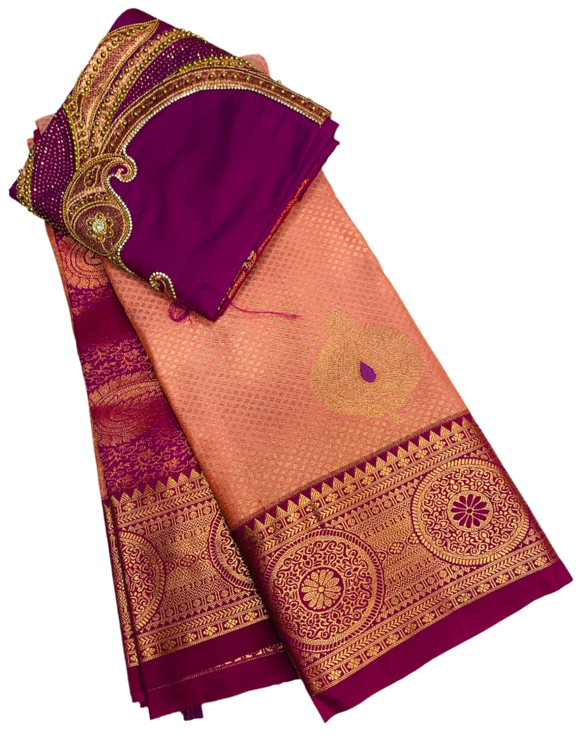 Bridal Vegan Silk Saree Peach Colour with Magenta Border with Unstitched blouse in Aari work.