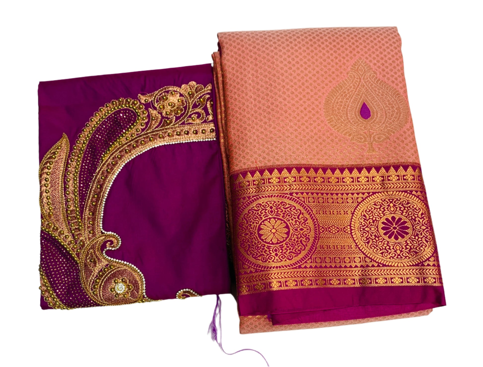 Bridal Vegan Silk Saree Peach Colour with Magenta Border with Unstitched blouse in Aari work