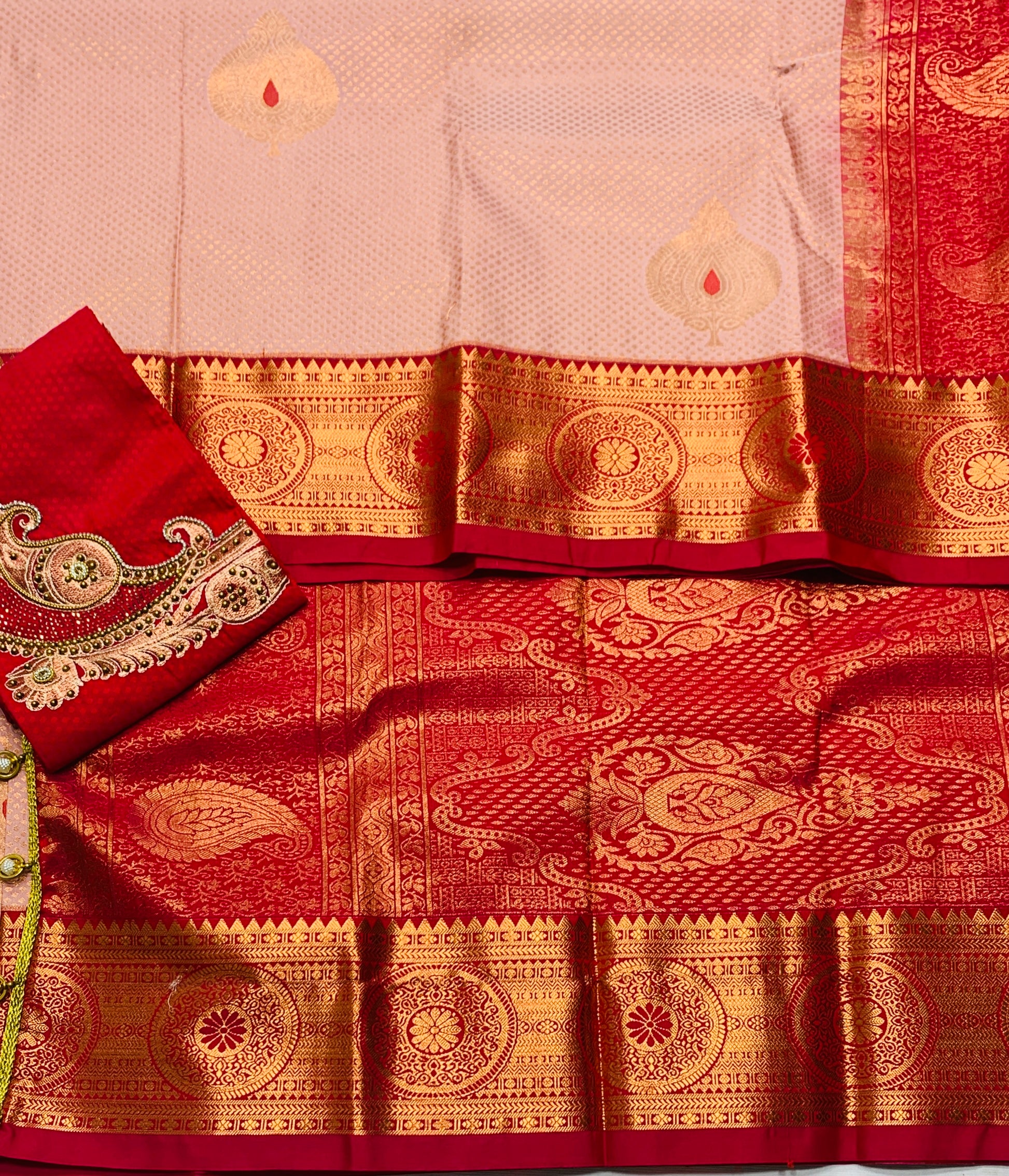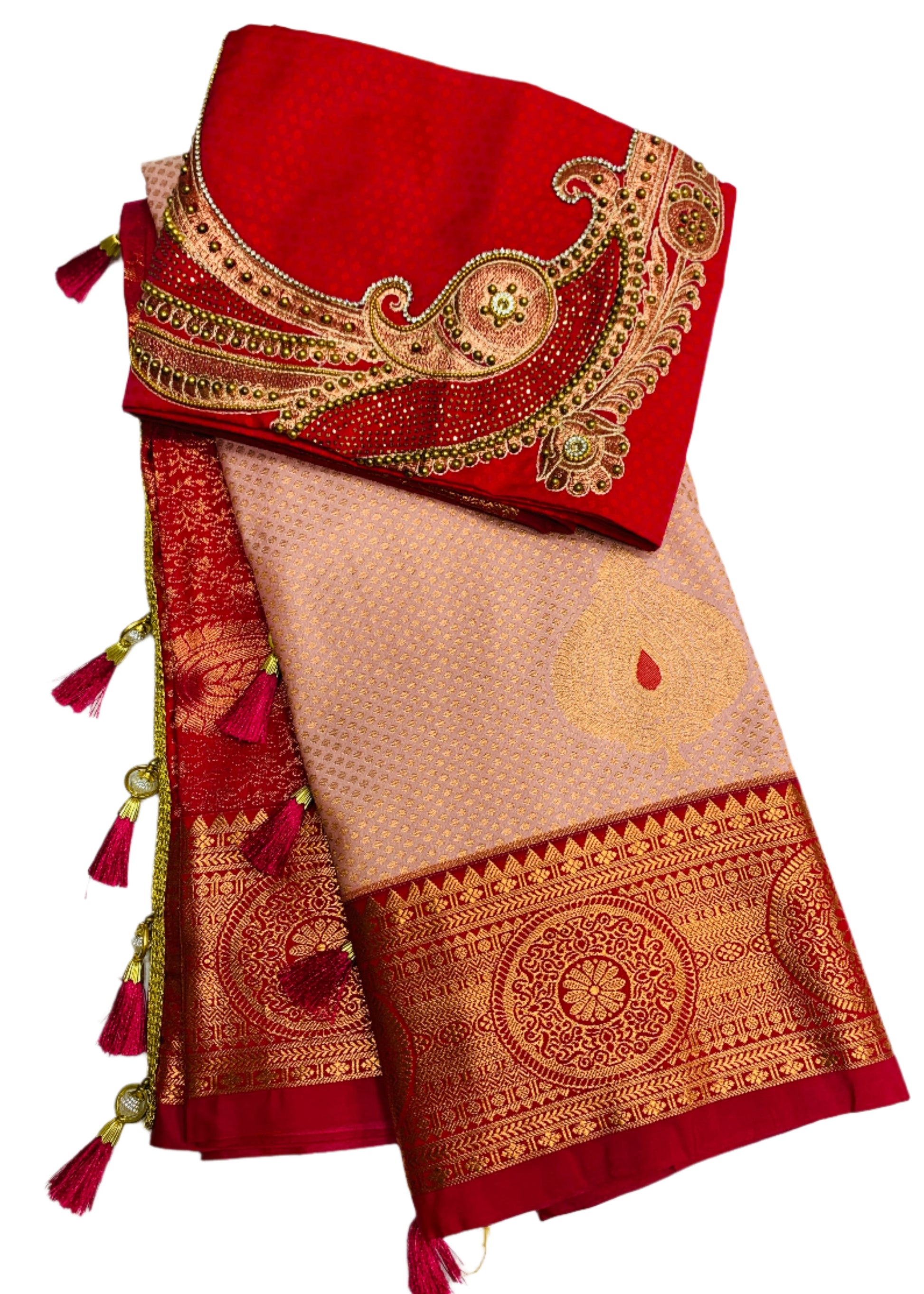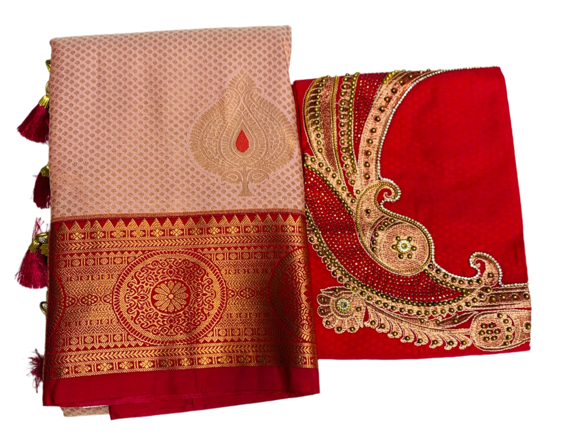 Bridal Vegan Silk Saree Peach Colour with Red Border with Unstitched blouse in Aari work.