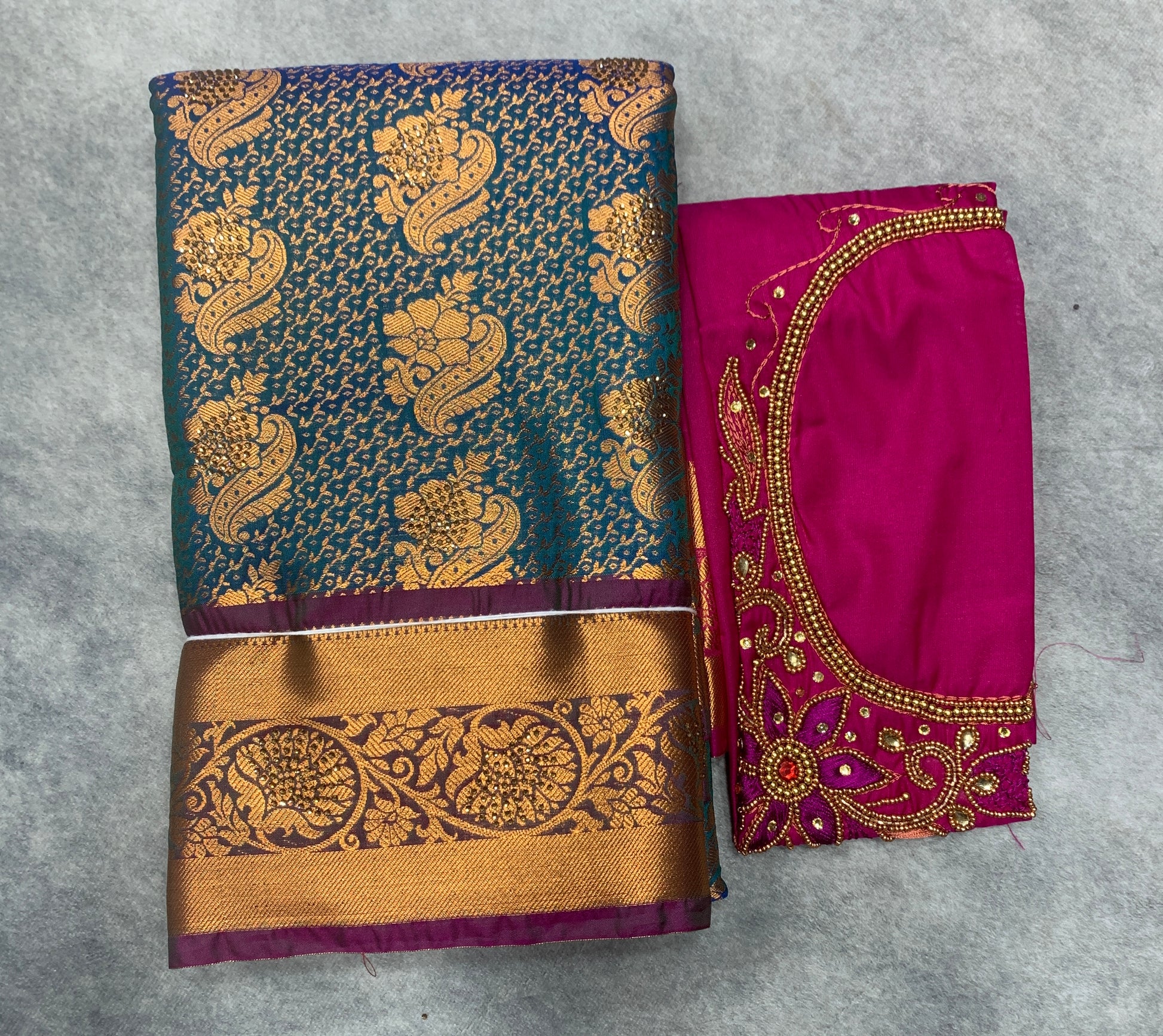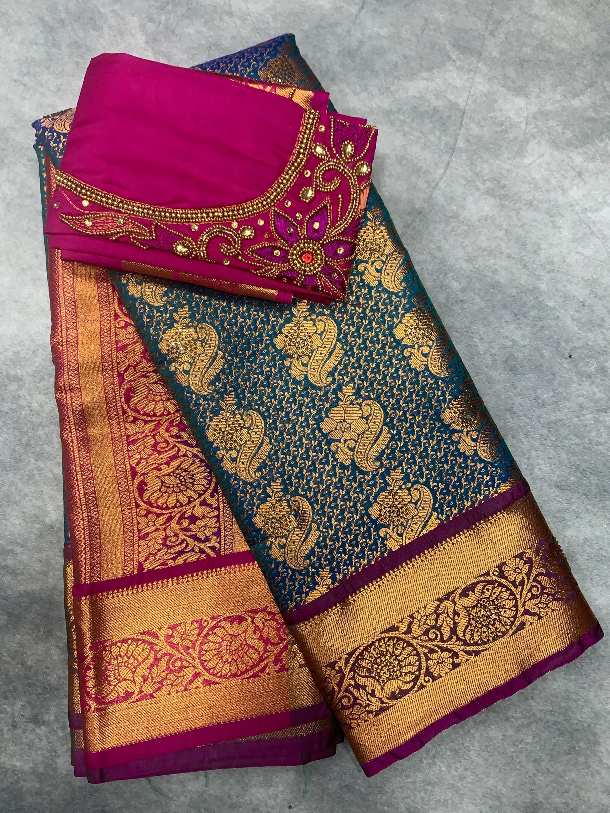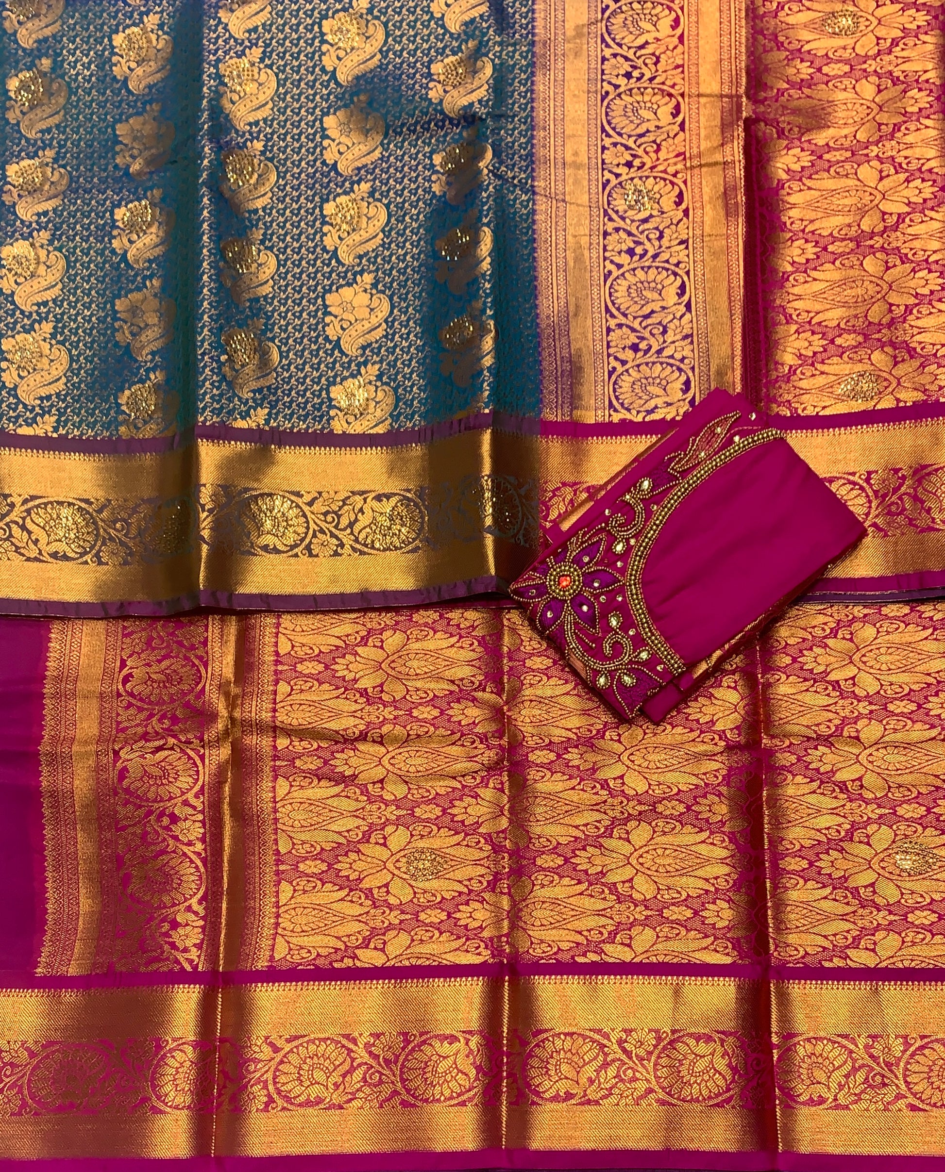 Bridal Vegan Silk Saree Peacock Blue shade with Purple Border with Unstitched blouse in Aari Work