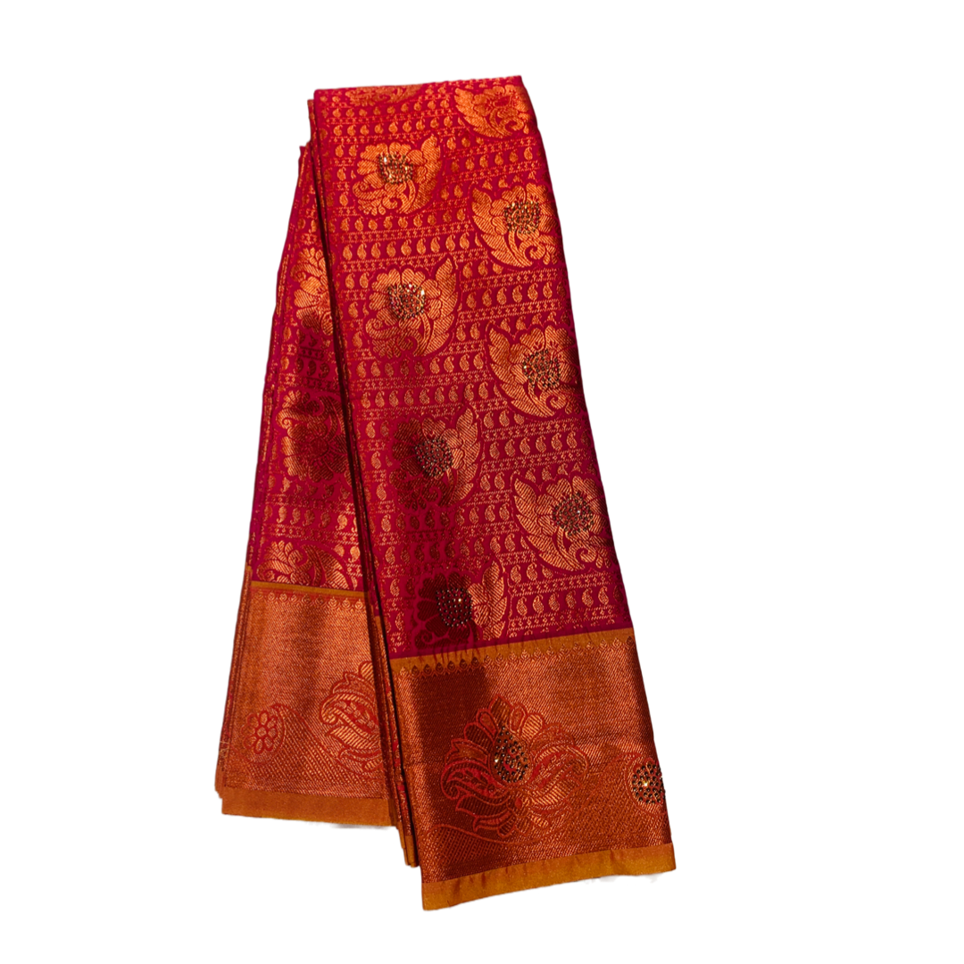 Bridal Vegan Silk Saree Pink Colour with flower design. Copper Border with Flower design. Dry wash only.