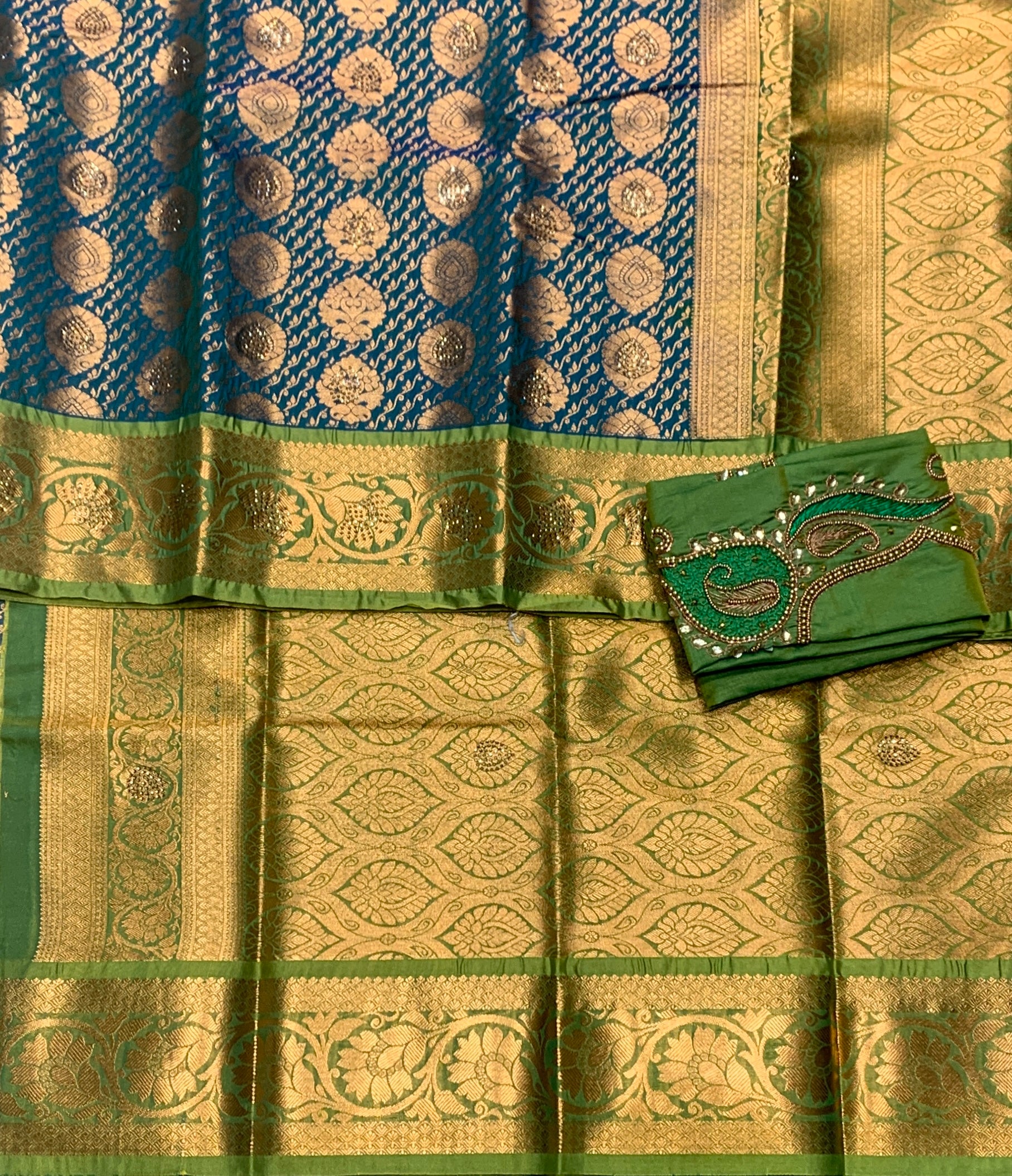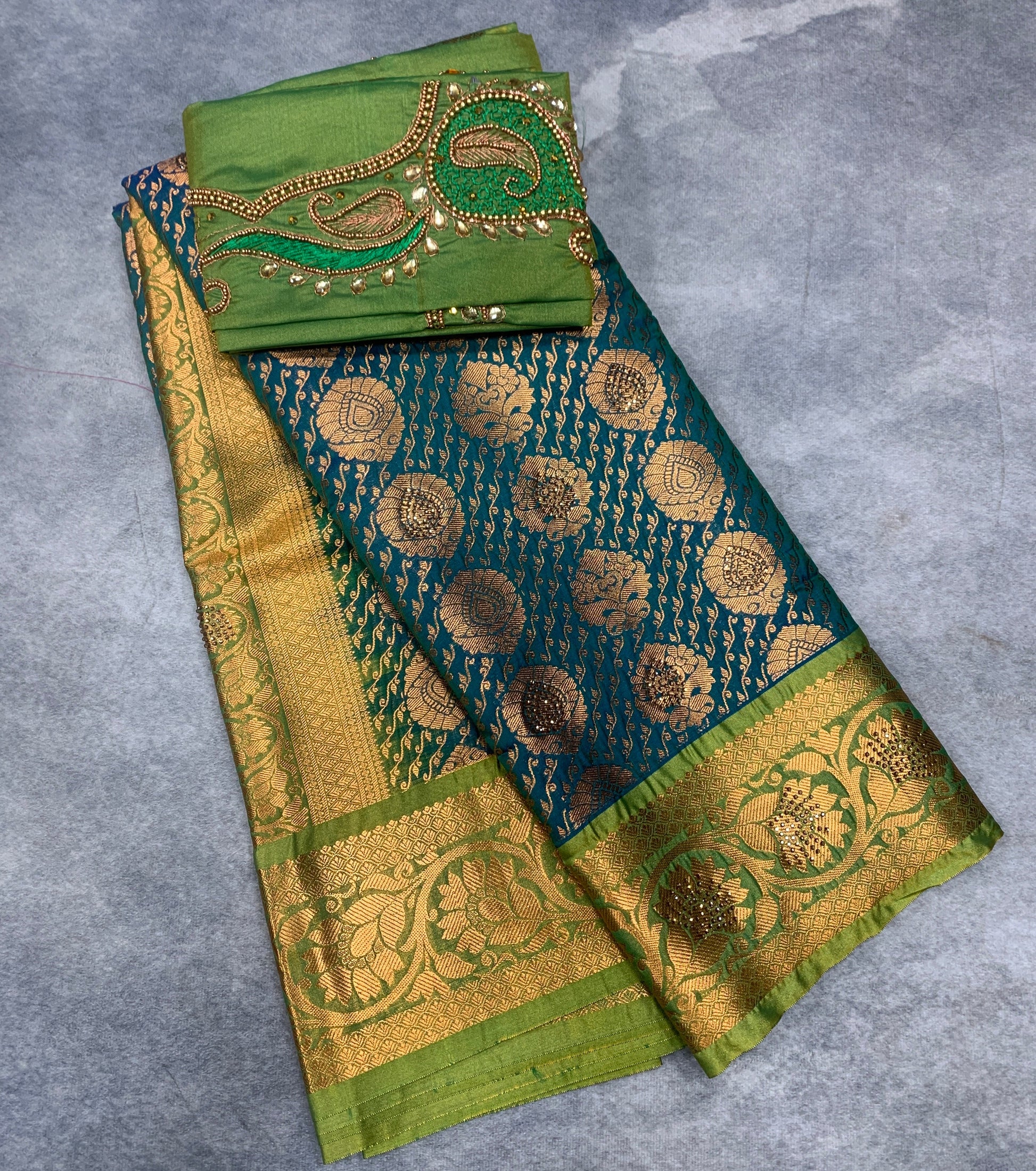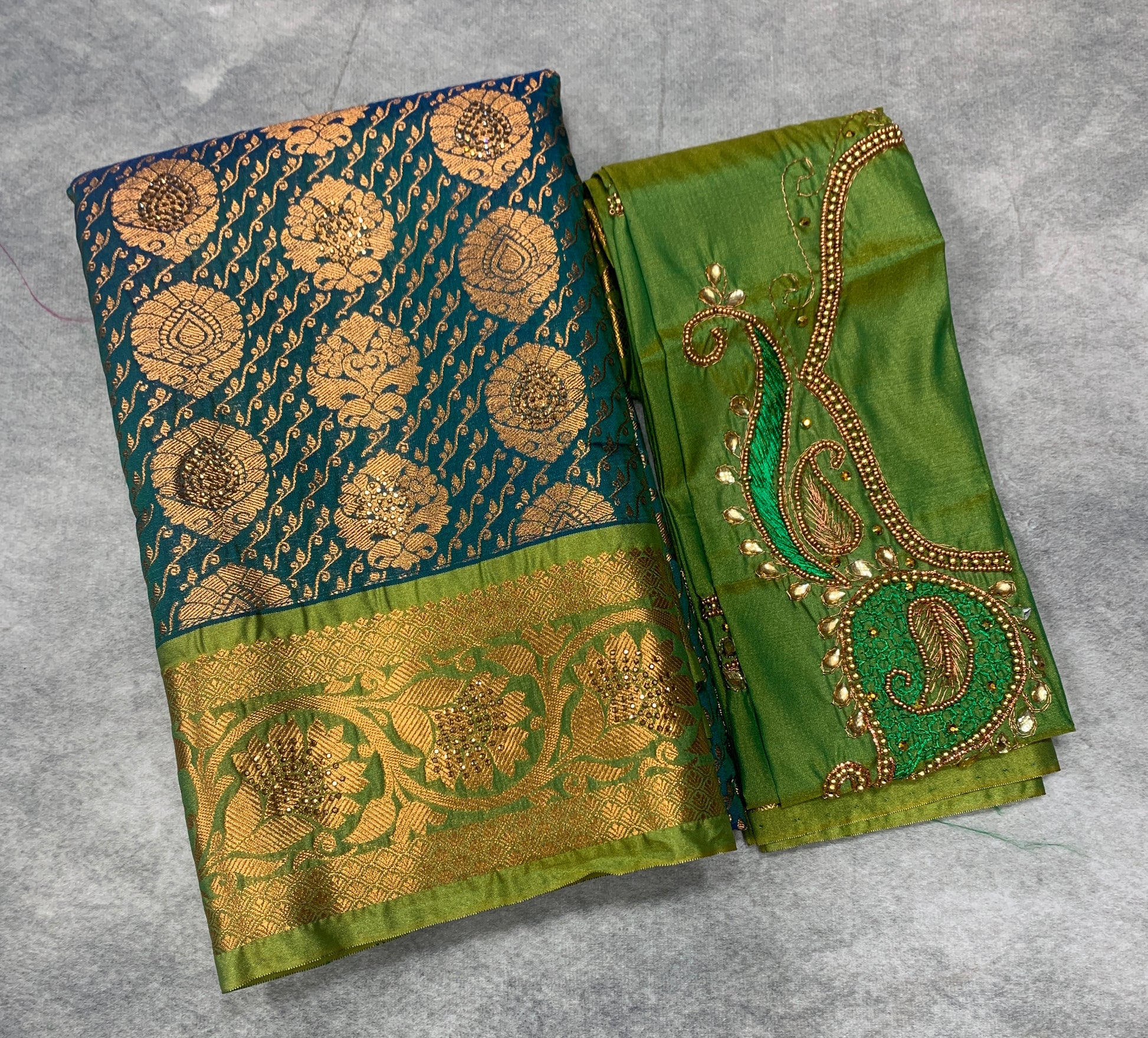 Bridal Vegan Silk Saree Rama Green shade with Light Green Border with Unstitched blouse in Aari Work