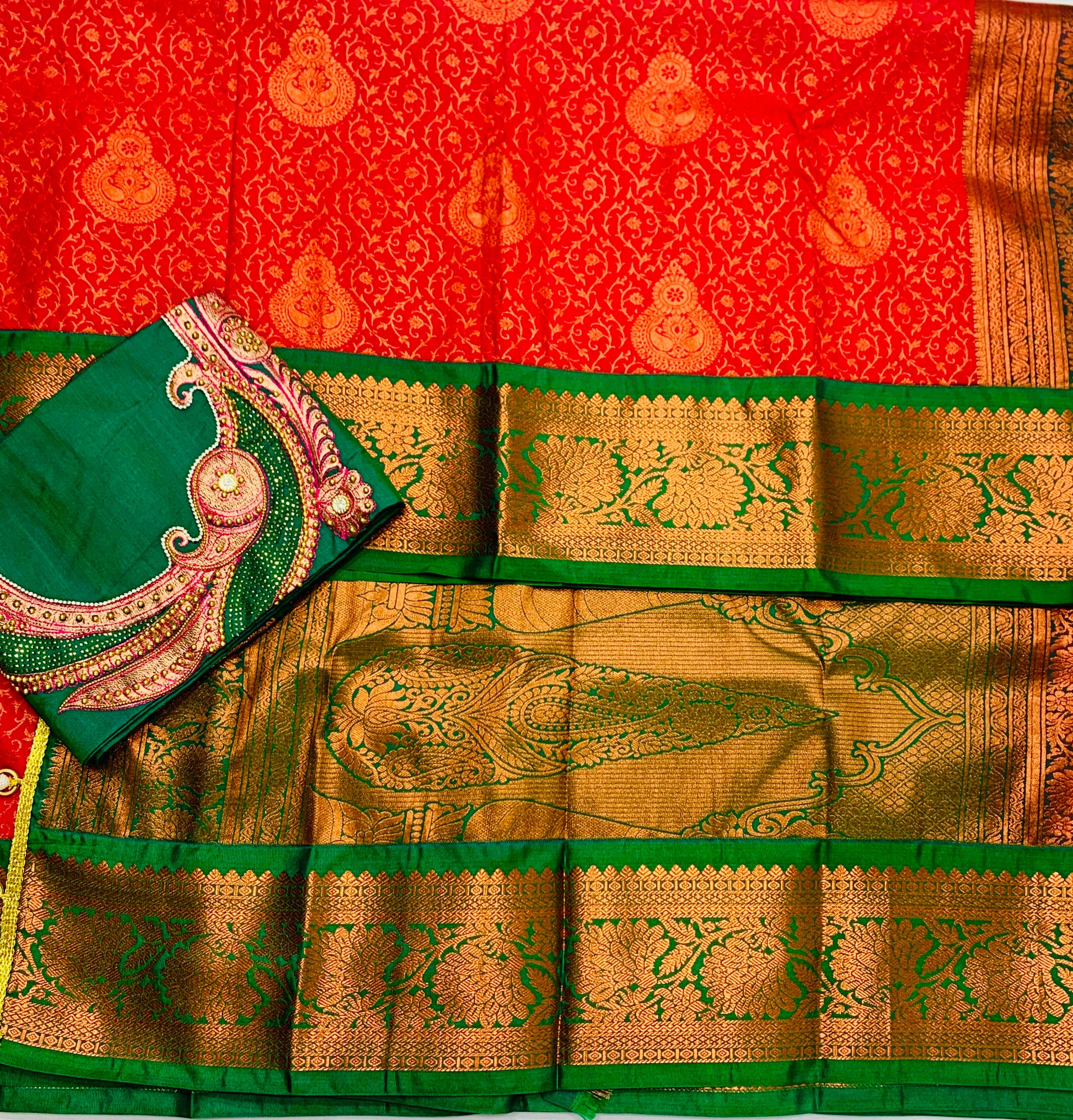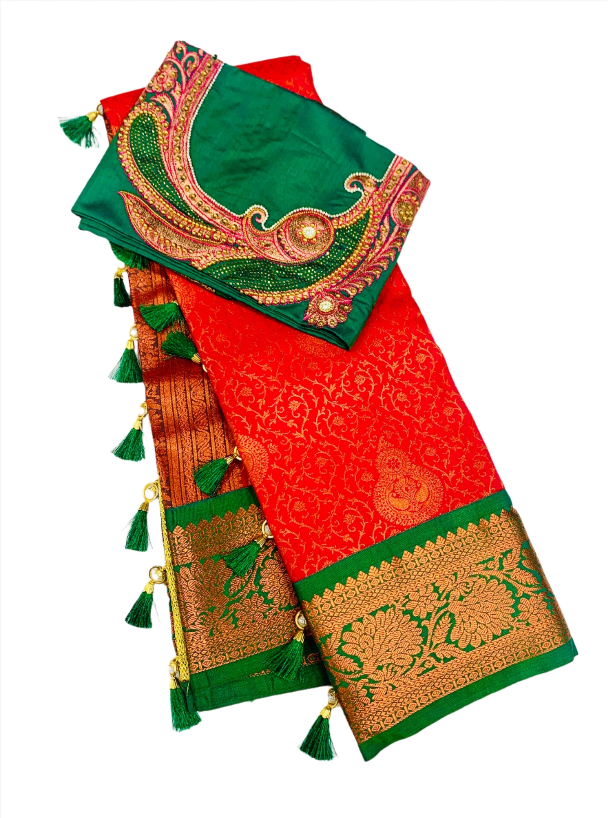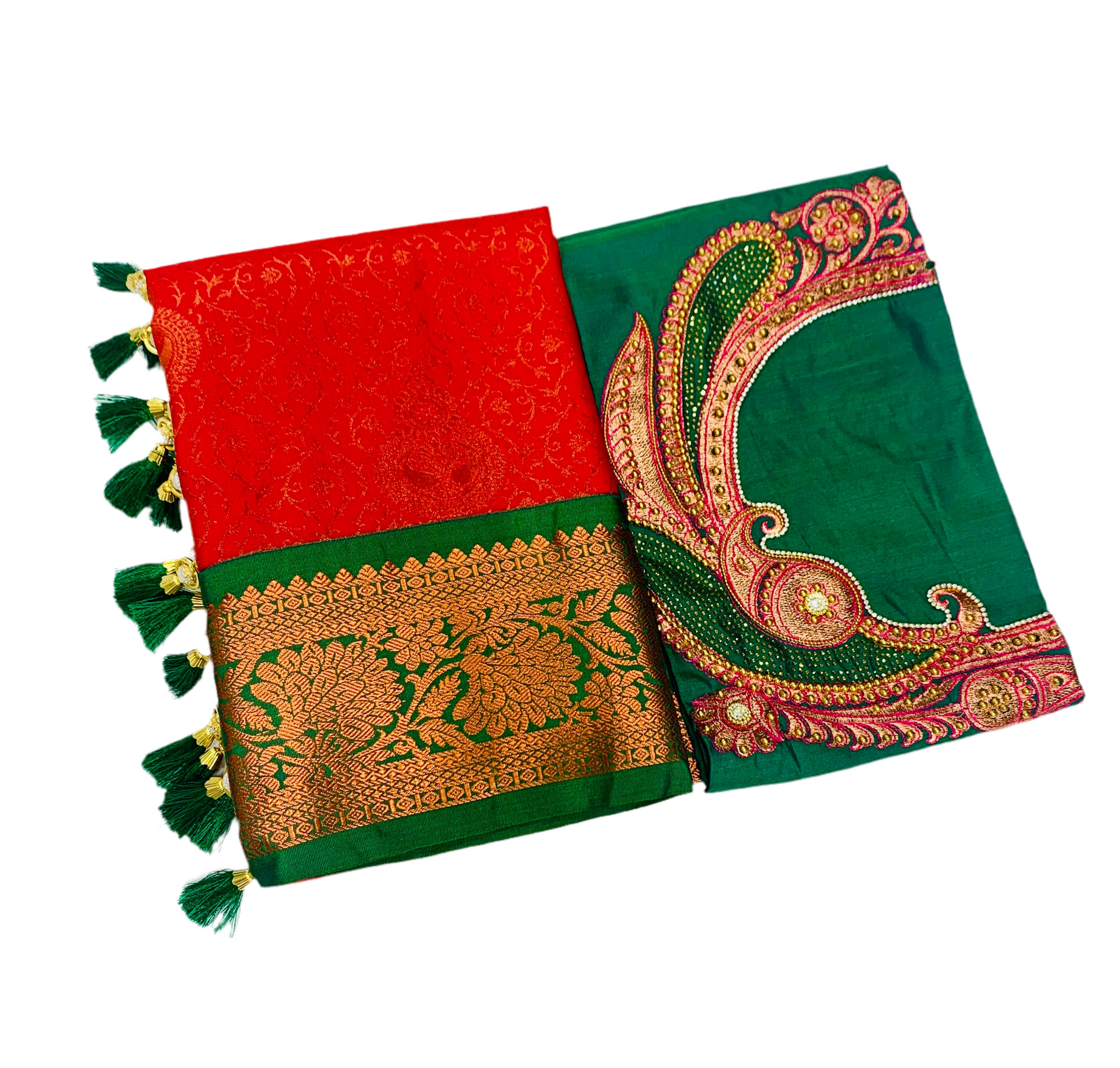 Bridal Vegan Silk Saree Red shade with Green Border with Unstitched blouse in Aari work